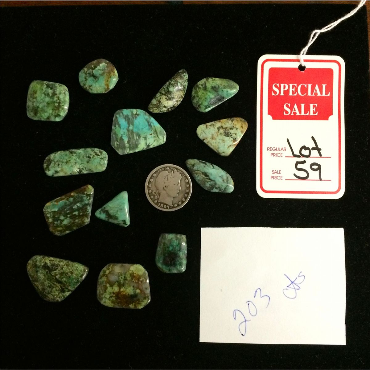 Commonly called “African turquoise,” this beautifully colored green jasper weighs 203 carats and consist of 13 free-form cabochons ready for your use.