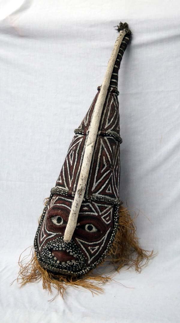African Woven Raffia Mask . Hand Painted this large woven mask measures approx. 30'' x 12''.