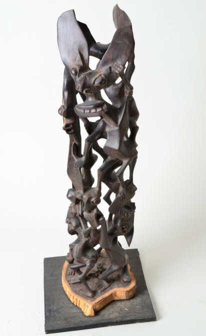 African tribal carving approx. measuring 35” mounted on base (not included in measure) approx. 10” thick. Pierced and hollowed out carving with figures of demonic bat figured men. Good carving shows some age. From theRobert E. Peterson Estate. Est.; $600-$1,200