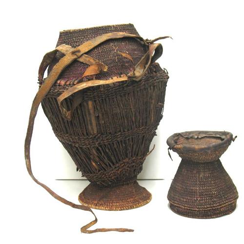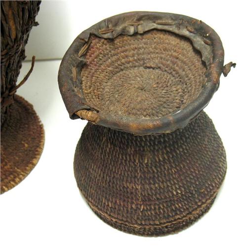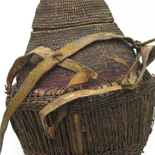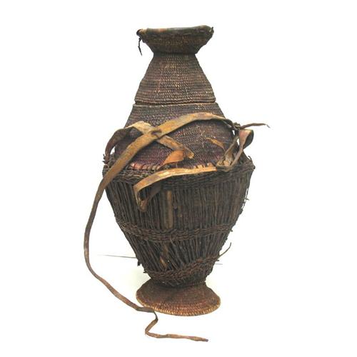 African water basket with fitted lid; leather straps for carrying; late 19th to early 20th C.; 19 1/2" high x 11" diameter; some loss