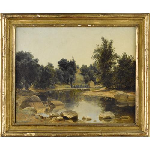 <B>After ASHER B. DURAND</B></I> (Early Twentieth Century)<BR><I>River Stream</B></I><BR>Oil on canvas<BR>17 x 21 inches (43.2 x 53.3 cm)<BR>Unsigned<BR><BR> <B>Condition Report:</B> wax lined<BR><BR><b>Shipping:</b> Requires 3rd Party Shipping (<a target="_blank" href="http://www.heritageauctions.com/common/shipping.php">view shipping information</a>)