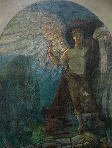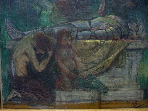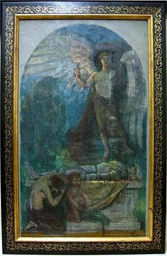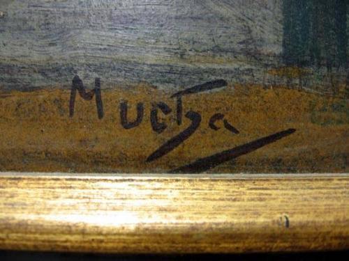 After (Alphonse) Mucha oil on board; allegorical; three figures; signed (L.R.); framed; French 1860-1939; image size 28" x 17" (no visible defects)