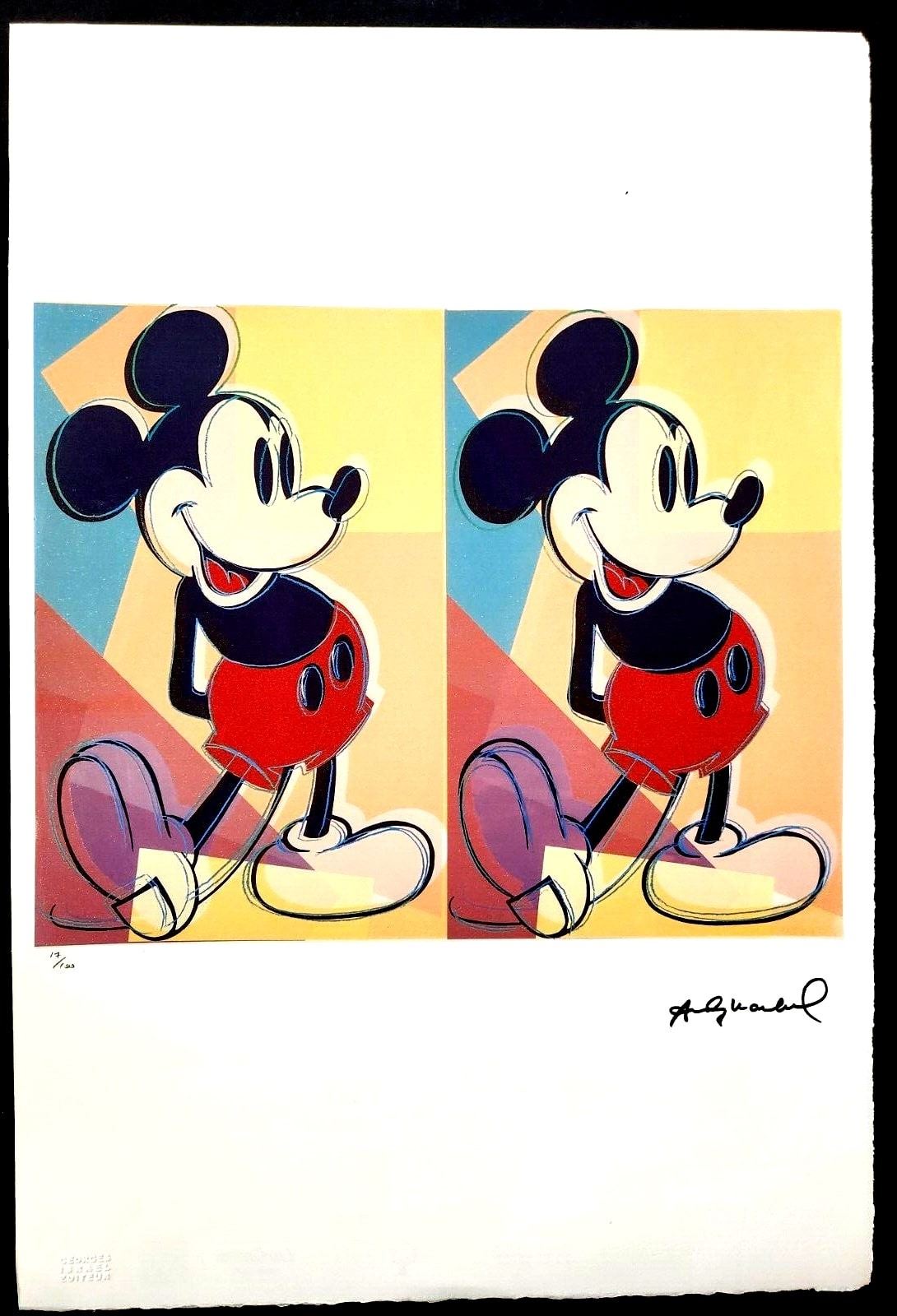 A limited edition screenprint numbered out of 100 of Mickey Mouse edged in pink to a yellow ground, facsimile within the print, 'Leo Castelli' stamps verso, and blind stamp 'George Israel Editeur', 56 x 38cm.