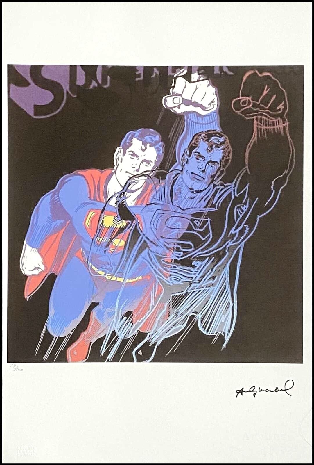 A limited edition screenprint numbered out of 100 of Superman, facsimile within the print, 'Leo Castelli' stamps verso, and blind stamp 'George Israel Editeur',