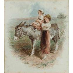After Birkett Foster watercolour, Mother and child riding a donkey, monogrammed, 4.5 x 4 ins. £100-150