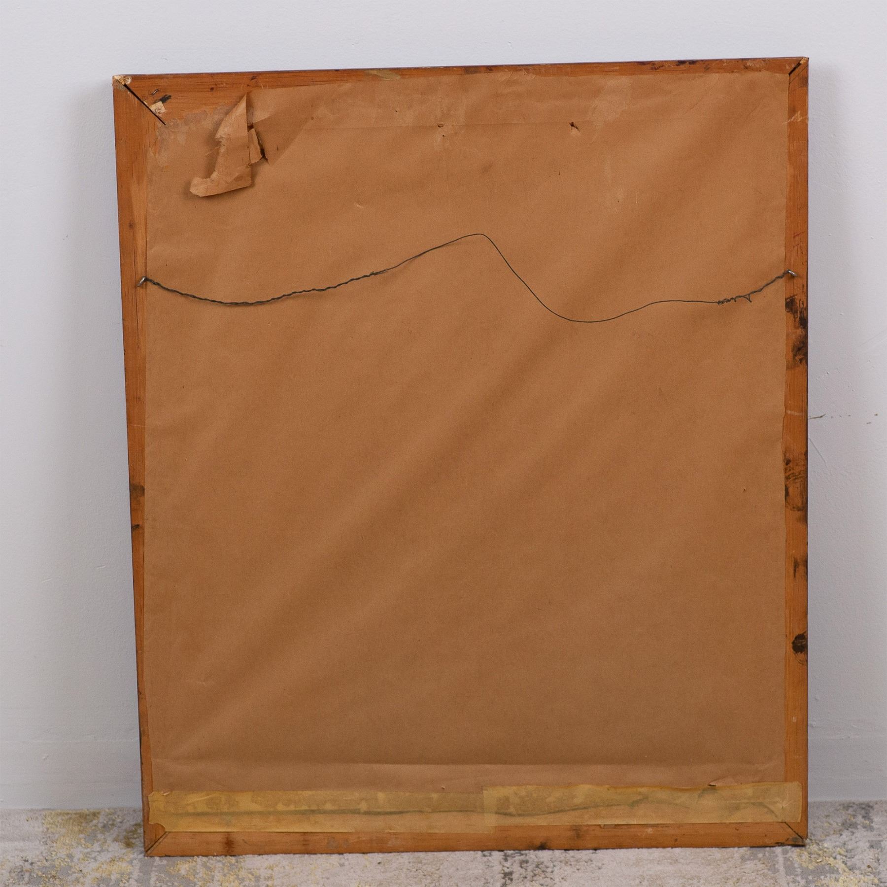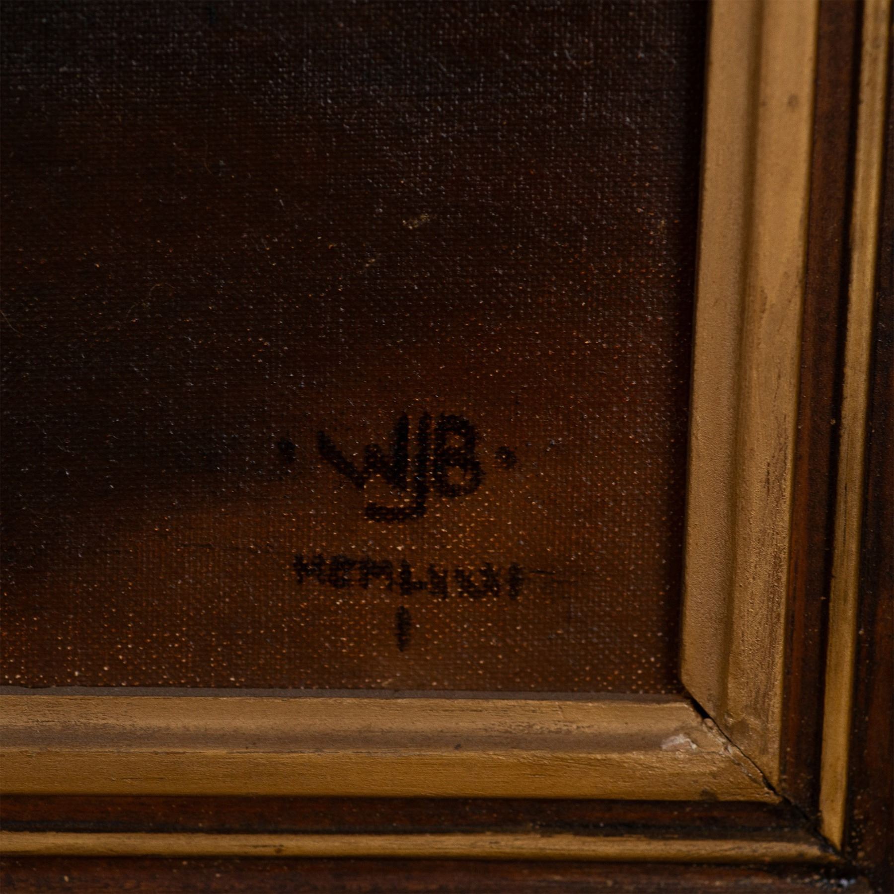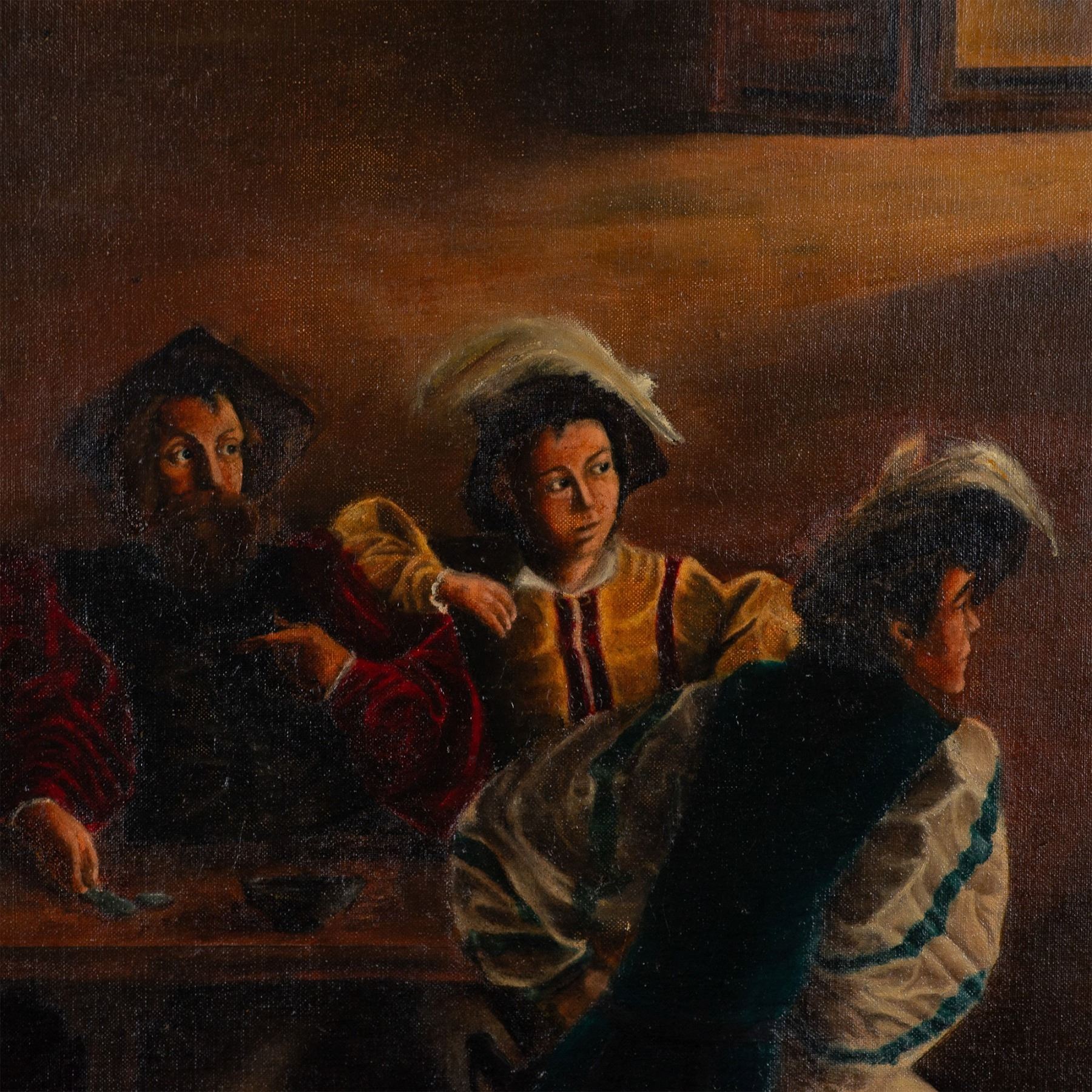 This evocative original oil on canvas was painted after Italian painter Caravaggio's The Calling of St Matthew, originally commissioned for the Contarelli Chapel in Rome. Set in a dimly lit tavern, the interplay of light and shadow exemplifies Caravaggio's pioneering use of Tenebrism and chiaroscuro, which this piece replicates. Reproductions of Caravaggio's works gained popularity during the 19th and 20th centuries, when art enthusiasts sought to study and appreciate his contributions to Baroque art. This reproduction is a testament to Caravaggio's enduring influence and the timeless appeal of his masterpieces. Signature on lower right: WJB, illegible. Artwork dimensions: 19"L x 23.50"H. Frame dimensions: 24"L x 28"H x 1.50"W.