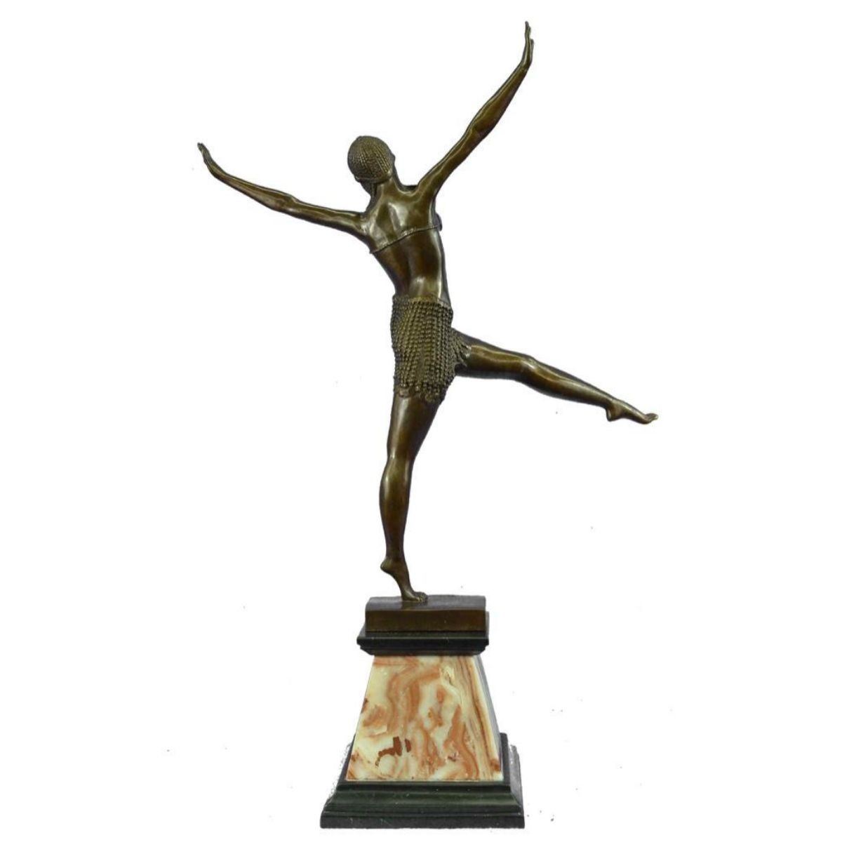 After Demetre Chiparus ( Romania, 1886 - 1946 ) Art Deco Dancer bronze sculpture. Lost wax casting bronze, mounted on marble & bronze pedestal. 24" H X 17" W. 16lbs.