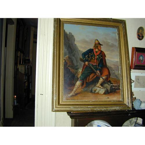 It is our pleasure to offer a painting that has been attributed to being of the style of Cornelius Krieghoff. It portrays a hunter in quasi-aboriginal garb in a mountinous setting.