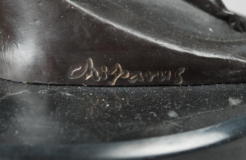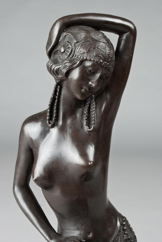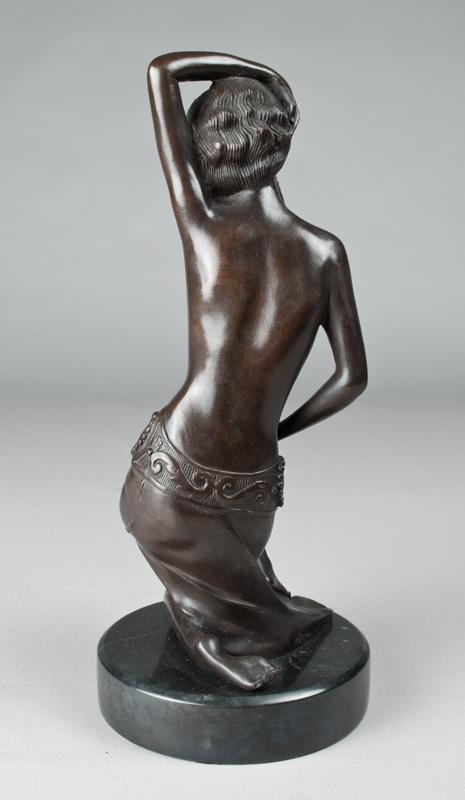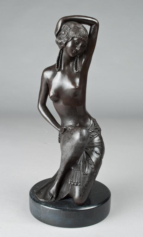 Bronze depicting a half nude female art deco dancer kneeling and with hand over her head, attached to marble base. 12.75" H x 6" W, signed in back.