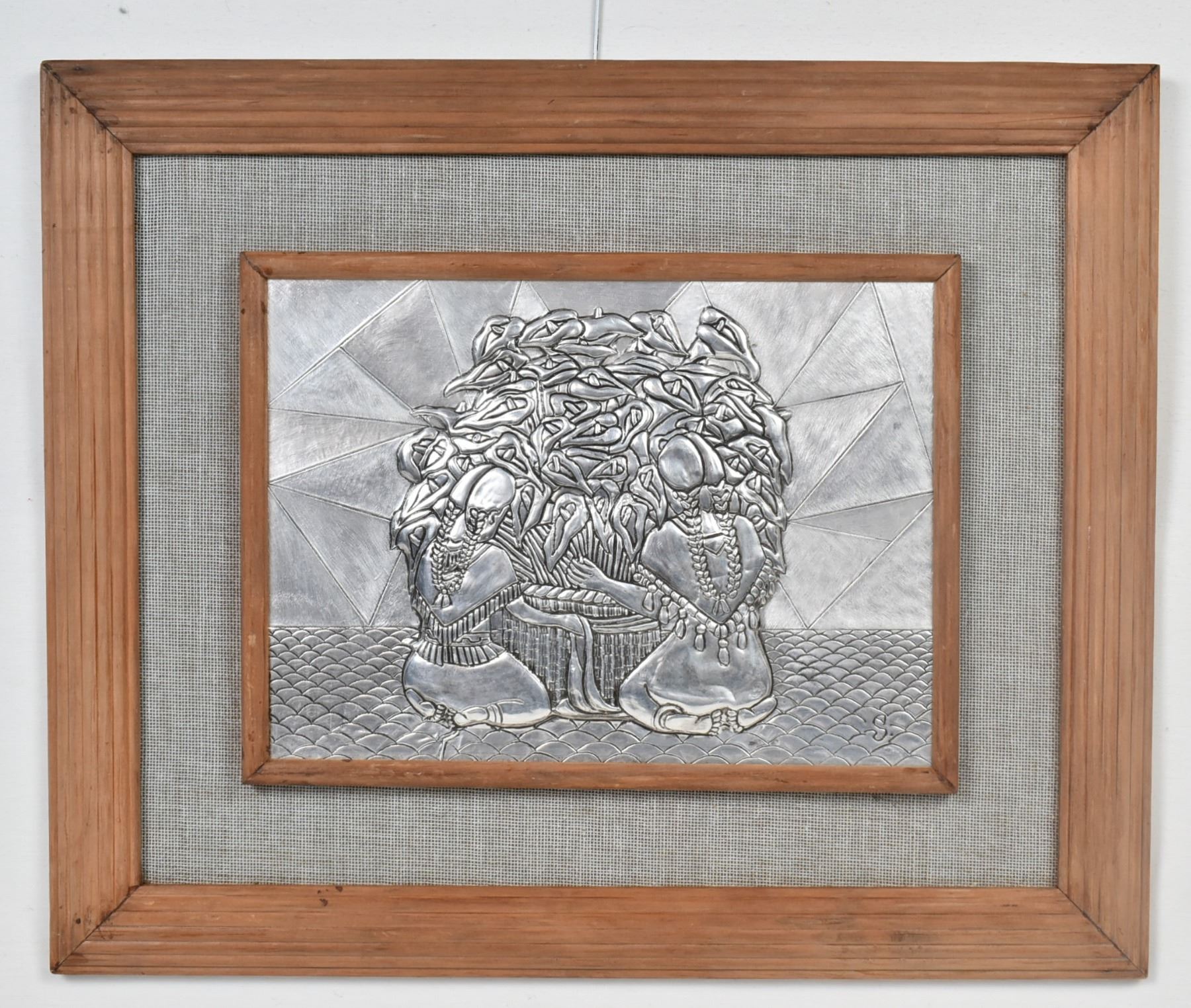 After Diego Rivera Metal Repousse' Picture, overall framed measurement 19.75'' x 16'', depicts 2 Mexican maidens with calla lilies
