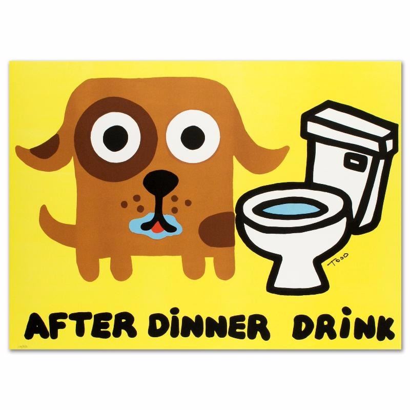 Pop artist Todd Goldman is known all across the globe for his whip-smart and wickedly funny puns and pictures! "After Dinner Drink" is a limited edition lithograph on paper, numbered and hand signed by Todd. Includes Certificate of Authenticity! Measures approx. 28.5" x 21" (no border). Retail Price $750. PRICE INCUDES FREE SHIPPING IN THE U.S. - SHIPPING WILL BE ADDED TO YOUR INVOICE FOR ALL BUYERS OUTSIDE OF THE U.S.