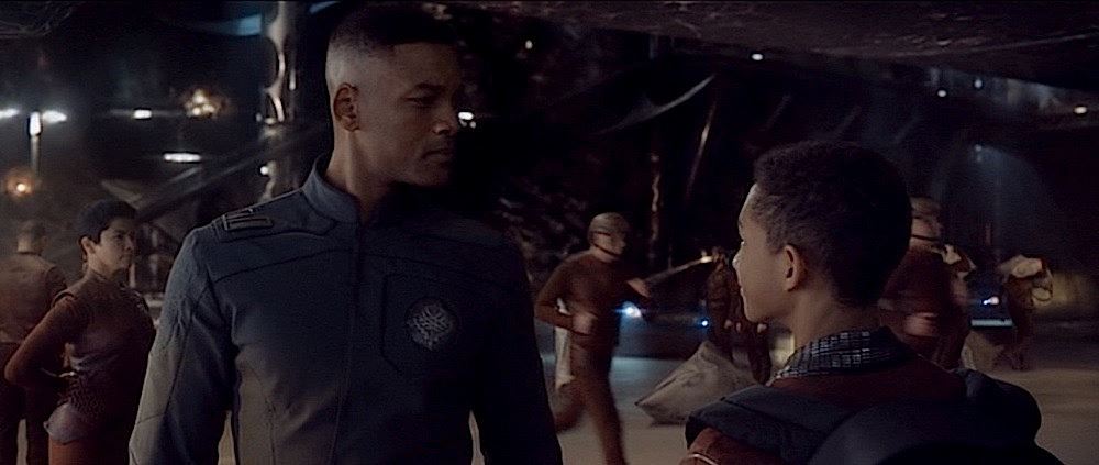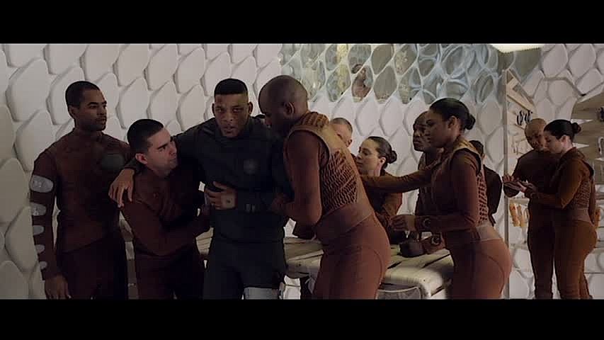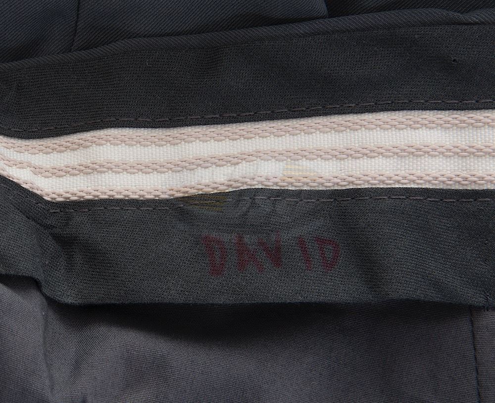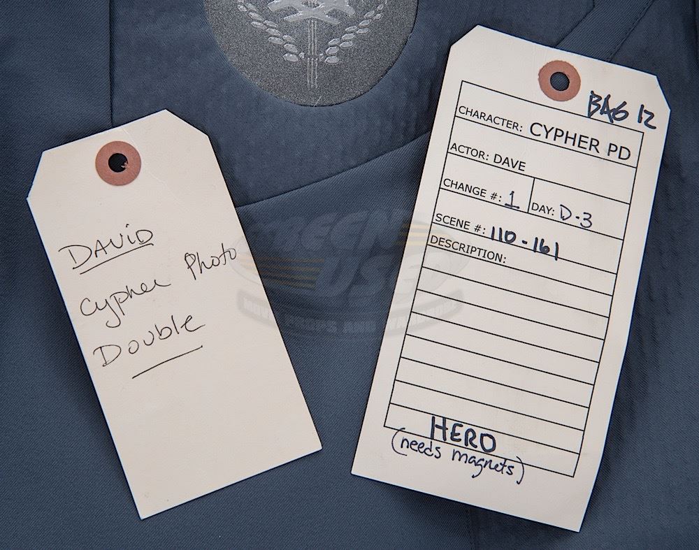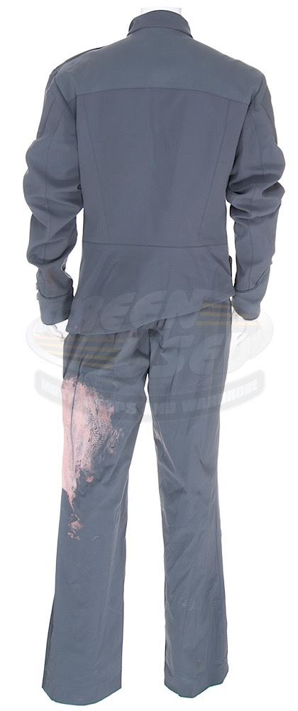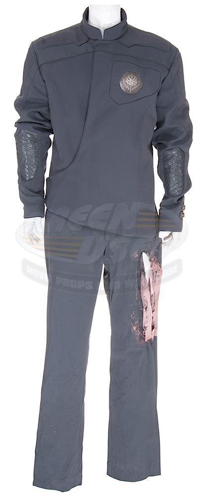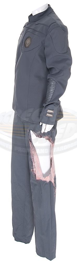(Columbia Pictures, 2013) This outfit was custom-made by the production for use by Will Smith's photo double during production. The outfit consists of a jacket that features the United Ranger Corps logo inlayed on the left chest and a pair of distressed pants. Included with the outfit is a production used costume tag that details the character, change and scene numbers used. Wear from use is present.