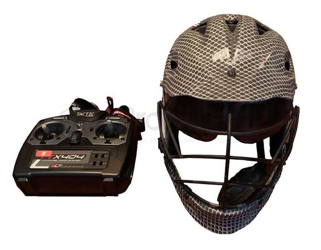 Ranger helmet used in the production of the 2013 M. Night Shyamaian film After Earth. A crash landing leaves Kitai Raige and his father Cypher stranded on Earth, a millennium after events forced humanity's escape. With Cypher injured, Kitai must embark on a perilous journey to signal for help. This style helmet was created for use by the United Ranger Cadets but only featured as set dressing in the downed United Ranger ship. This piece was altered from a real life hockey helmet and features a honeycomb pattern on the outside and a metal bar structure around the face. This specific helmet features a movable visor that is controlled by a radio remote control (unknown if in working condition).