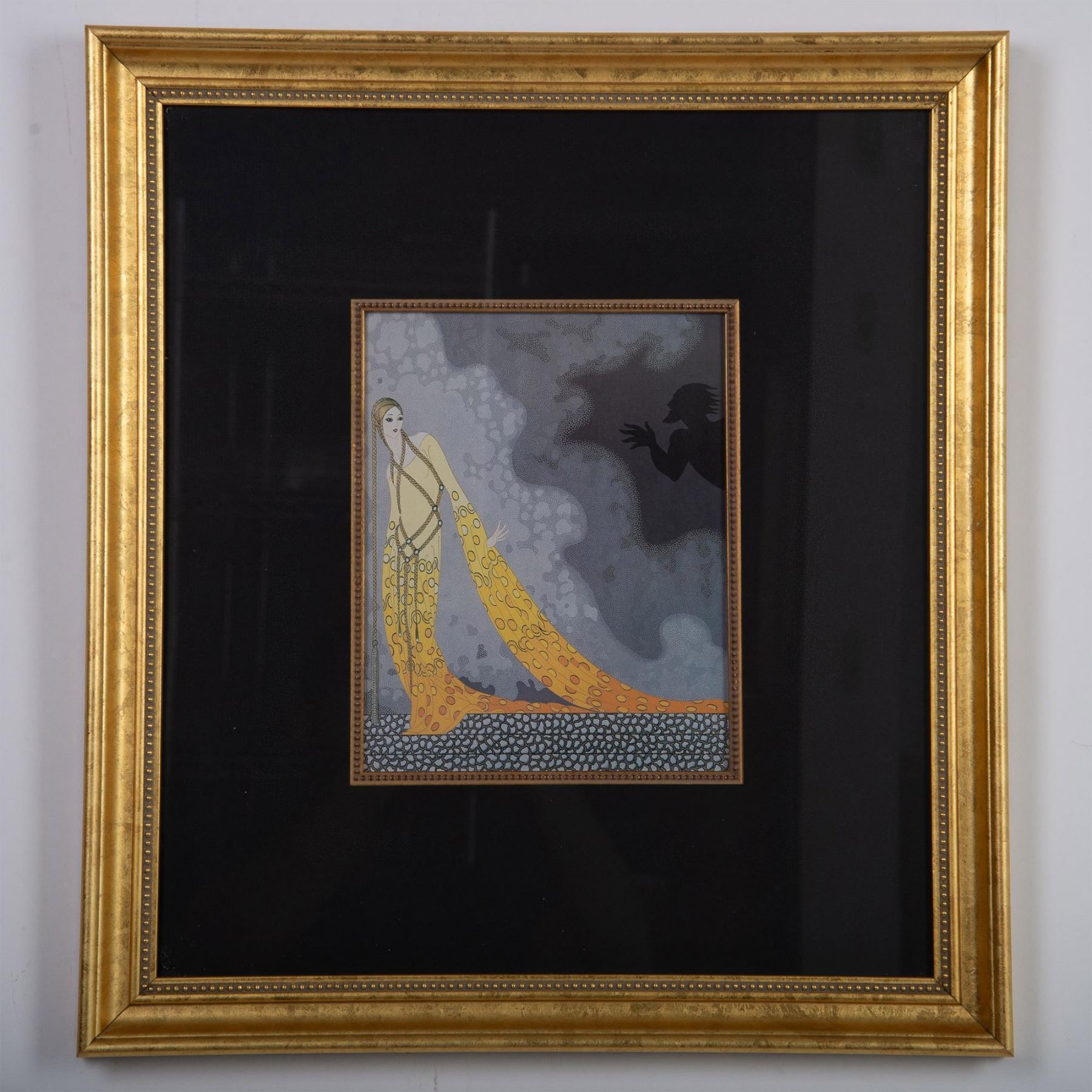 Vibrant color screenprint on laid paper entitled Melisande and Golaud after Art Deco artist Erte's design of a dress for the performance of Pelleas et Melisande at the New York Metropolitan Opera. Housed in a gilded frame with a black mat and gold color border. Sight size: 7.50"L x 9.50"H. Frame dimensions: 19"L x 21"H x 1.50"W. Artwork can be unframed and rolled for shipment.