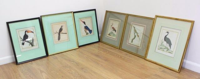 Colored engravings. 5 signed in plate. All approx. 10" H x 8" W sight, various sizes framed. Some have stains.