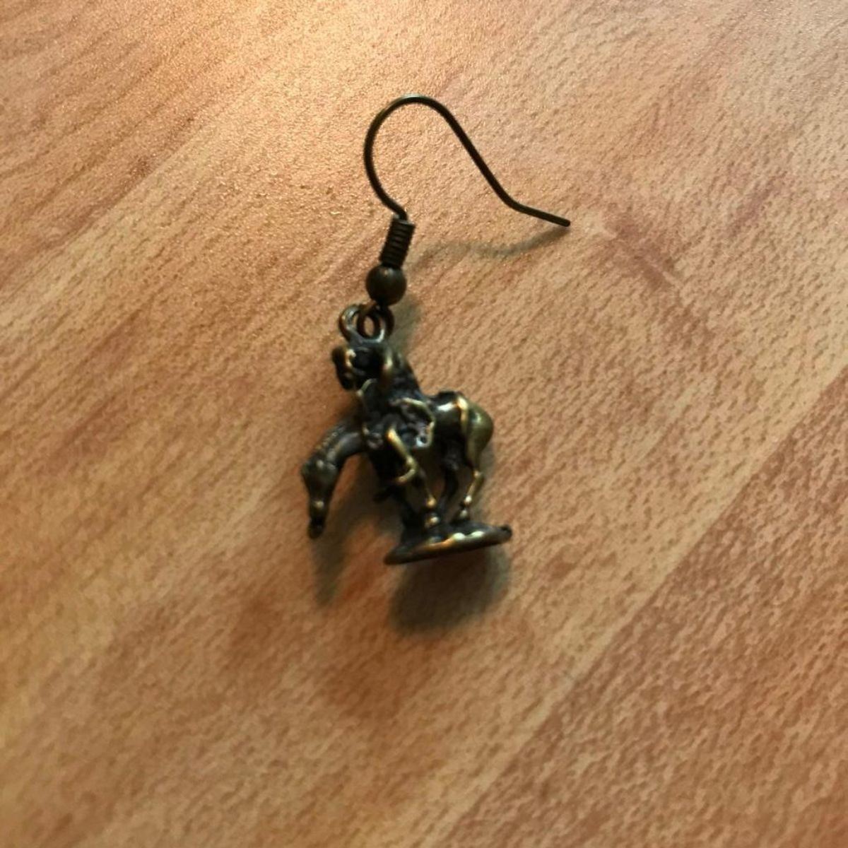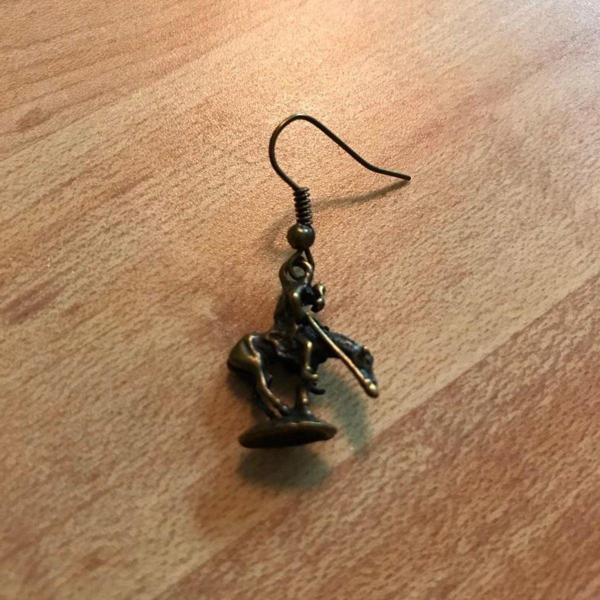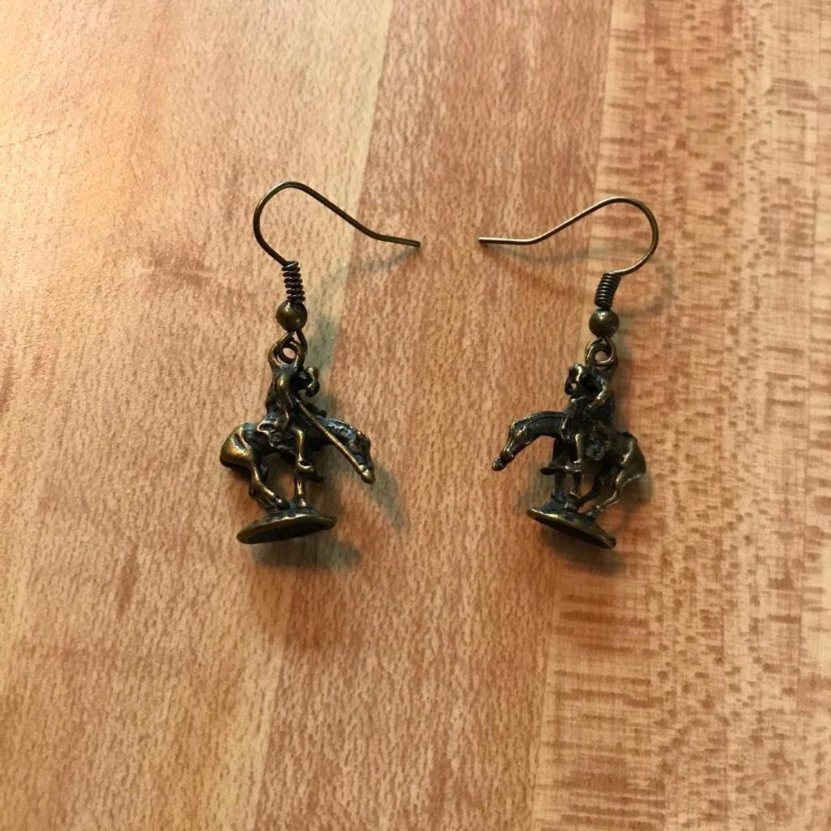 Bronze hook style earrings, created after James Earle Frazer's famous statue "End of The Trail" depicting a weary Native American man on horseback as he comes to the edge of the Pacific Ocean. 1 1/2" H from hooks to bottom.Â