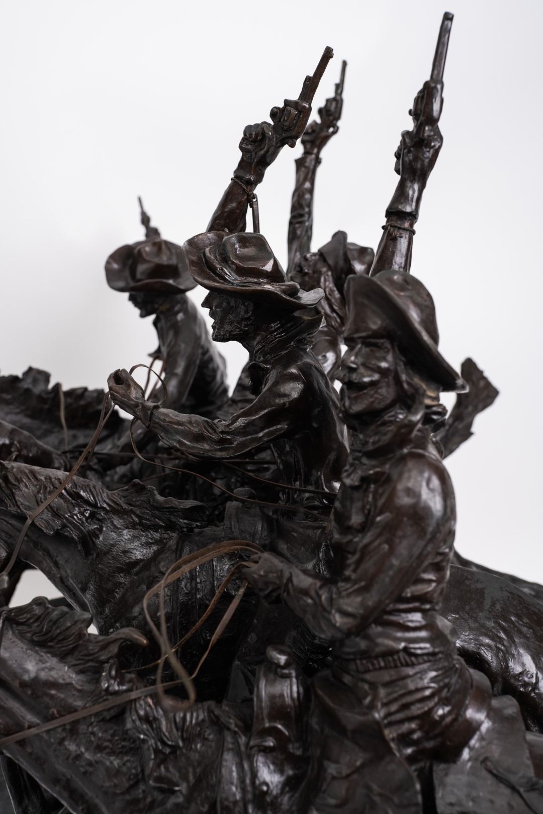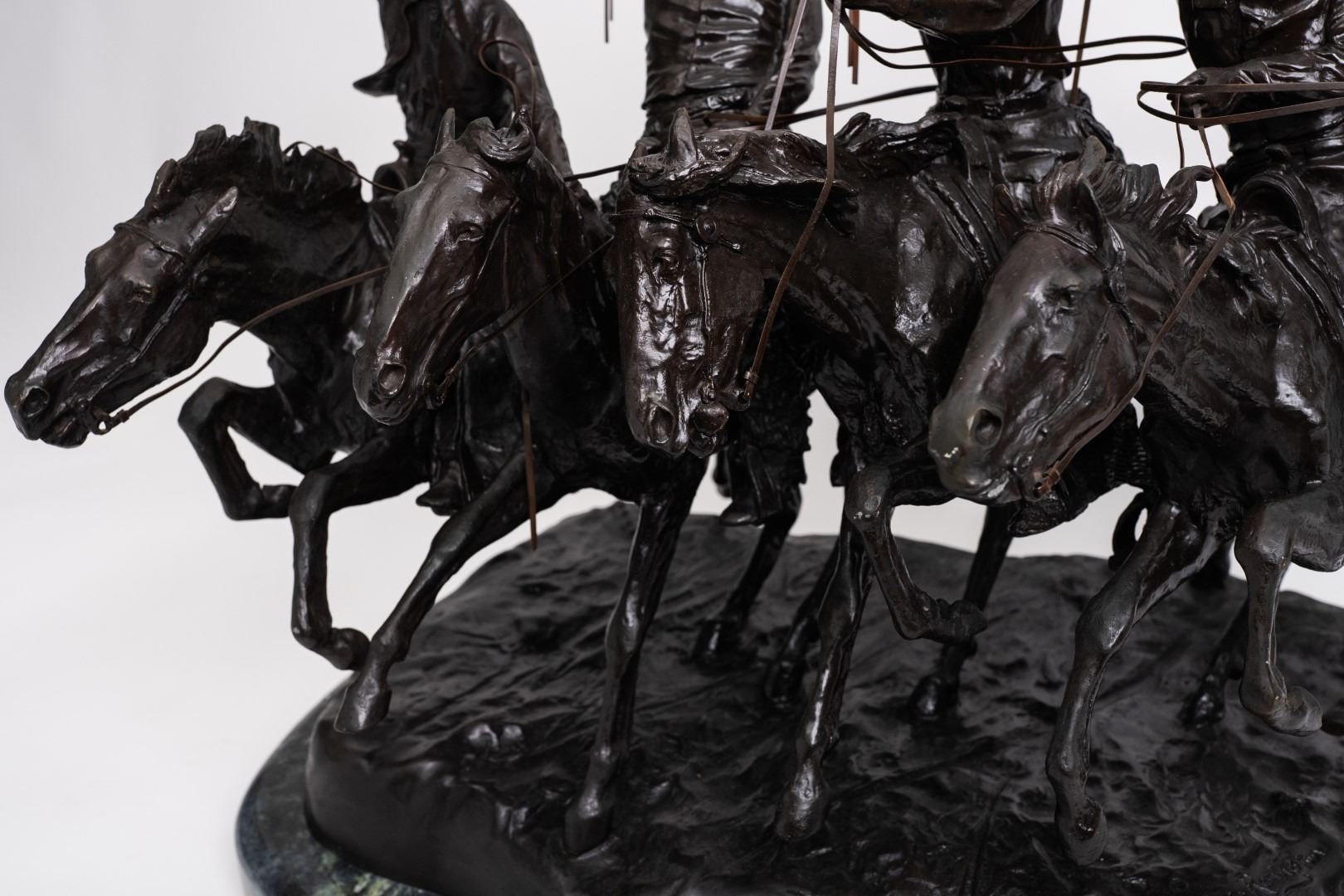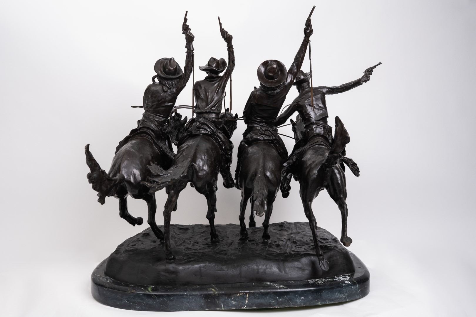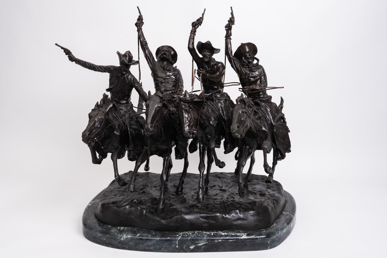 Frederic Remington was an American painter, illustrator, sculptor, and writer that specialized in Western American Art. He played a significant role in capturing the spirit of the American frontier in the late 19th and early 20th centuries. Remington's work is often associated with the Cowboy and Native American cultures, as well as the U.S. Cavalry. This incredible artwork was Remington’s most ambitious sculpture. "Coming Through The Rye" depicts four cowboys riding their galloping horses whilst shooting their pistols into the air and acting boisterous, suggesting the bravado and energy that characterized the frontier way of life. This famous sculpture was inspired by the artist's own illustrations, one published in "Century Magazine" in October 1888, the other in "Harper’s Weekly" in December 1889. This bronze statue and marble base are in excellent condition, only showing light handling and storage marks. The finish is complete with no defects. It measures 30" W x 28" H x 24" L. "Frederic Remington" is marked on the base, there are no other markings. This thought provoking and very large sculpture is a must have for any Western collection.