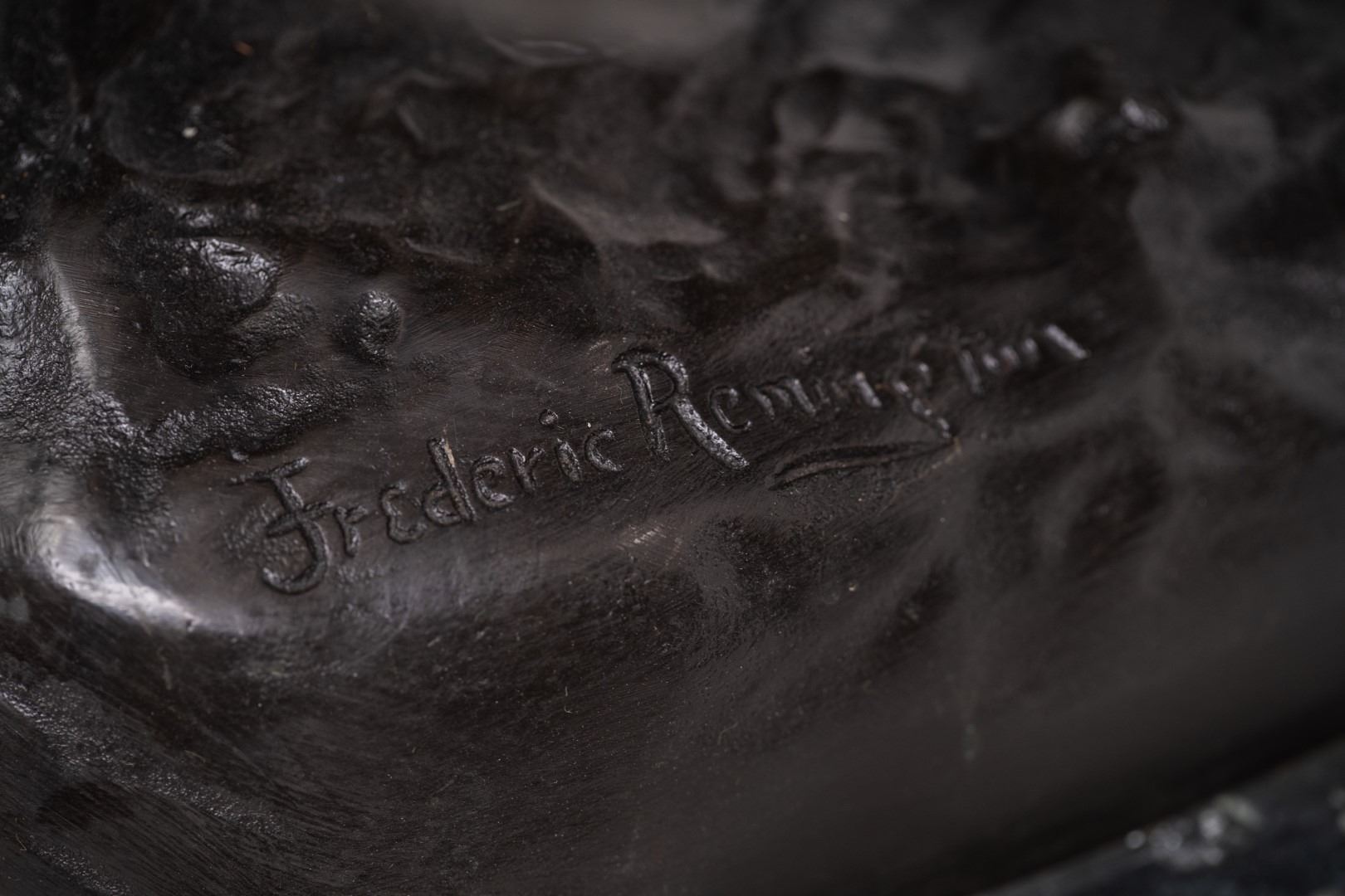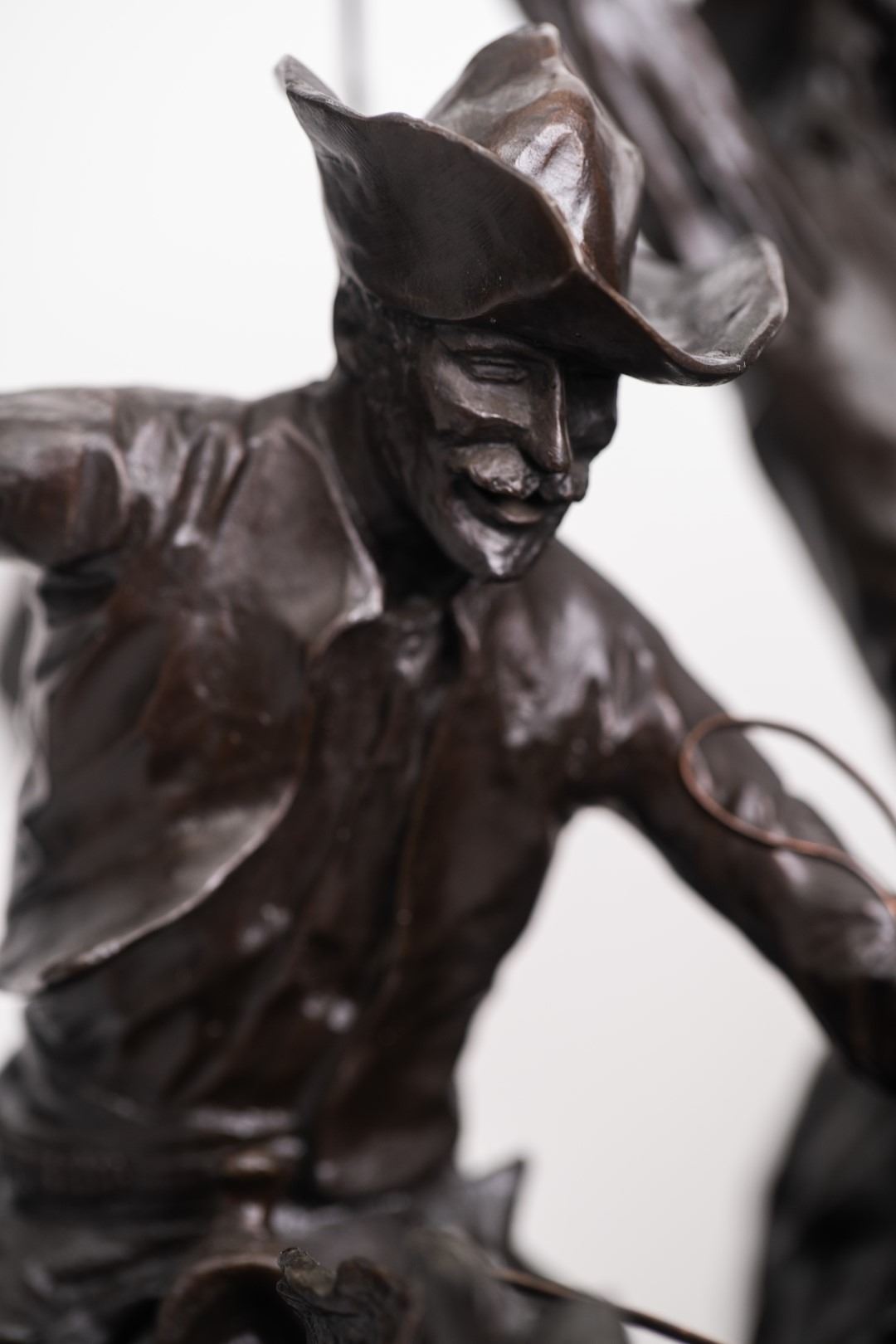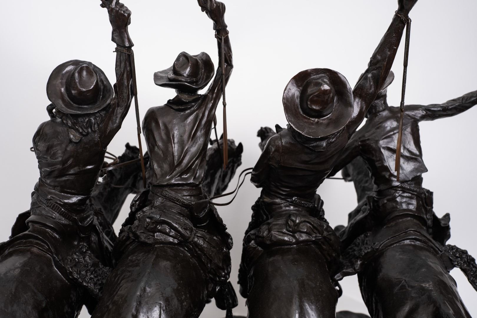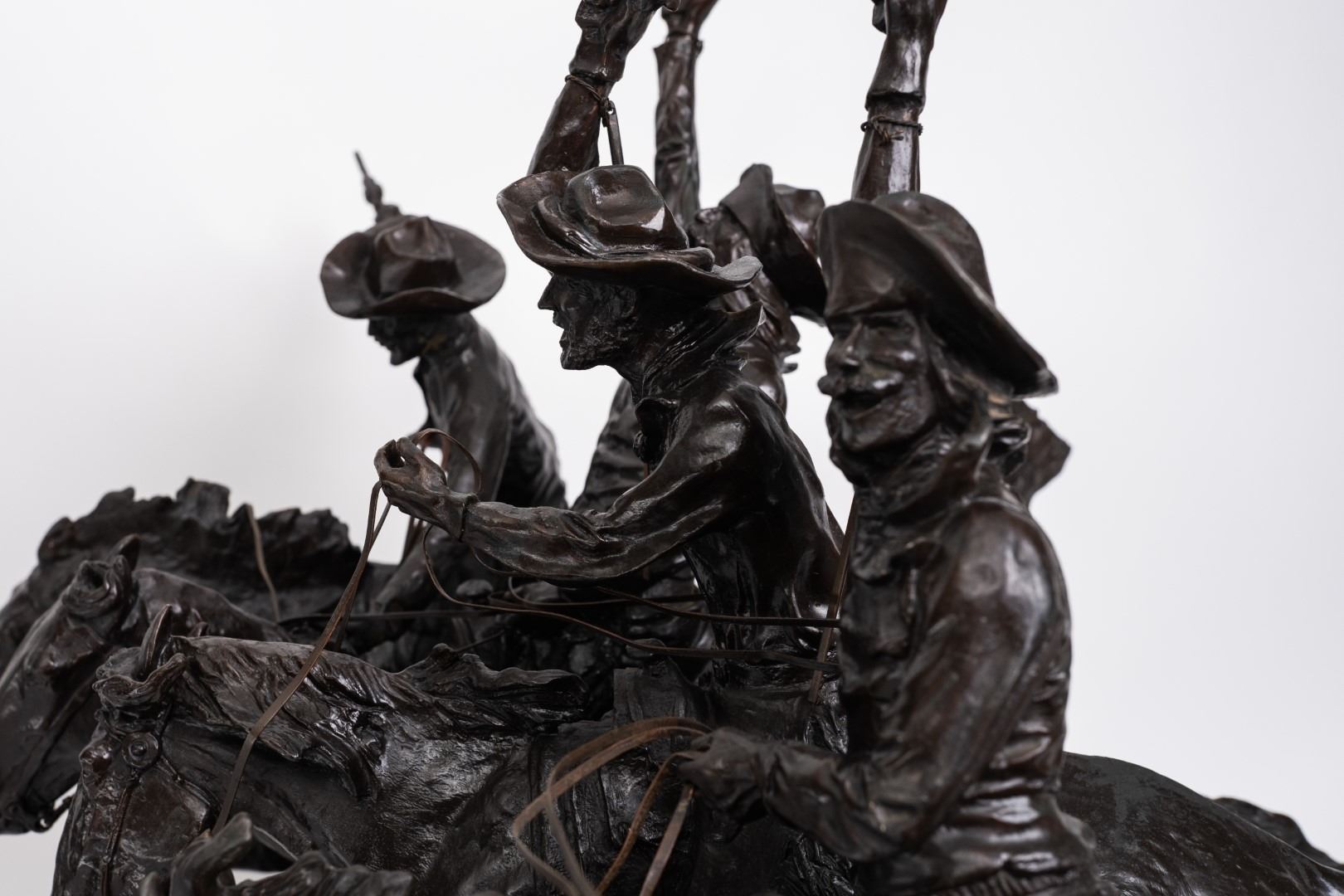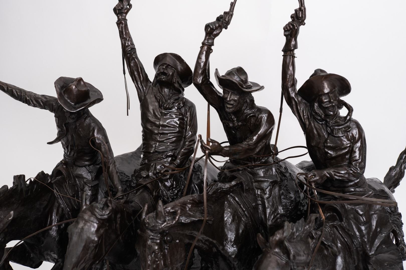 Frederic Remington was an American painter, illustrator, sculptor, and writer that specialized in Western American Art. He played a significant role in capturing the spirit of the American frontier in the late 19th and early 20th centuries. Remington's work is often associated with the Cowboy and Native American cultures, as well as the U.S. Cavalry. This incredible artwork was Remington’s most ambitious sculpture. "Coming Through The Rye" depicts four cowboys riding their galloping horses whilst shooting their pistols into the air and acting boisterous, suggesting the bravado and energy that characterized the frontier way of life. This famous sculpture was inspired by the artist's own illustrations, one published in "Century Magazine" in October 1888, the other in "Harper’s Weekly" in December 1889. This bronze statue and marble base are in excellent condition, only showing light handling and storage marks. The finish is complete with no defects. It measures 30" W x 28" H x 24" L. "Frederic Remington" is marked on the base, there are no other markings. This thought provoking and very large sculpture is a must have for any Western collection.
