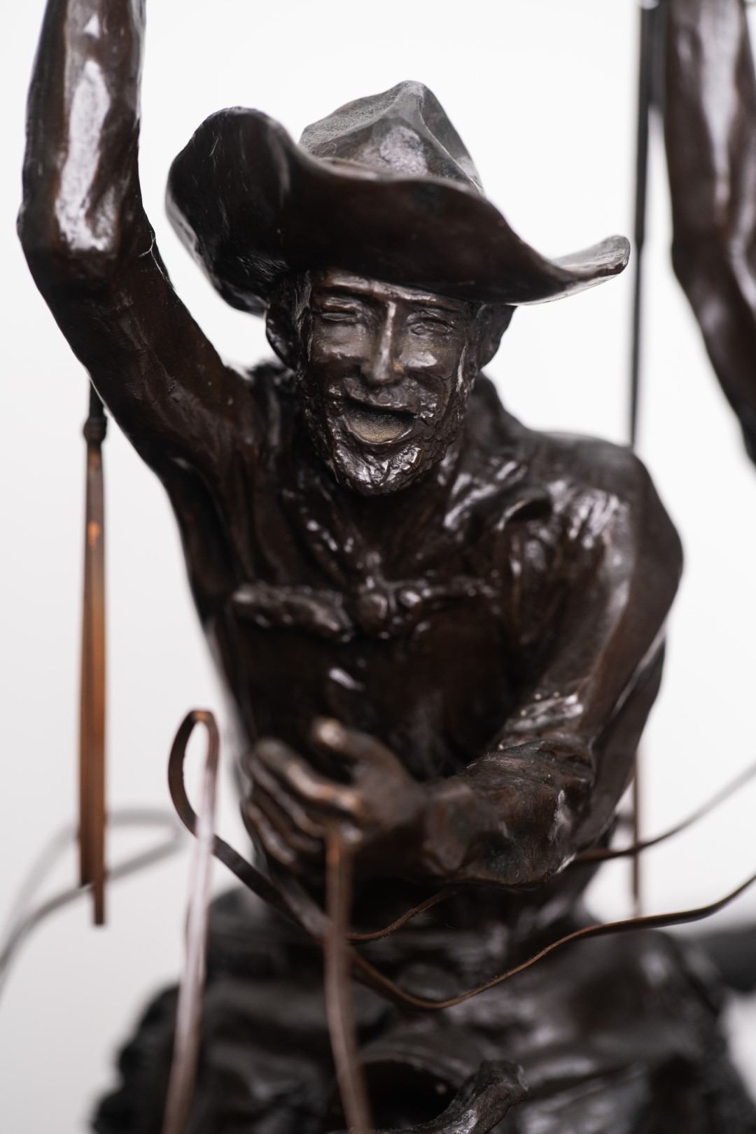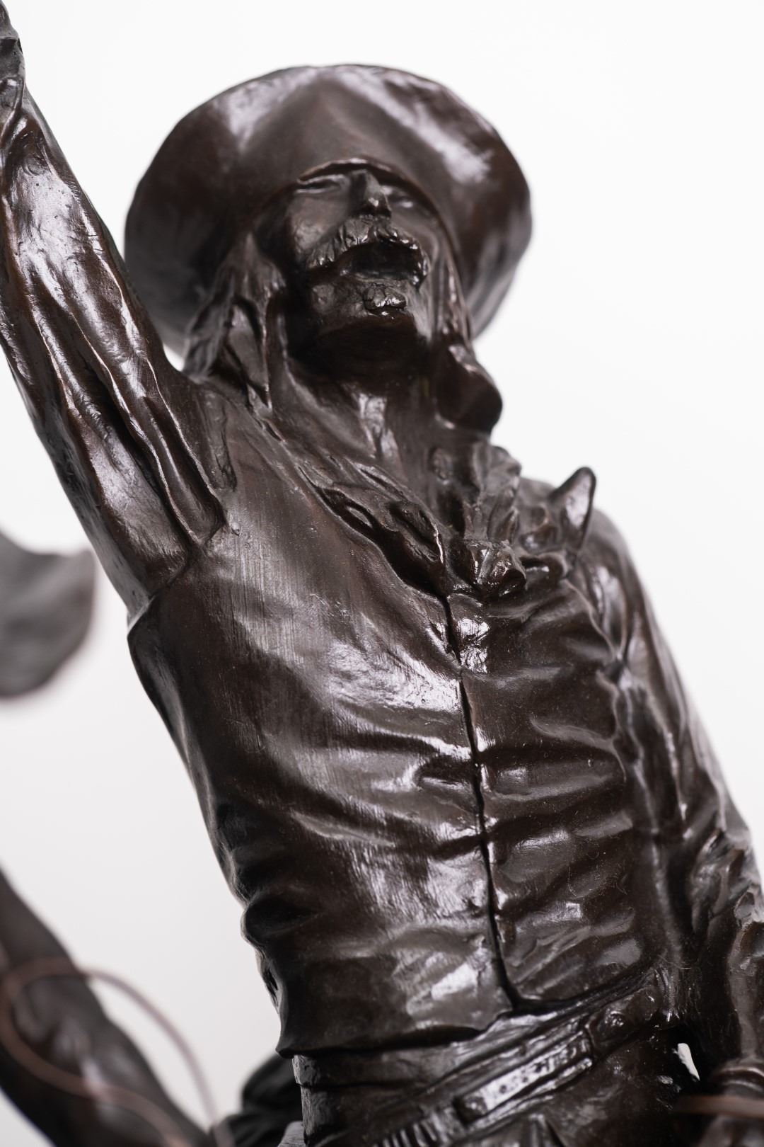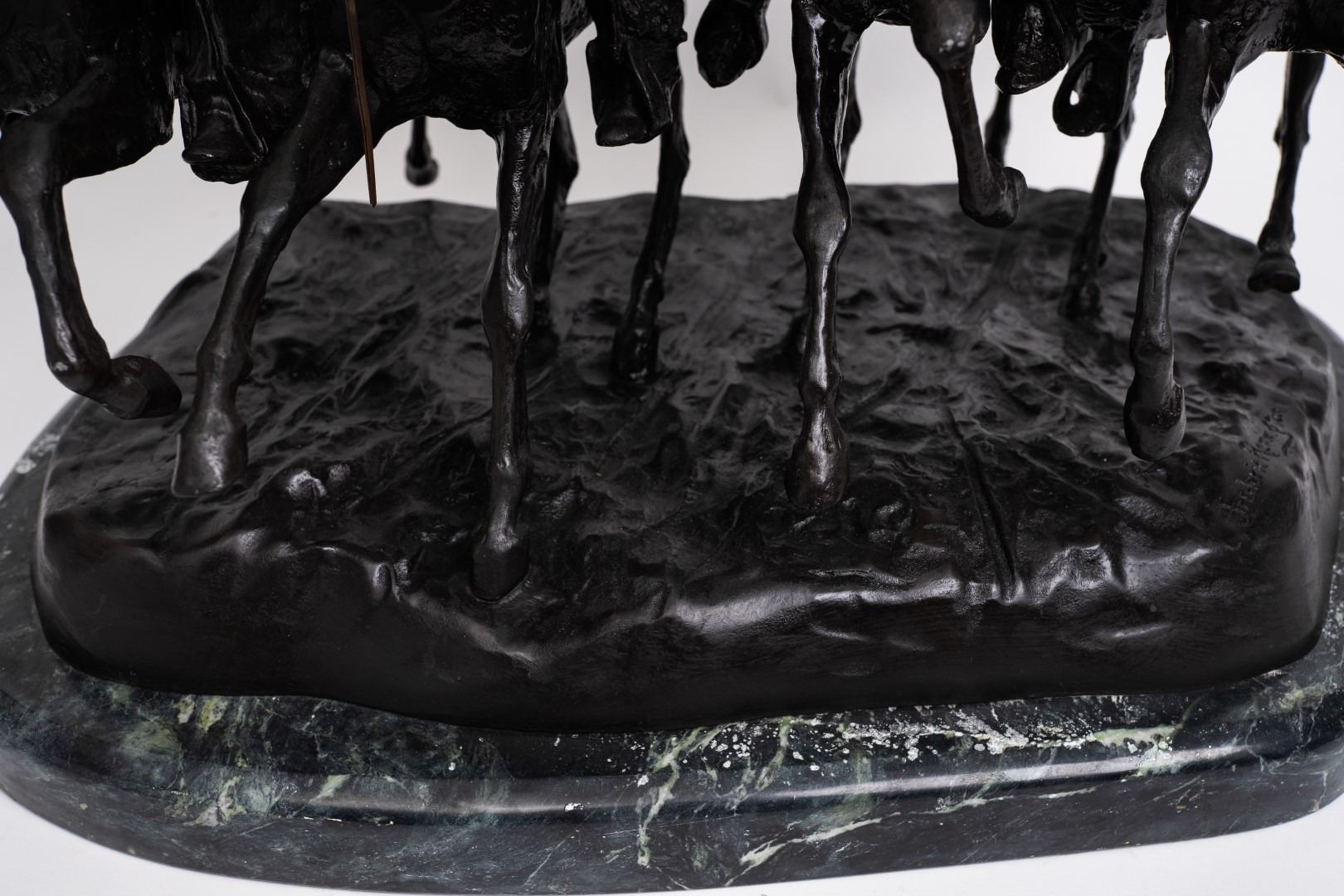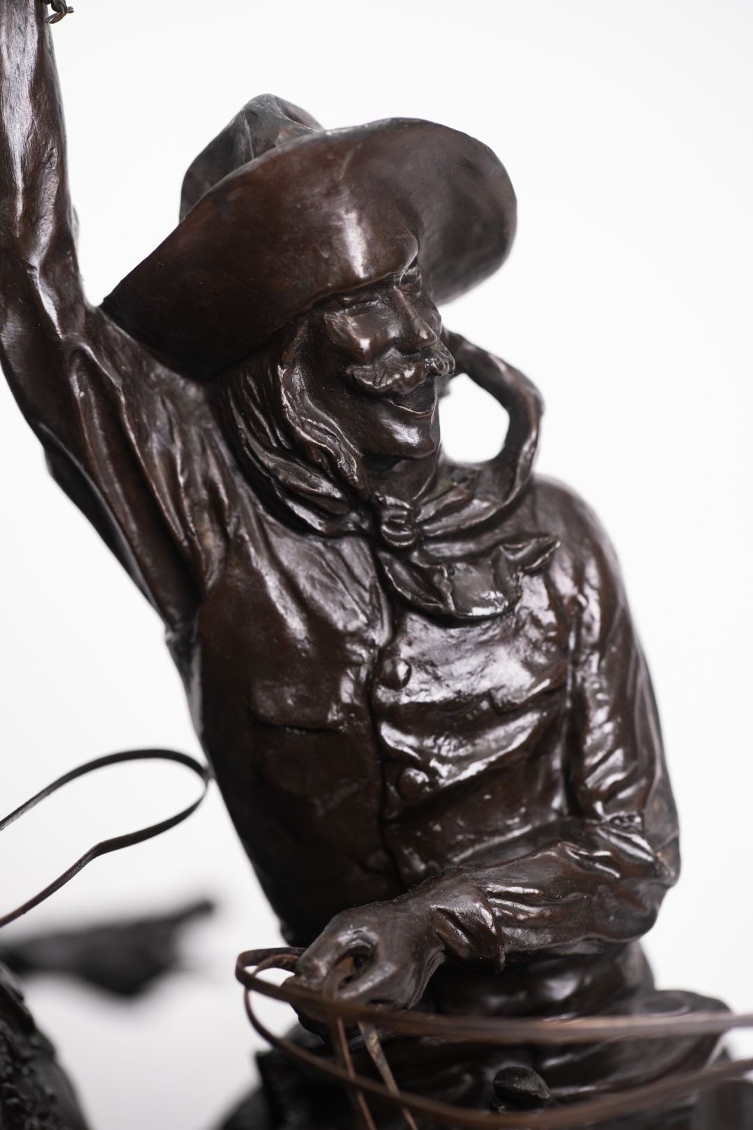 Frederic Remington was an American painter, illustrator, sculptor, and writer that specialized in Western American Art. He played a significant role in capturing the spirit of the American frontier in the late 19th and early 20th centuries. Remington's work is often associated with the Cowboy and Native American cultures, as well as the U.S. Cavalry. This incredible artwork was Remington’s most ambitious sculpture. "Coming Through The Rye" depicts four cowboys riding their galloping horses whilst shooting their pistols into the air and acting boisterous, suggesting the bravado and energy that characterized the frontier way of life. This famous sculpture was inspired by the artist's own illustrations, one published in "Century Magazine" in October 1888, the other in "Harper’s Weekly" in December 1889. This bronze statue and marble base are in excellent condition, only showing light handling and storage marks. The finish is complete with no defects. It measures 30" W x 28" H x 24" L. "Frederic Remington" is marked on the base, there are no other markings. This thought provoking and very large sculpture is a must have for any Western collection.