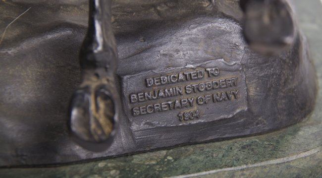 After Frederic Remington "Coming Thru the Rhye" with special dedicationoriginally cast in 1901, this one being a later cast inscribed as a memorial to Benjamin Stoddert, the first US Secretary of the Navy, dated 1904. (Size: See second photo for measurement.) Photos are part of the description representing the condition report. Pangaea Auctions urges Bidder's to view all attached photos.