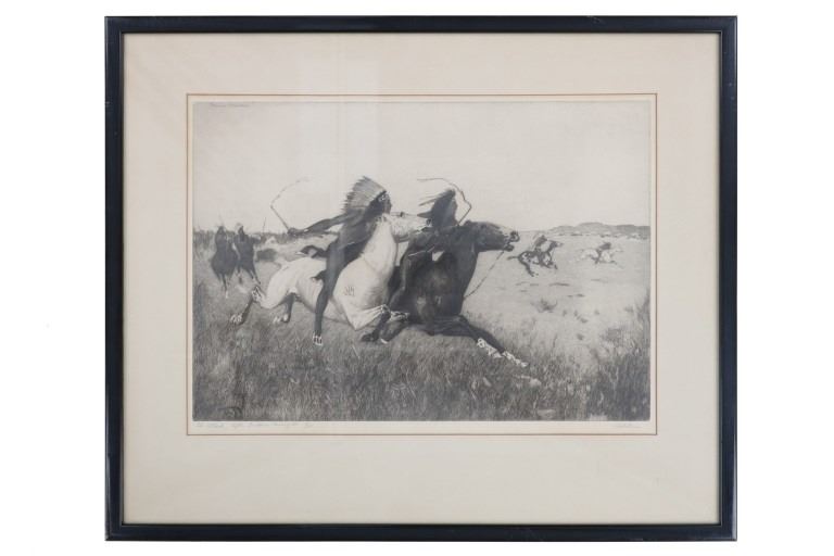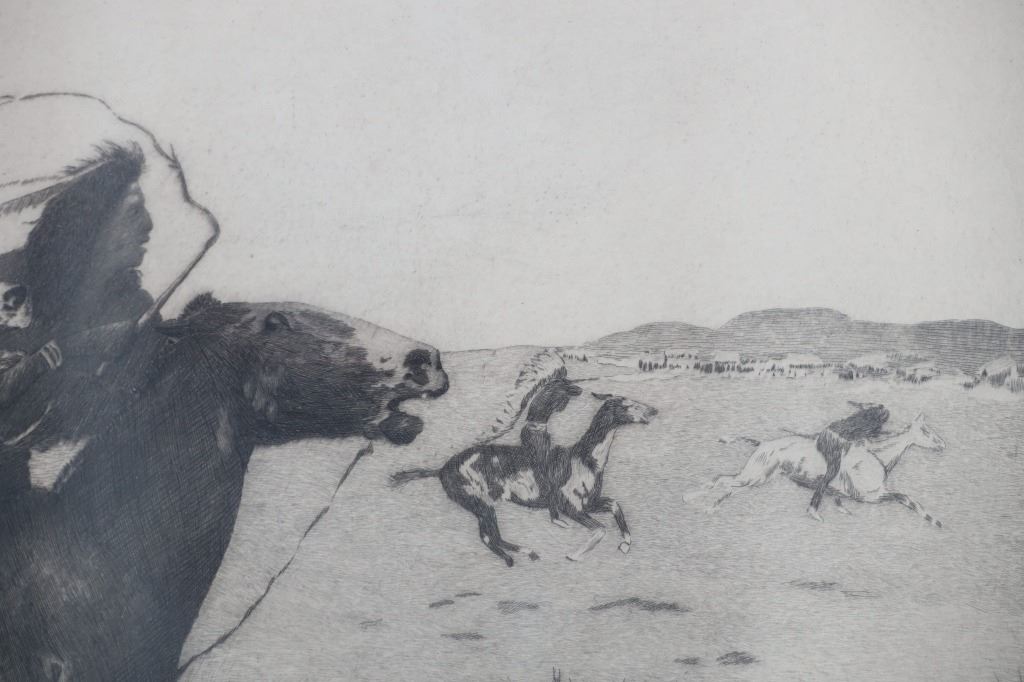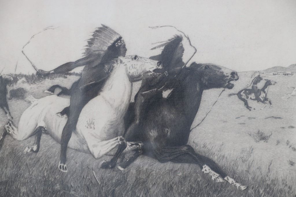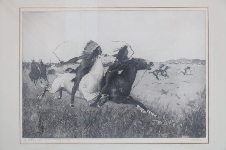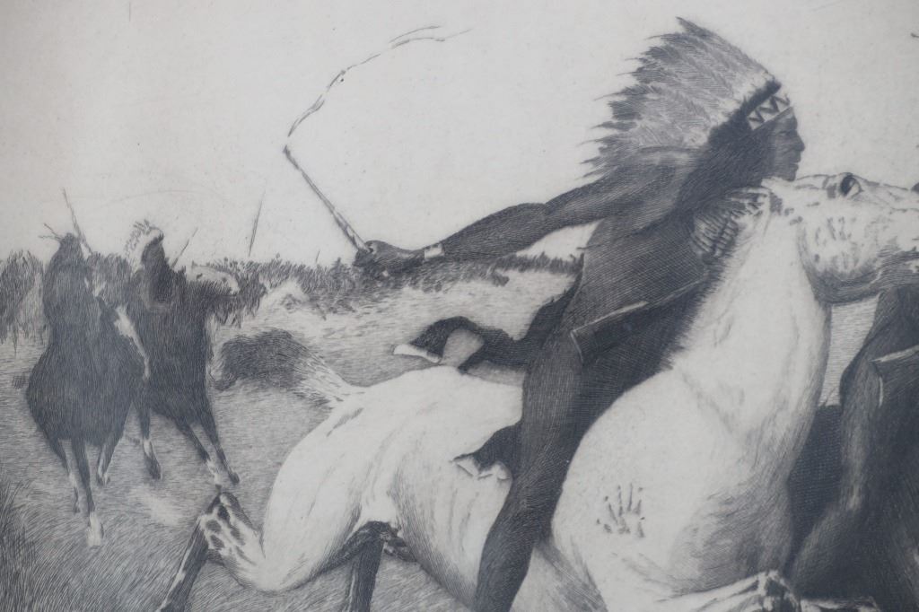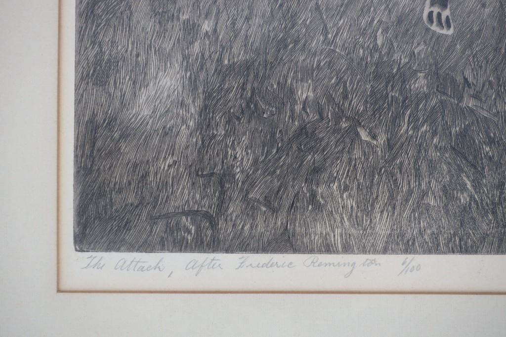 Featured in this lot is this superb etching called "The Attack," by Frederic Remington born in 1861 and died in 1909 printed after death. Frederic Remington is conserved on of the greatest Western artist in history whose original works have commanded in excess of $800,000 to $1,000,000 at auction. The etching shows a roaming band of Native American warriors sprinting over the plains in an attack charge all riding bareback with quirts and rifles in hand. The etching is marked in the top left, and bottom corners as follows: Published by T.S. Hughes-Chicago - The Attack, After Frederic Remington 6/100 - (unreadable signature). The condition of this etching is well preserved with no obvious signs of damage and shows a well preserved overall condition. The measurements of this framed etching is 20 1/4" x 24 1/2" and the visible artwork measures 13 1/8" x 18 1/8". The collective weight of this framed etching is 5lb 10oz.