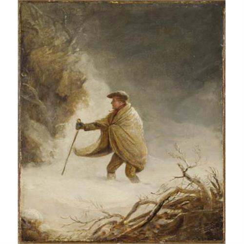 <B>After GEORGE MORLAND (British, 1763-1804)</B></I><BR><I>Snowbound</B></I><BR>Oil on canvas<BR>14 x 12 inches (35.6 x 30.5 cm)<BR>Inscribed in pencil on stretcher: <I>Morland/Snowbound</B></I><BR> <B>Condition Report:</B> Canvas has been relined, strengthening along the top of the canvas and scattered throughout the sky, repair below the hand on the cane, not framed, otherwise good condition. <BR><BR><b>Shipping:</b> Framed - without Glass, Small (<a target="_blank" href="http://www.heritageauctions.com/common/shipping.php">view shipping information</a>)