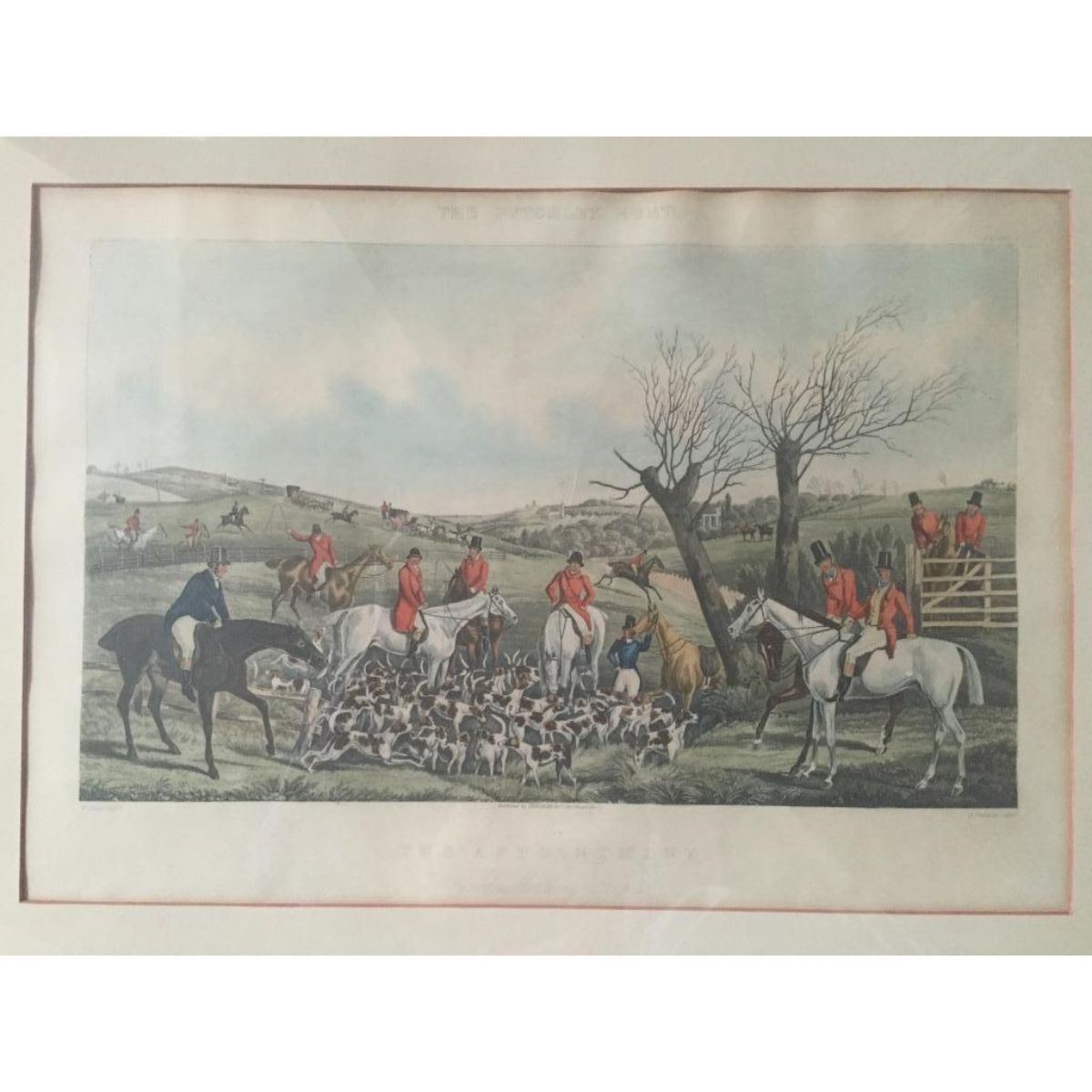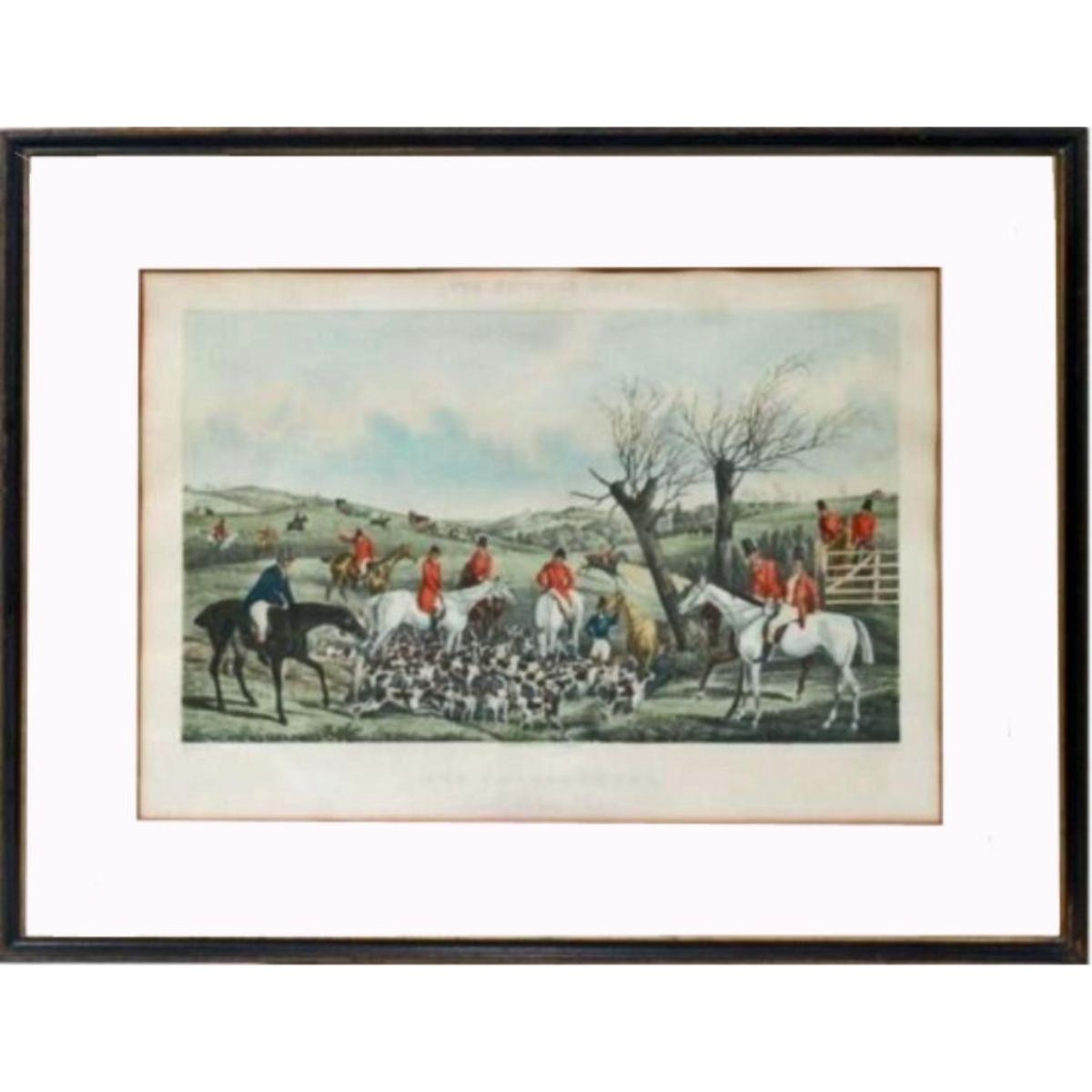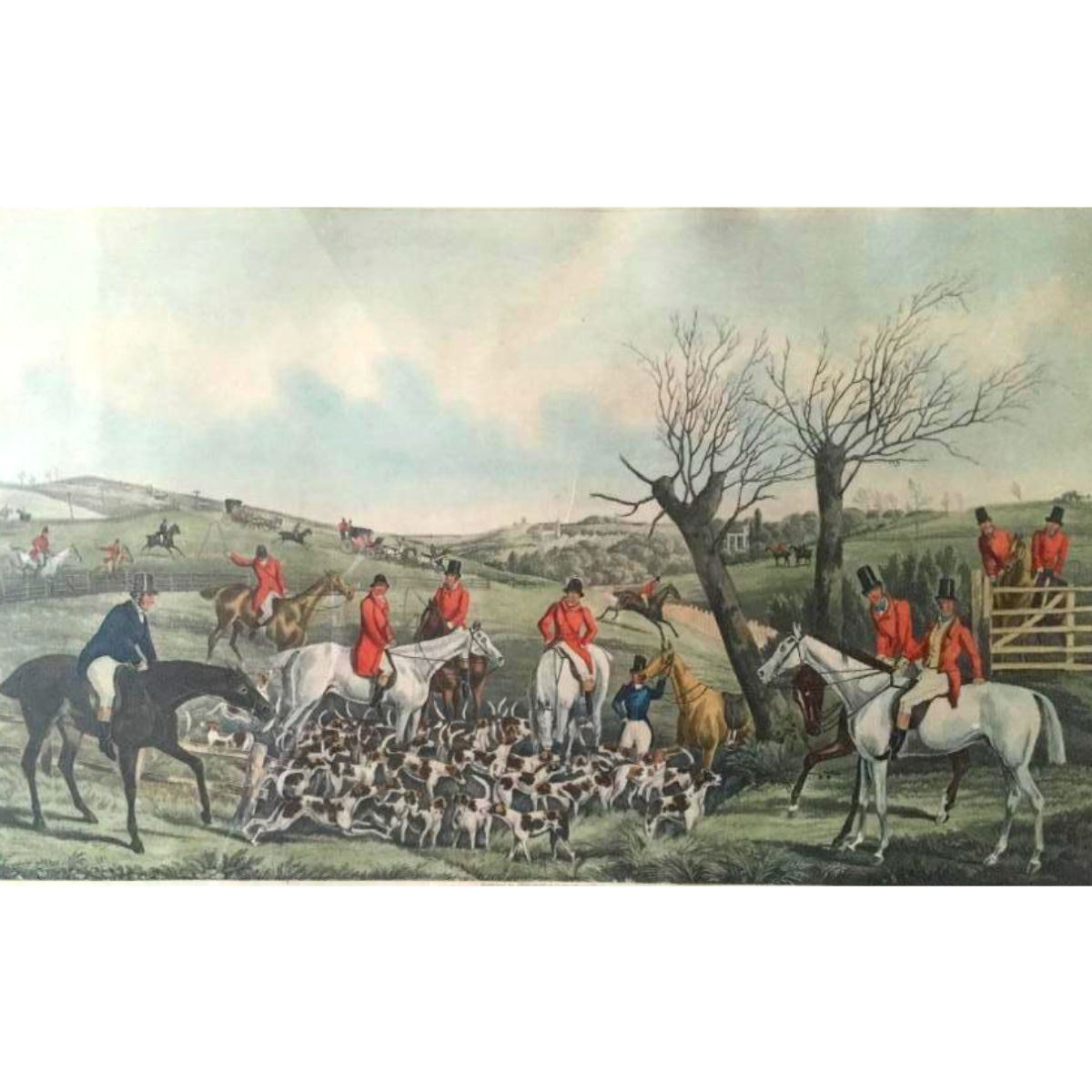 Original late 19th-century print, "The Pytchley Hunt, The Appointment, Good Morning Gents" by J Gleadsh. Published by TREGEAR & Co. 90 Cheapside. Plate 1. Hand-colored. Mat with hand-colored bevel, in 23" X 30"original period frame. *needs replacement backing paper.