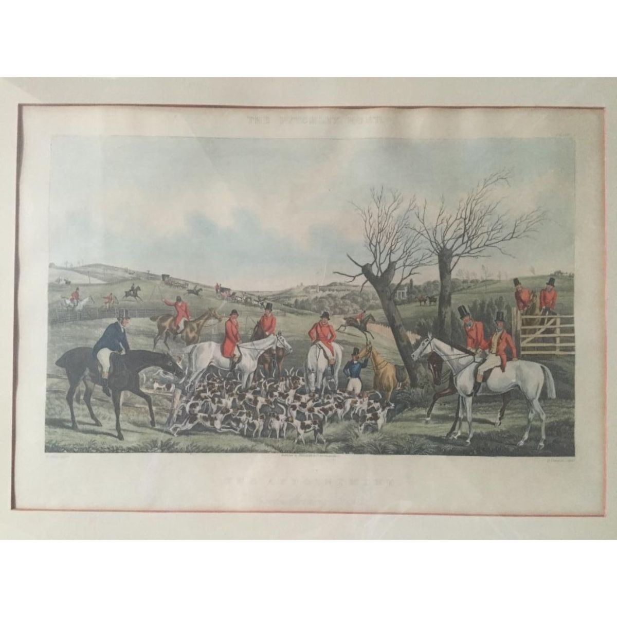 Original late 19th century print, "The Pytchley Hunt, The Appointment, Good Morning Gents" by J Gleadsh. Published by TREGEAR & Co. 90 Cheapside. Plate 1. Hand-colored. Mat with hand-colored bevel, in 23" X 30"original period frame. *needs replacement backing paper.