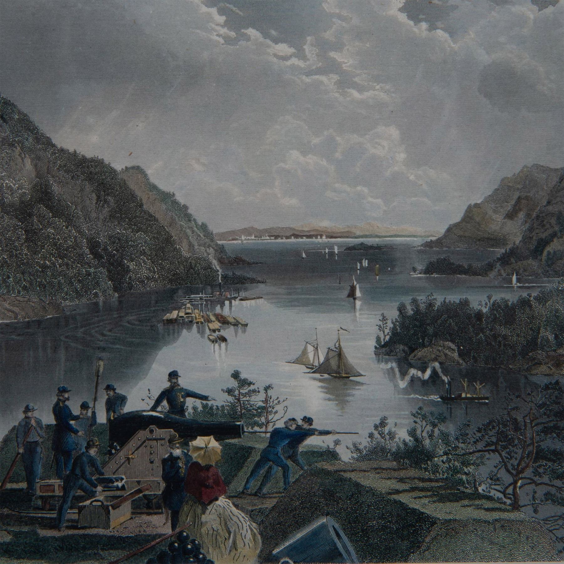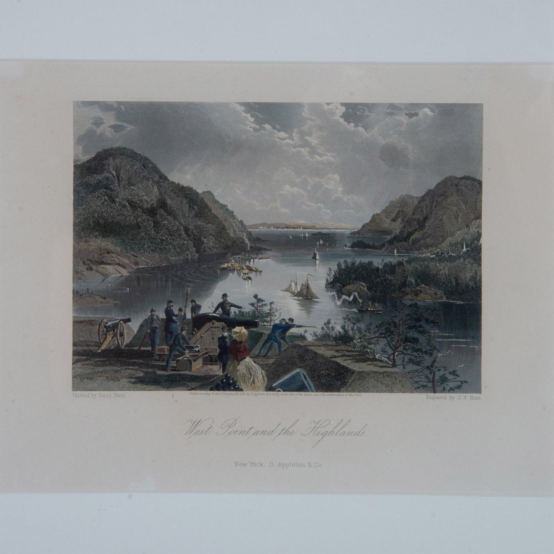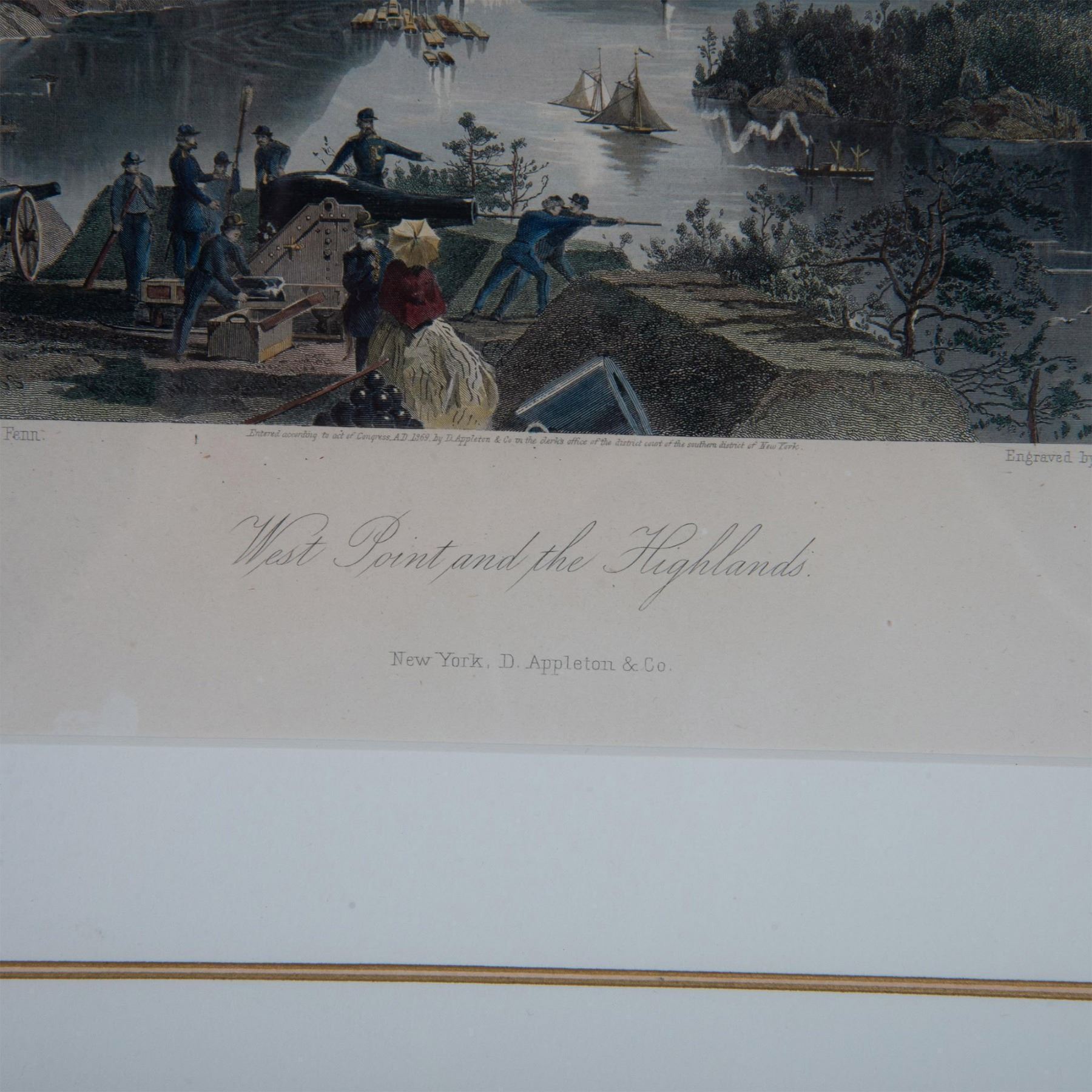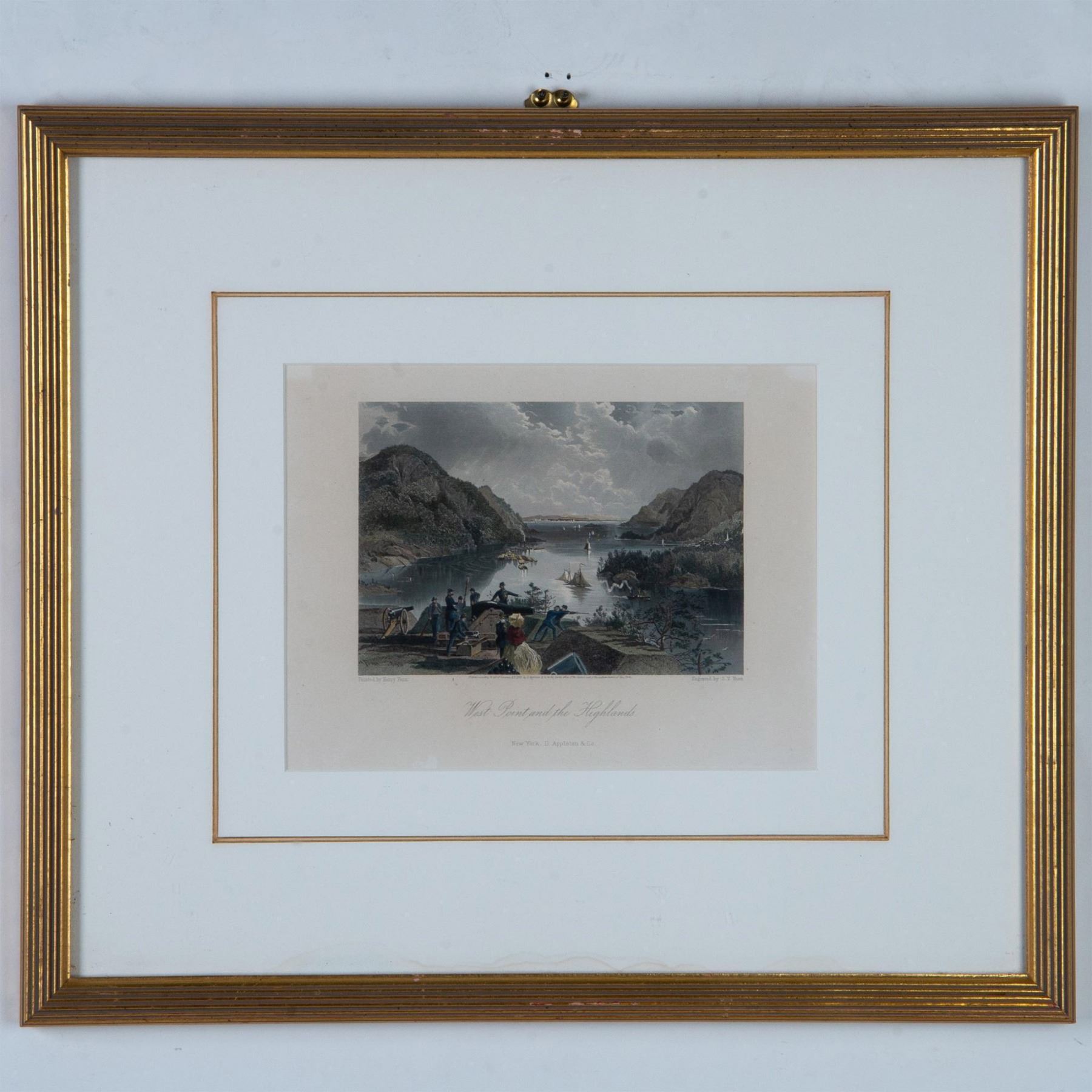 West Point and the Highlands is an elegant original color engraving on paper featuring a group of cadets and a trainer at the ramparts that overlook the Hudson River. Engraved after the 1865 original painting by Henry (Harry) Fenn. Engraved by S.V. Hunt. Below plate: Entered according to act of Congress. A.D. 1869 by D. Appleton & Co. in the clerks office of the district court of the southern district of New York. Signature in plate: H. Fenn. Housed in a gilded frame with a white mat. Sight dimensions: 9.75"L x 7.50"H. Frame size: 19.25"L x 17"H x 1.50"W. Artwork can be unframed and rolled for shipment.