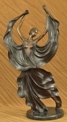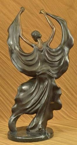This Beautiful Sculpture Of A Tango Dancer Will Leave You In Pure Amazement And Excitement. The Stunning Beauty Really Is Gorgeous, Her Aqua Dress Flows Down Her Body Giving Her The Most Elegant Look, It Cuts Really Low Up Front Revealing Most Of Her Chest. Even Without A Partner She Is Still Working The Crowd As She Sways Her Hips To The Music, That Is Loudly Coming Out The Speakers. She Closes Her Eyes To Stay In Tune With The Beat Of The Song And With Both Hands She Holds Each Side Of Her Exquisite Dress Up. Her Hair Is Placed Neatly In A Low Bun, With A Gold Head Band To Match Her Cute Heels. This Sculpture Was Cast Using The Ancient Old Lost Wax Method Stained In A Brown Patina Finish For Preservation and Mounted Atop A Black Marble Base. Bronze Dimensions With Marble Base: Height 26 X Width 14 inches. Weight: 20 Lbs.