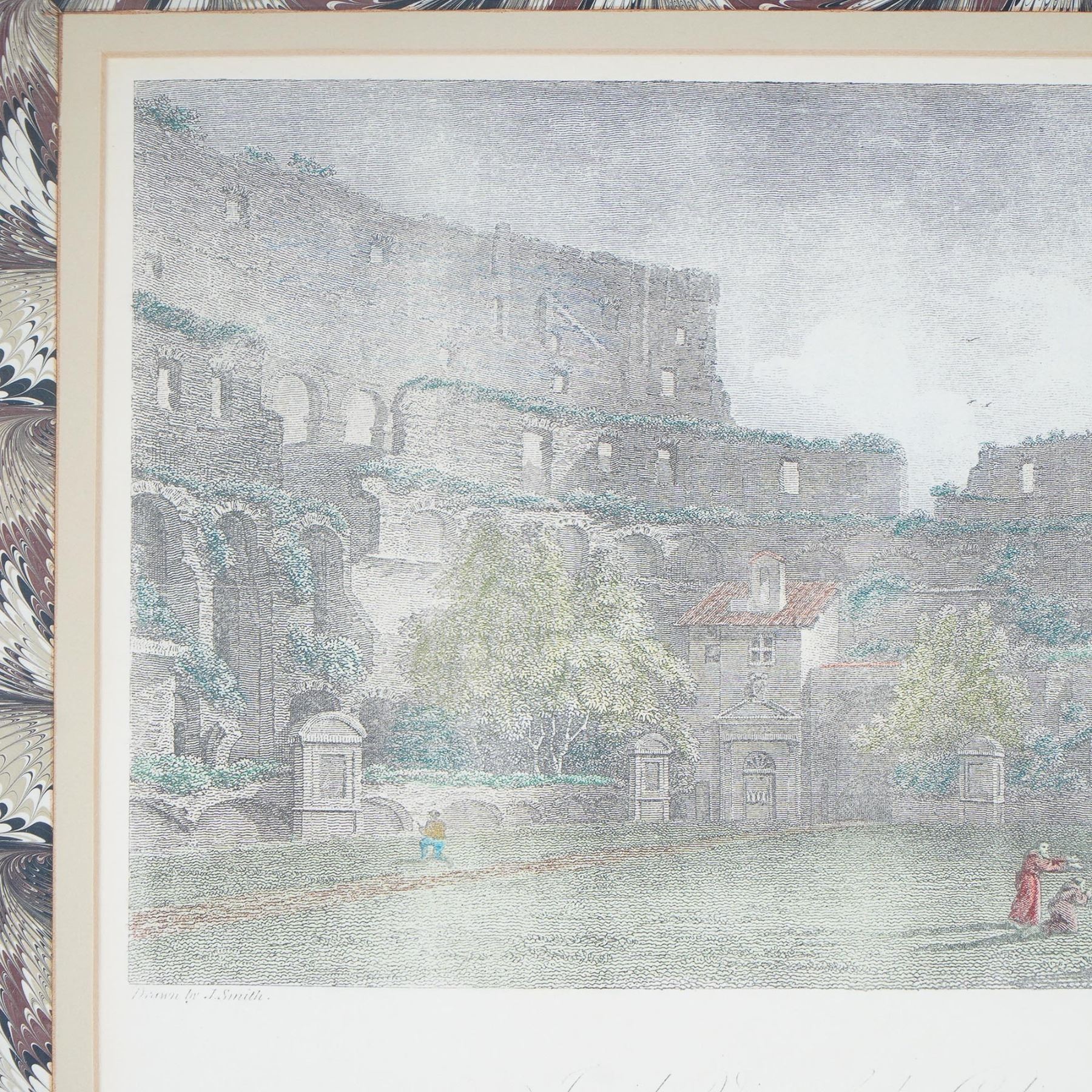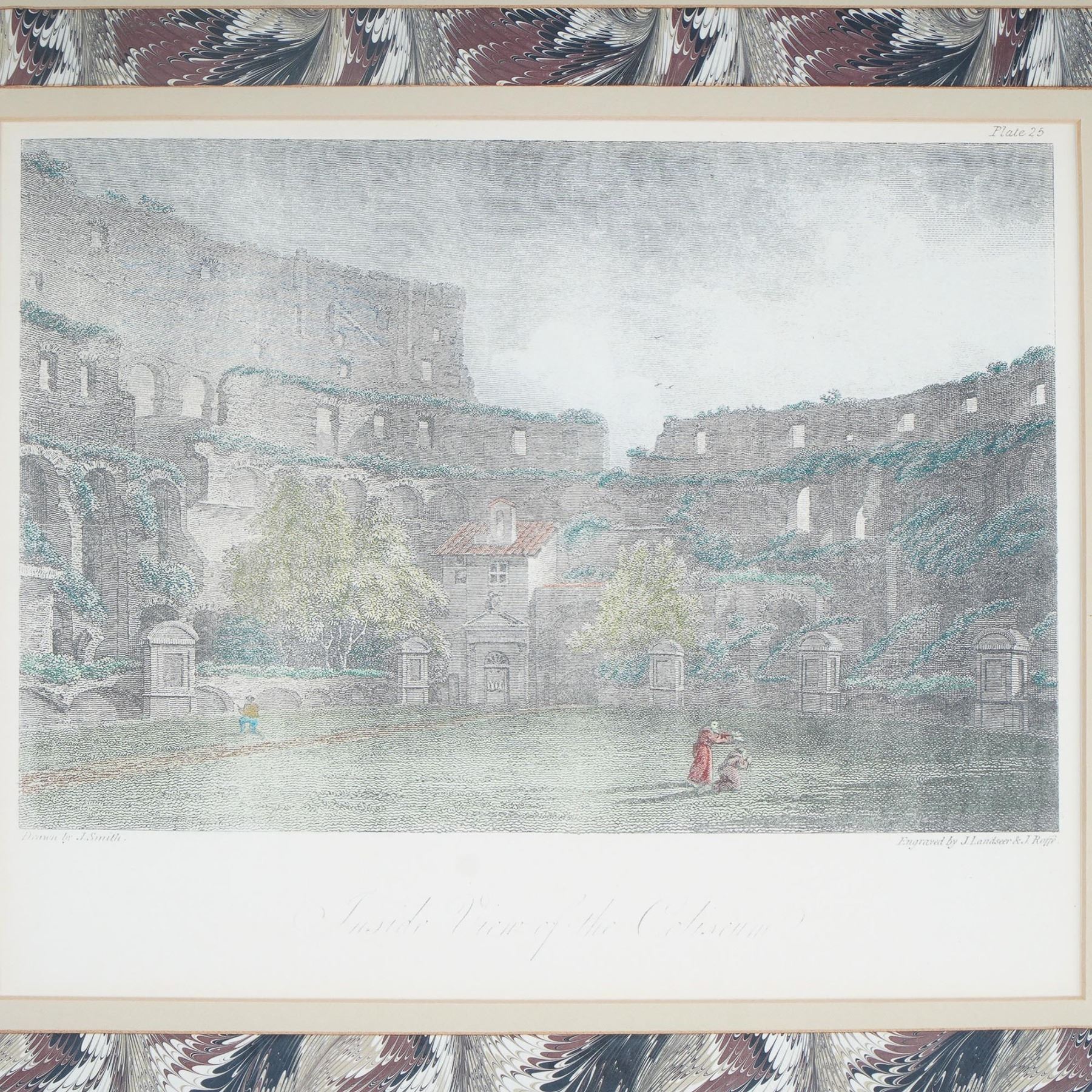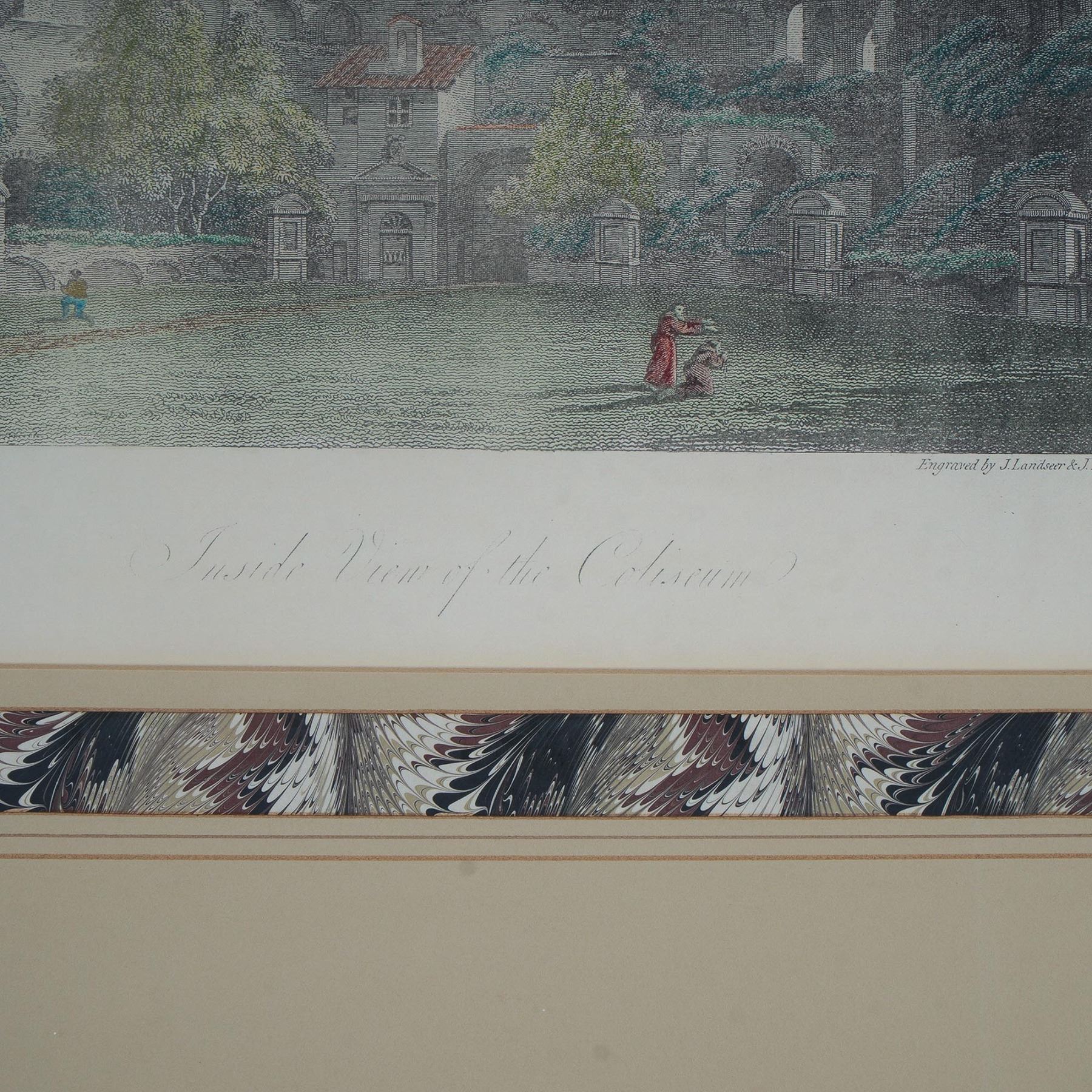 Hand-colored engraving titled Inside View of the Coliseum, drawn by J. Smith and engraved by J. Landseer and J. Roffe. Print marked Plate 25. This detailed print presents a romanticized 19th-century view of the interior of the Roman Colosseum, with lush vegetation and period figures conveying the serene grandeur of the ancient ruin. The print is handsomely framed with a wide marbled inner mat and giltwood frame. Informational labels and documentation mounted to the reverse provide historical context and provenance, including reference to the work's original publication in Select Views of Italy.