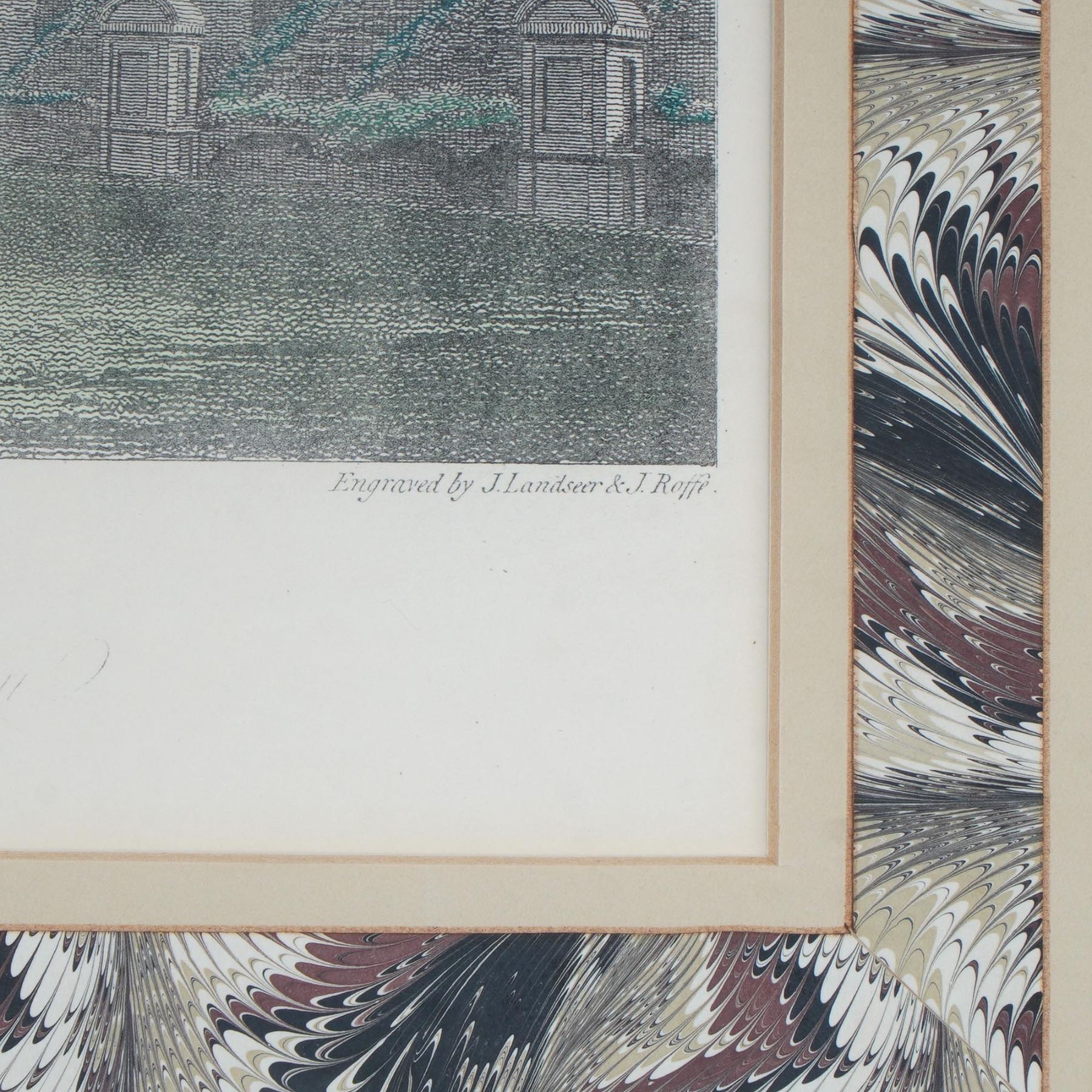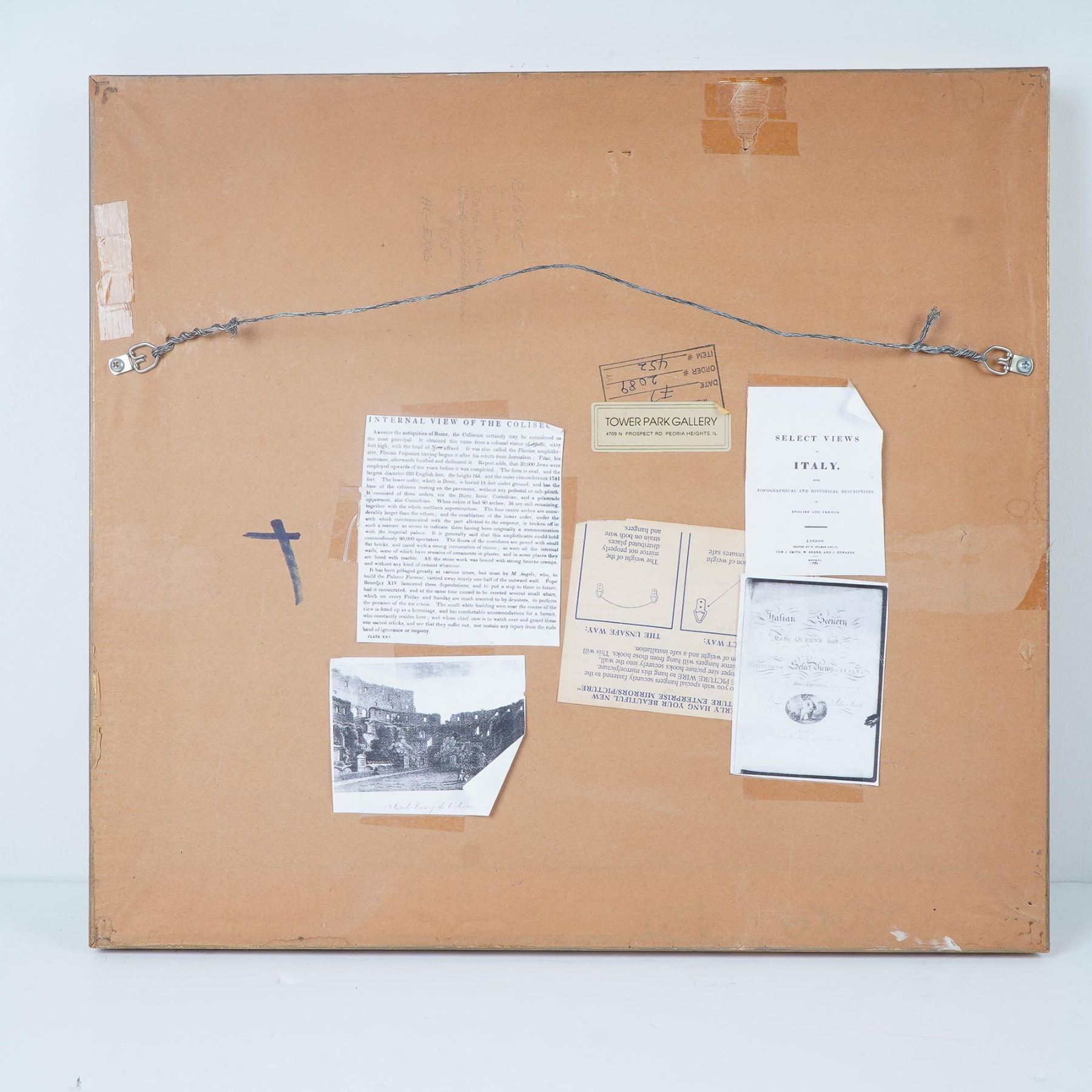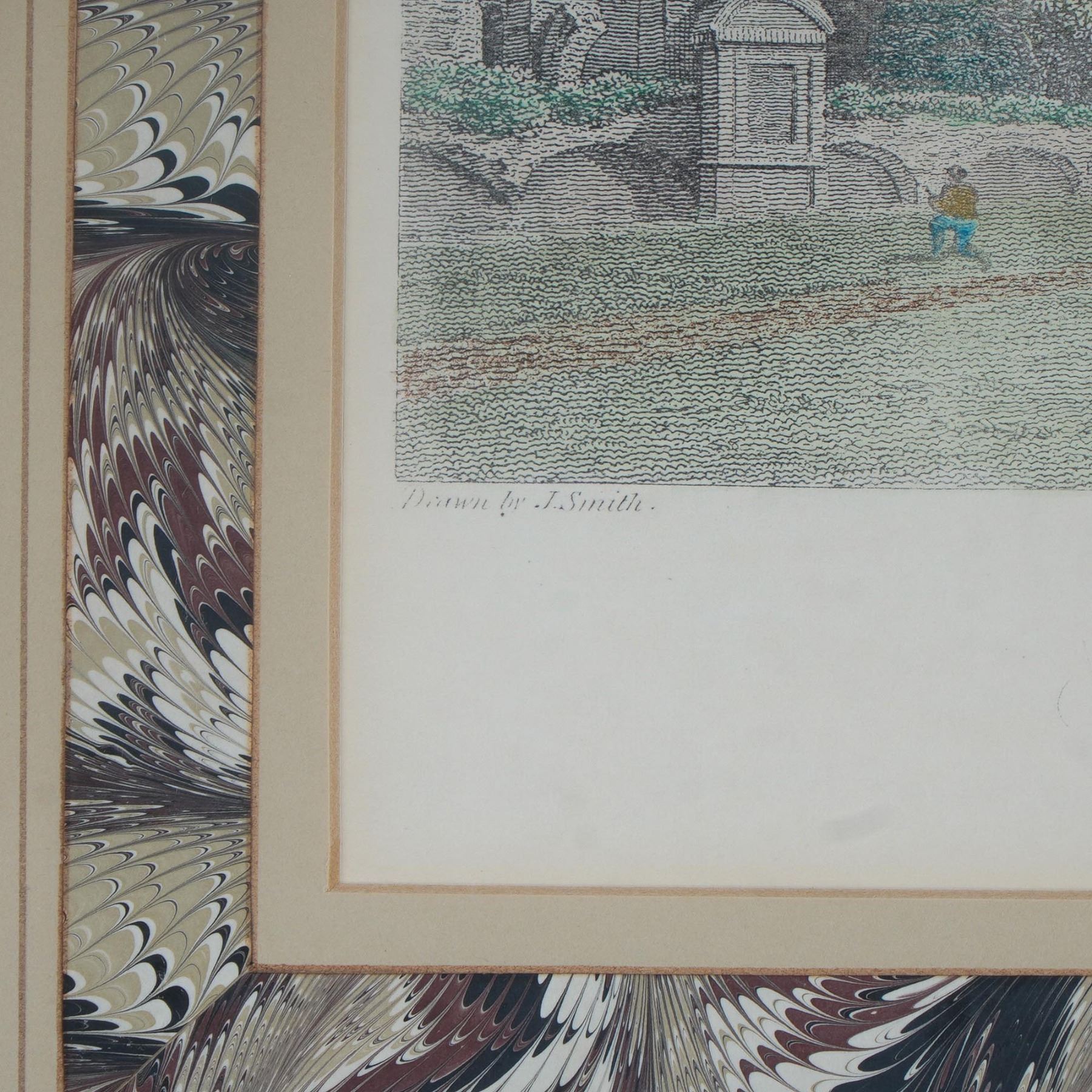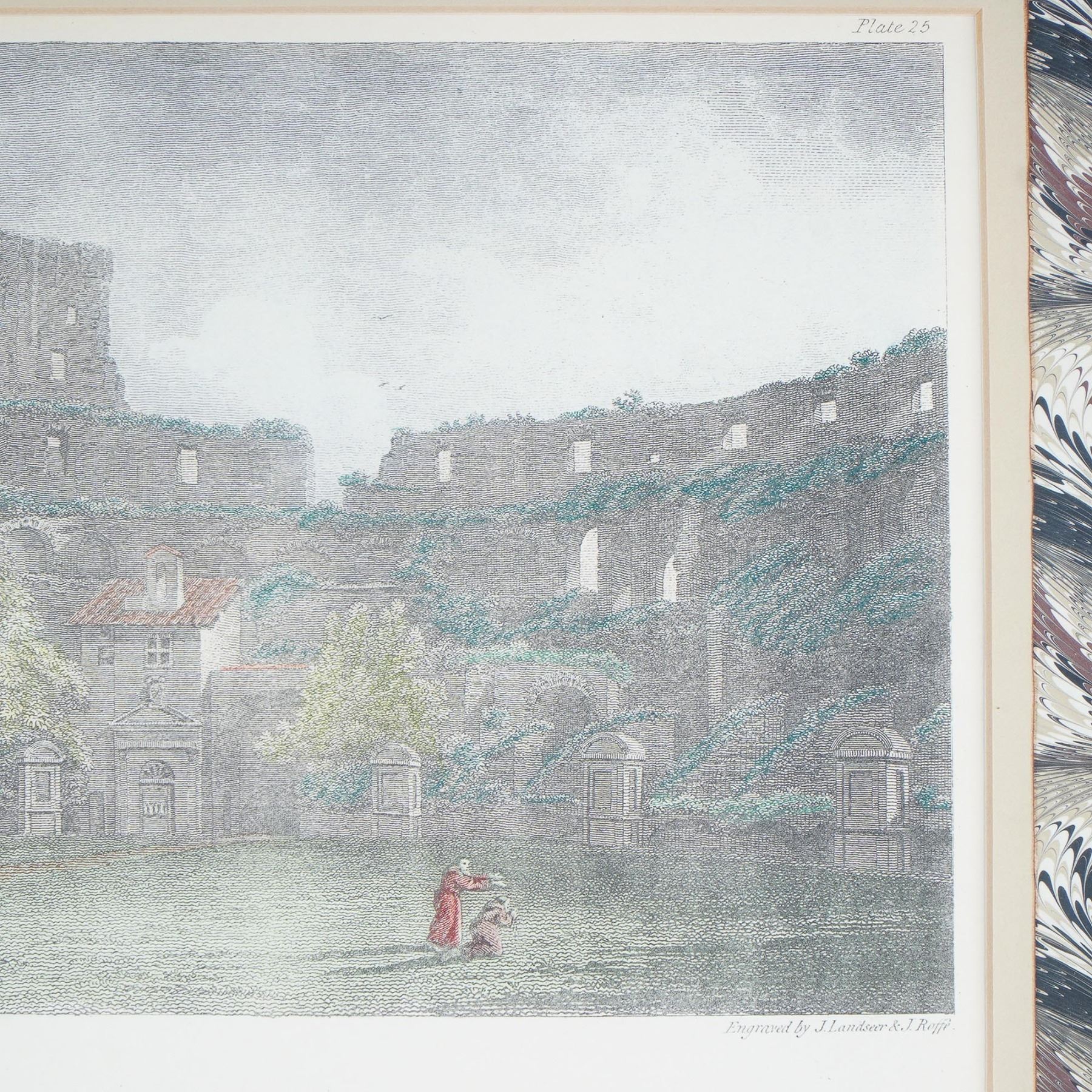 Hand-colored engraving titled Inside View of the Coliseum, drawn by J. Smith and engraved by J. Landseer and J. Roffe. Print marked Plate 25. This detailed print presents a romanticized 19th-century view of the interior of the Roman Colosseum, with lush vegetation and period figures conveying the serene grandeur of the ancient ruin. The print is handsomely framed with a wide marbled inner mat and giltwood frame. Informational labels and documentation mounted to the reverse provide historical context and provenance, including reference to the work's original publication in Select Views of Italy.
