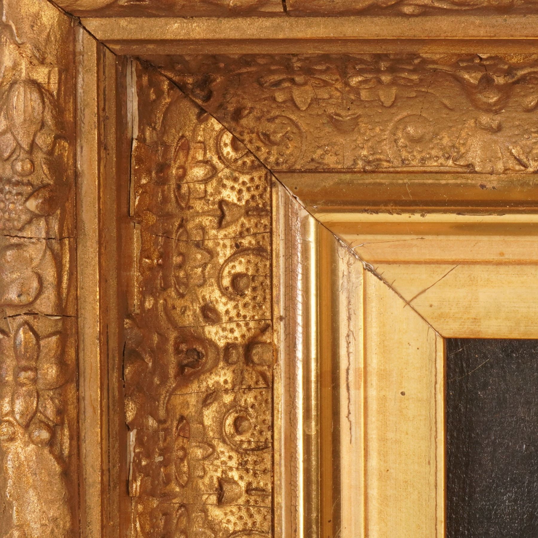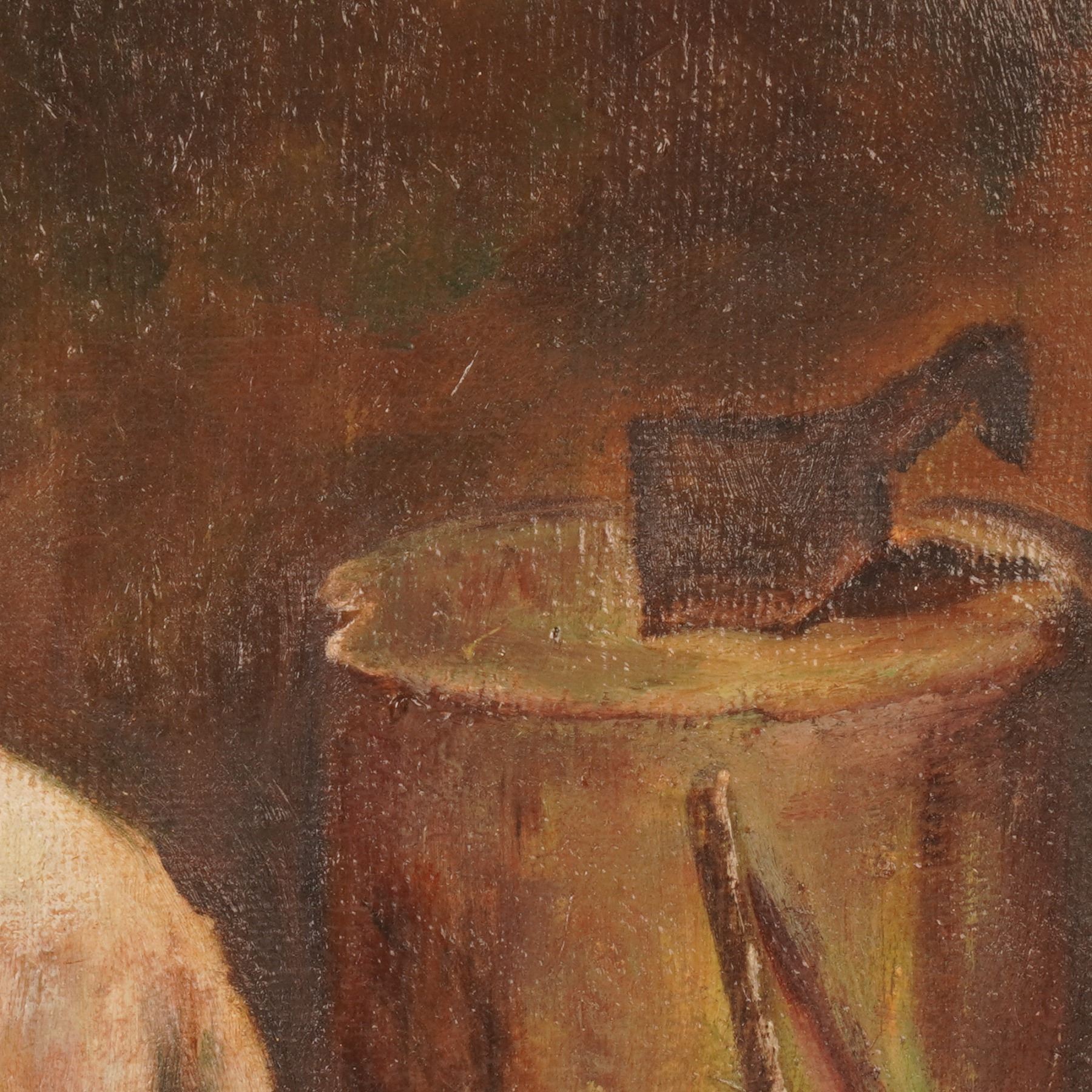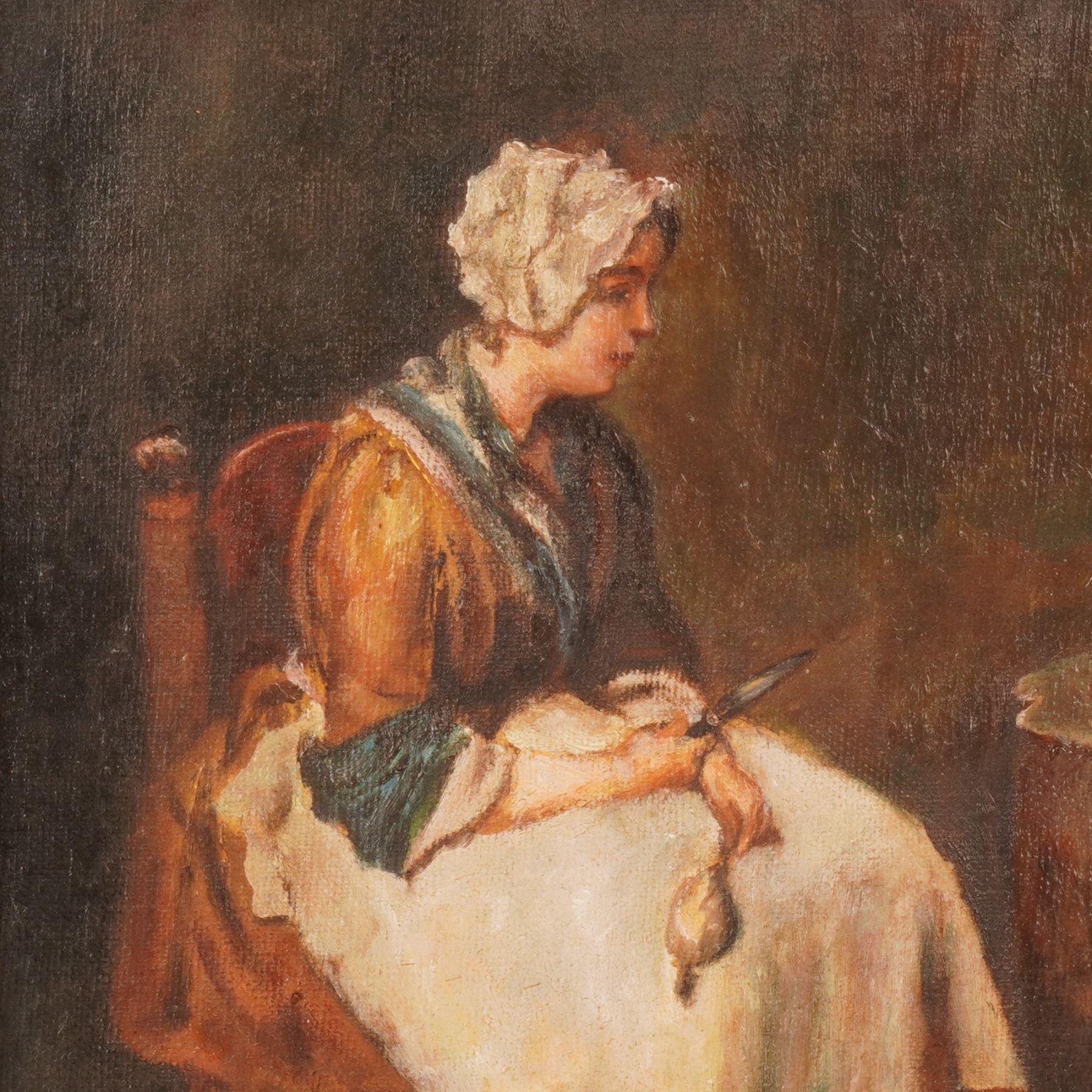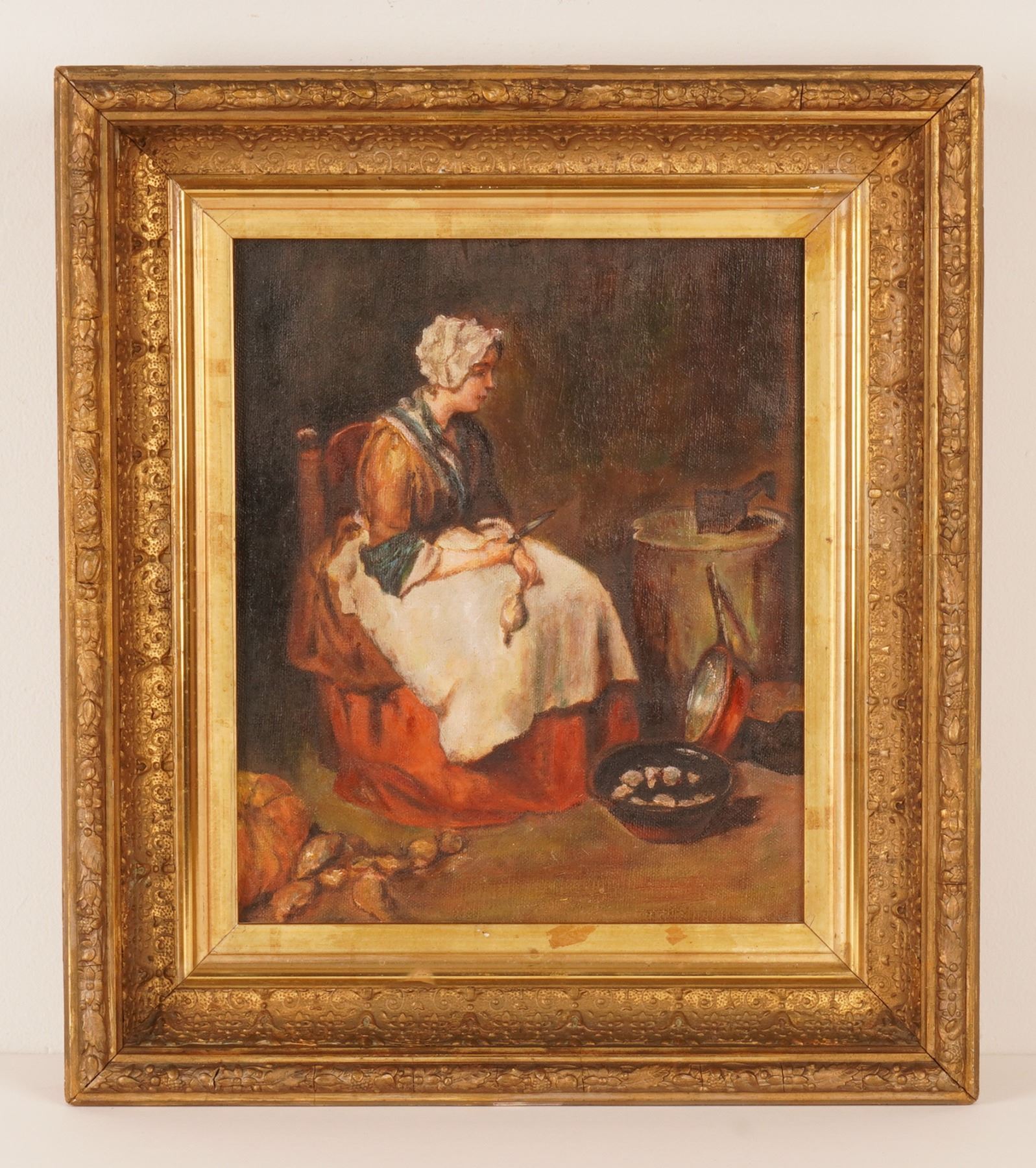 An evocative 20th century interpretation after Chardin's celebrated The Kitchen Maid (1738), masterfully capturing the quiet dignity of domestic life. The seated maid, absorbed in peeling vegetables beside a hearth, embodies Chardin's characteristic sensitivity to light, texture, and humble subject matter. The artist skillfully conveys the soft interplay of warm earth tones and subtle chiaroscuro, echoing the French master's timeless genre scenes. The work is presented in a richly ornamented giltwood frame with intricate floral and foliate detailing, consistent with period taste.