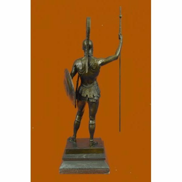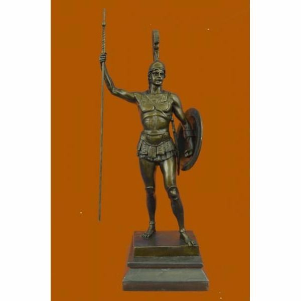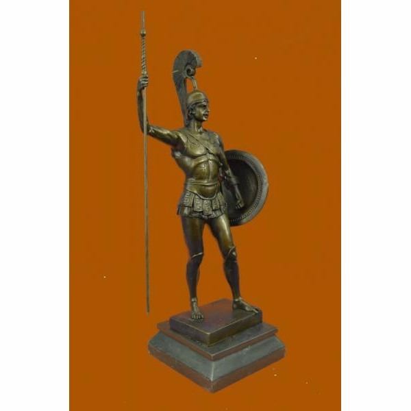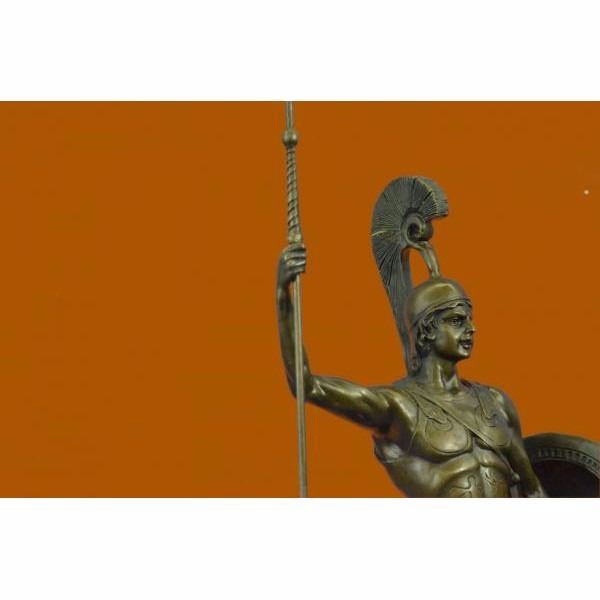 German bronze figure modeled as the mythological warrior Achilles, dressed in Hoplite uniform including helmet, by J. Gotz (Johannes Gotz, German, 1865-1934), The bronze handmade sculpture was cast using the ancient method of lost-wax casting and stained with a brown patina finish for preservation. It is mounted upon a black variegated marble base with the artist J. Gotz signature. Condition : This sculpture is in perfect condition. Bronze Dimensions with Marble Base:Height 19,5" x Width 8 " Marble Dimensions: 6" X 6" Height without base: 16.5" Weight : 14 LBS Inventory : 45YRD11278054