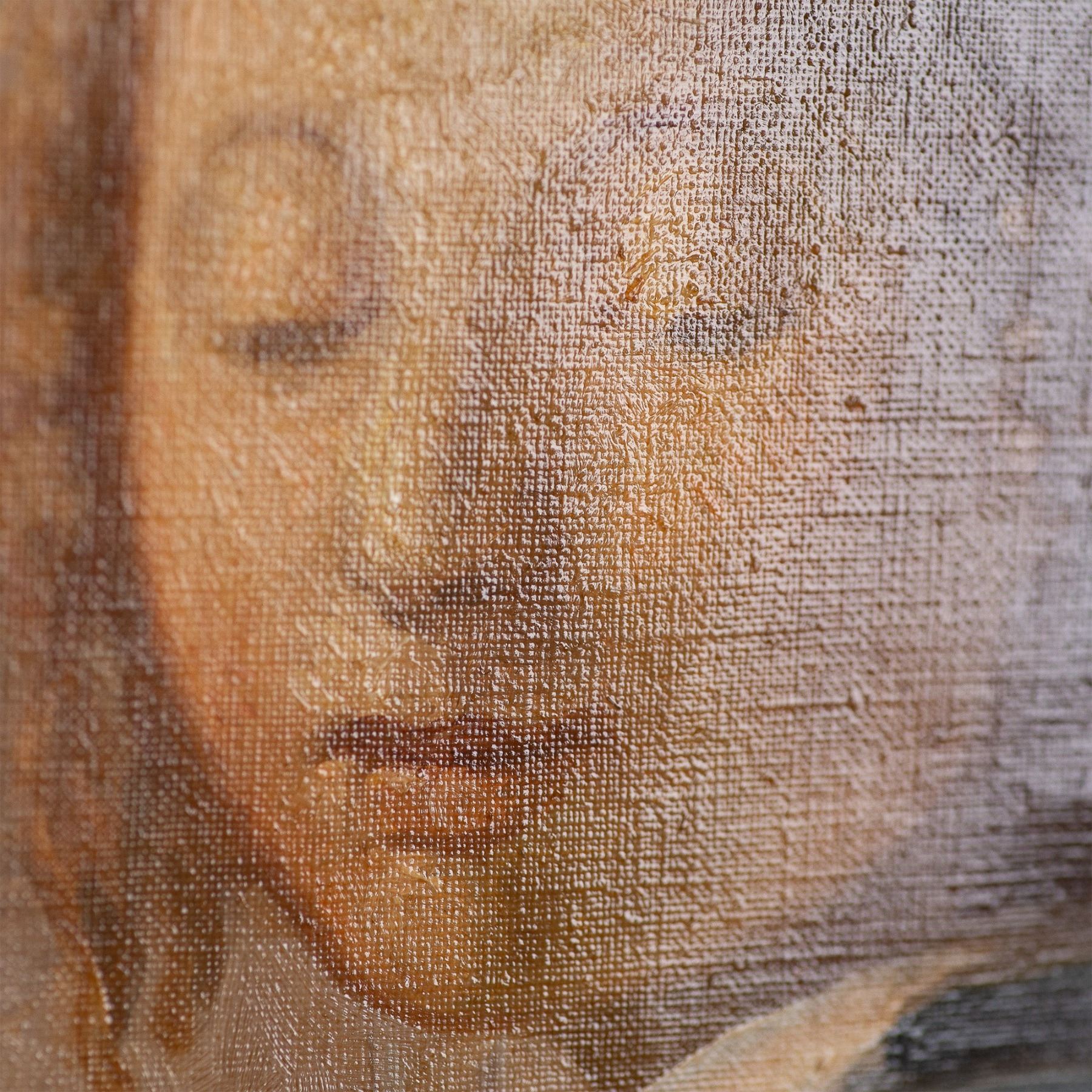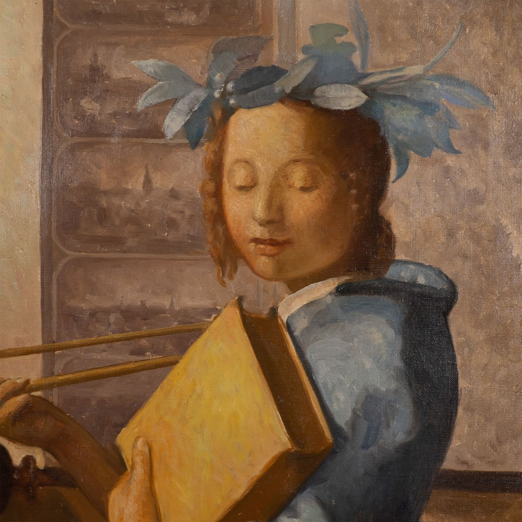 This elegant oil on canvas painting, inspired by Johannes Vermeer's The Allegory of Painting (also known as The Art of Painting), captures the timeless beauty and craftsmanship of the Dutch Golden Age. The artwork depicts a woman holding a book and a trumpet, symbolizing the muse of Clio, in a moment of still contemplation. Dressed in a sumptuous blue gown, she is bathed in soft light, accentuating the folds of her garment and the delicate features of her face. The painting is rendered with exquisite attention to detail, emulating Vermeer's iconic use of light and shadow to create depth and atmosphere. The subtle color palette and meticulous technique evoke a serene and introspective mood, making this painting a stunning homage to one of Vermeer's most celebrated works. Signature on lower right: illegible. Housed in a gilded frame. Artwork dimensions: 19"L x 24.75"H. Frame dimensions: 23"L x 29"H x 1.50"W.