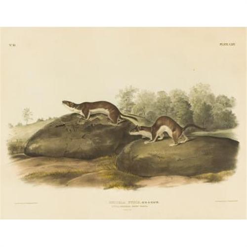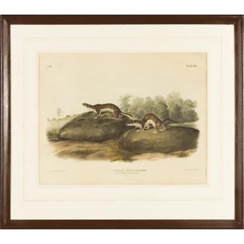 <B>After JOHN JAMES AUDUBON (American, 1785-1851)</B></I><BR><I>Mustela Fusca, Aud. & Bach., Little American Brown Weasel </B></I>(Plate LXIV)<BR>Color lithograph<BR>20 x 25-1/2 inches (50.8 x 64.8 cm)<BR>Printed by J.T. Bowen, Philadelphia, 1845<BR> <B>Condition Report:</B> Toning, some minor foxing, minor creasing to paper. Matted and framed, not examined out of frame.<BR><BR><b>Shipping:</b> Framed - with Glass, Medium (<a target="_blank" href="http://www.heritageauctions.com/common/shipping.php">view shipping information</a>)