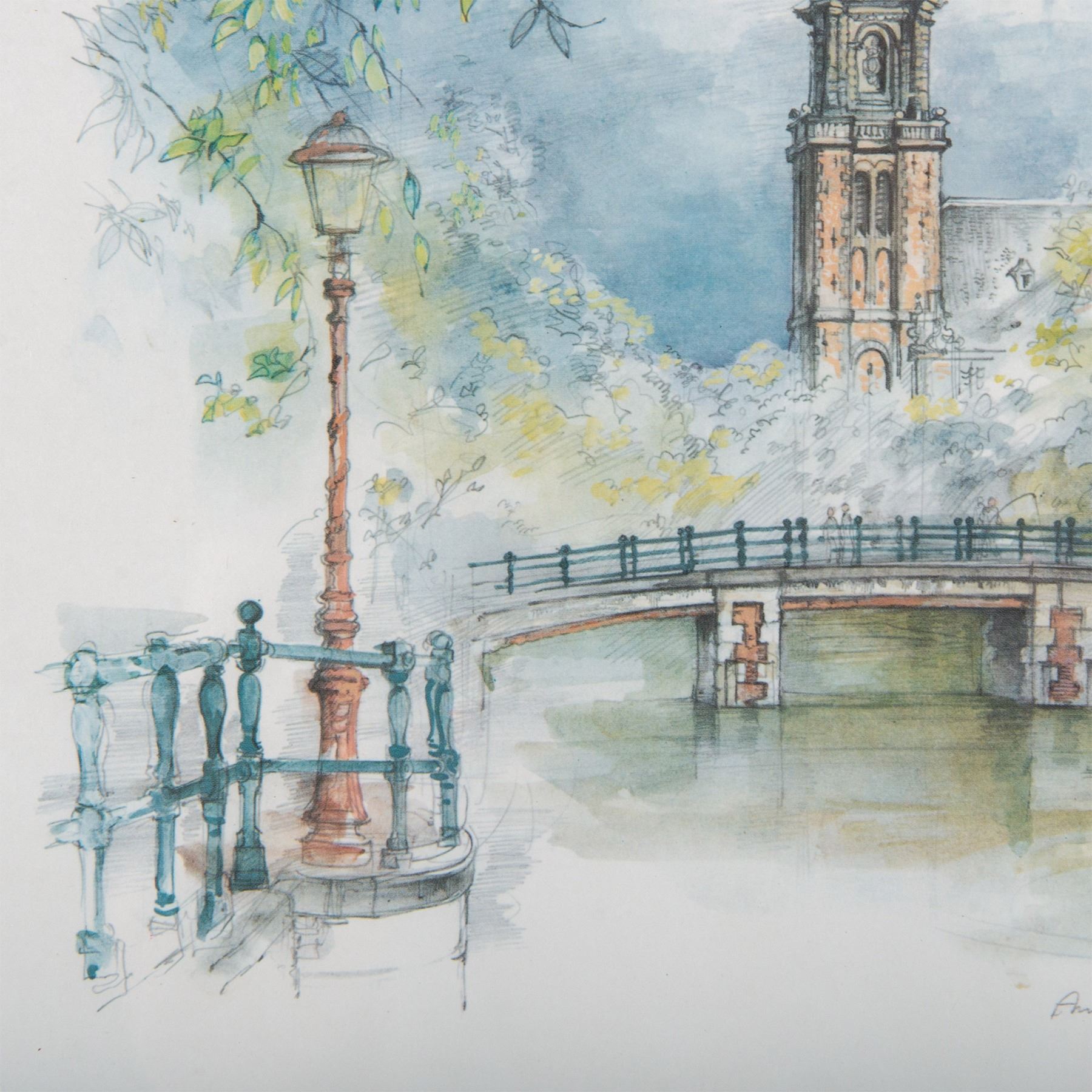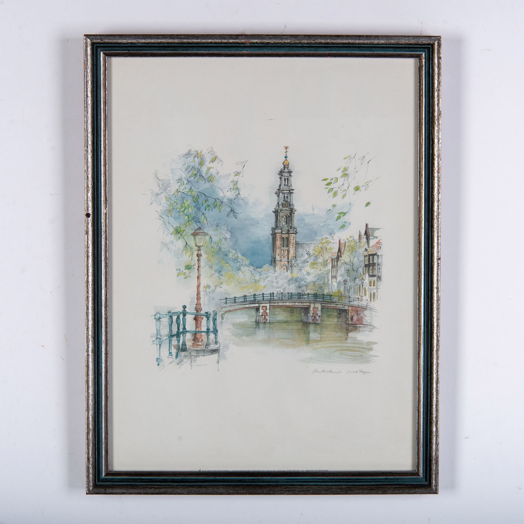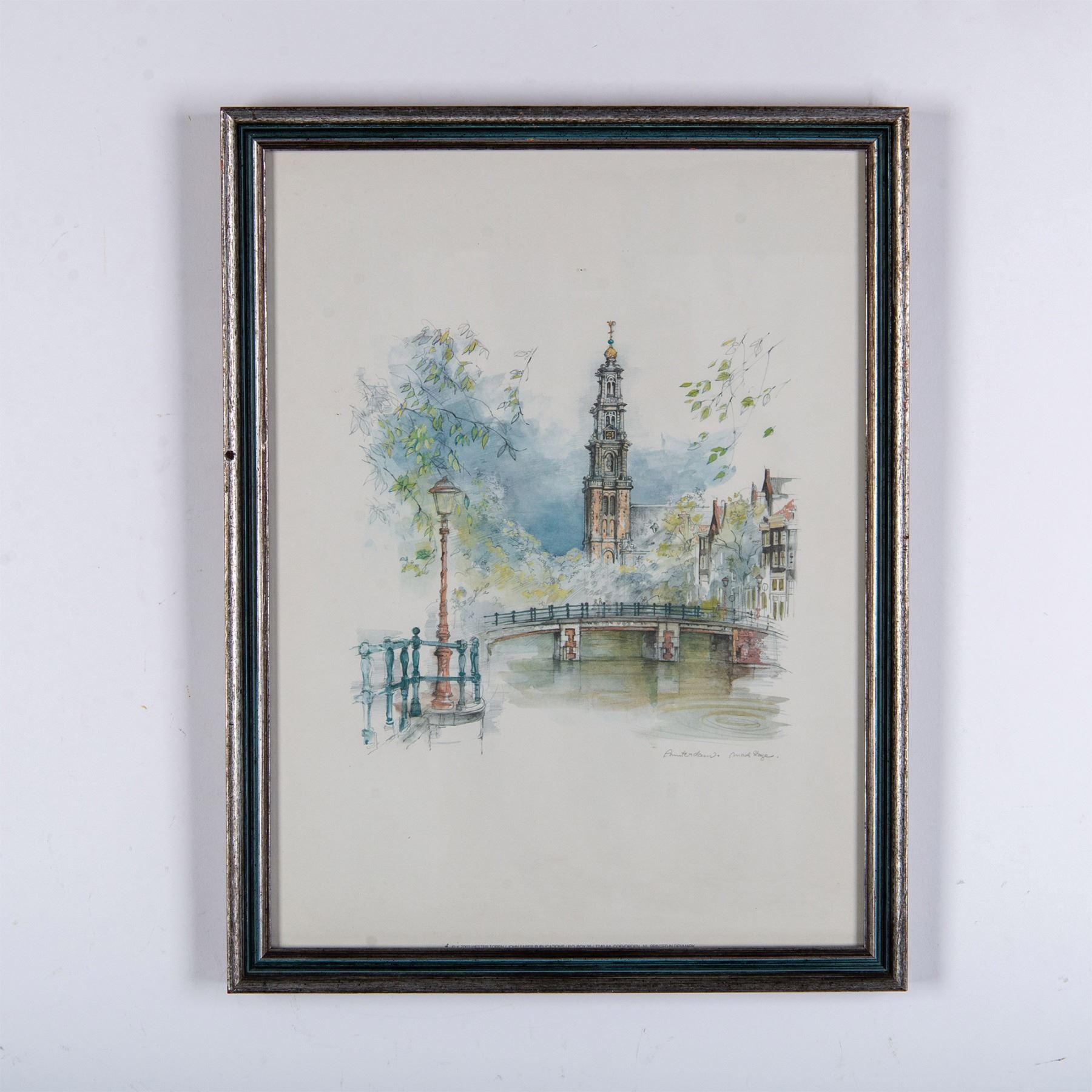 A color offset on paper after a watercolor painting by Danish artist Mads Stage depicting a canal in Amsterdam, with the Westerkerk Church in the background. Artists signature and title in plate on lower right side. Housed in a metallic-colored frame. Sight size: 11.25"L x 15.25"H. Frame dimensions: 13"L x 1"W x 17"H. Artwork can be unframed and rolled for shipment.