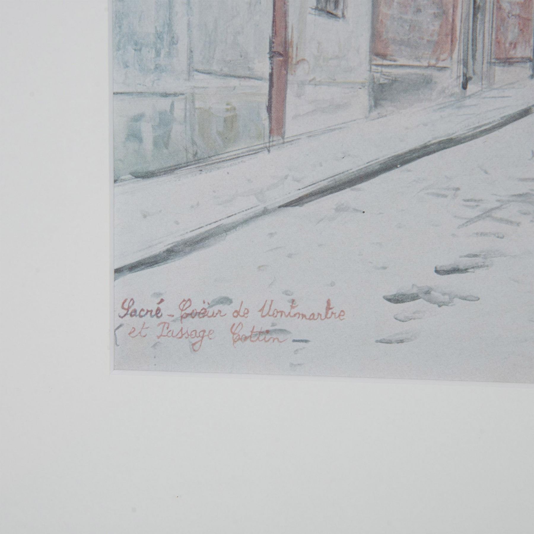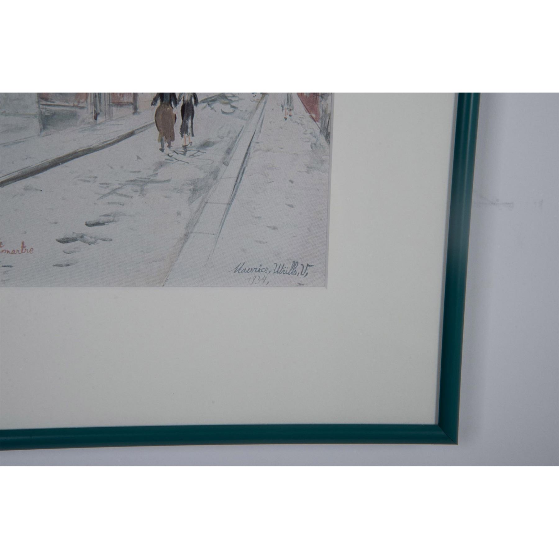 Full-color offset lithograph on paper depicting a Street Scene in Montmartre after School de Paris artist Maurice Utrillo's original oil painting. Signature in plate on lower right: Maurice Utrillo, V. Housed in a modern cyan frame with a white mat. Sight size: 6.50"L x 9.75"H. Frame dimensions: 12.25"L x 15.75"H x 1"W.