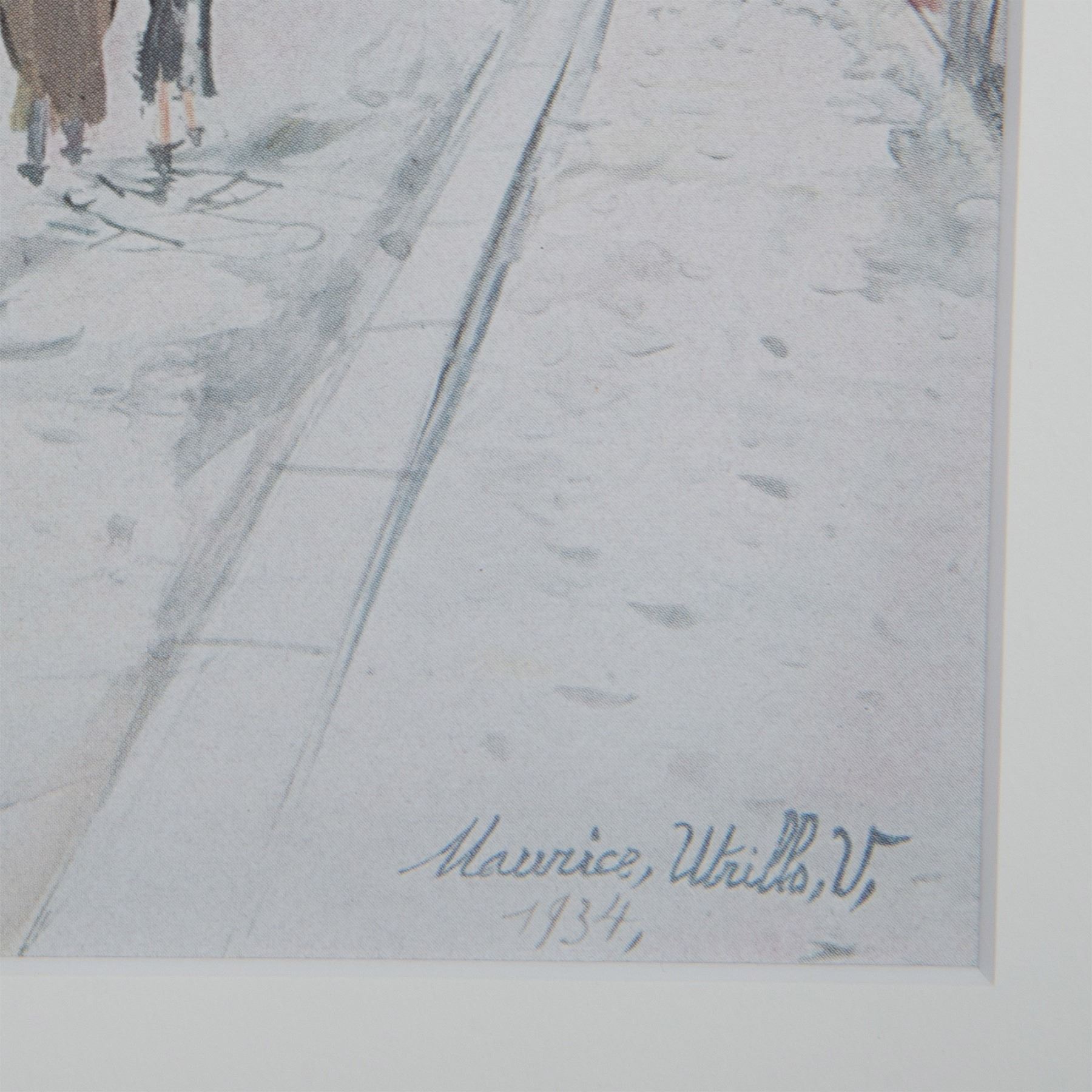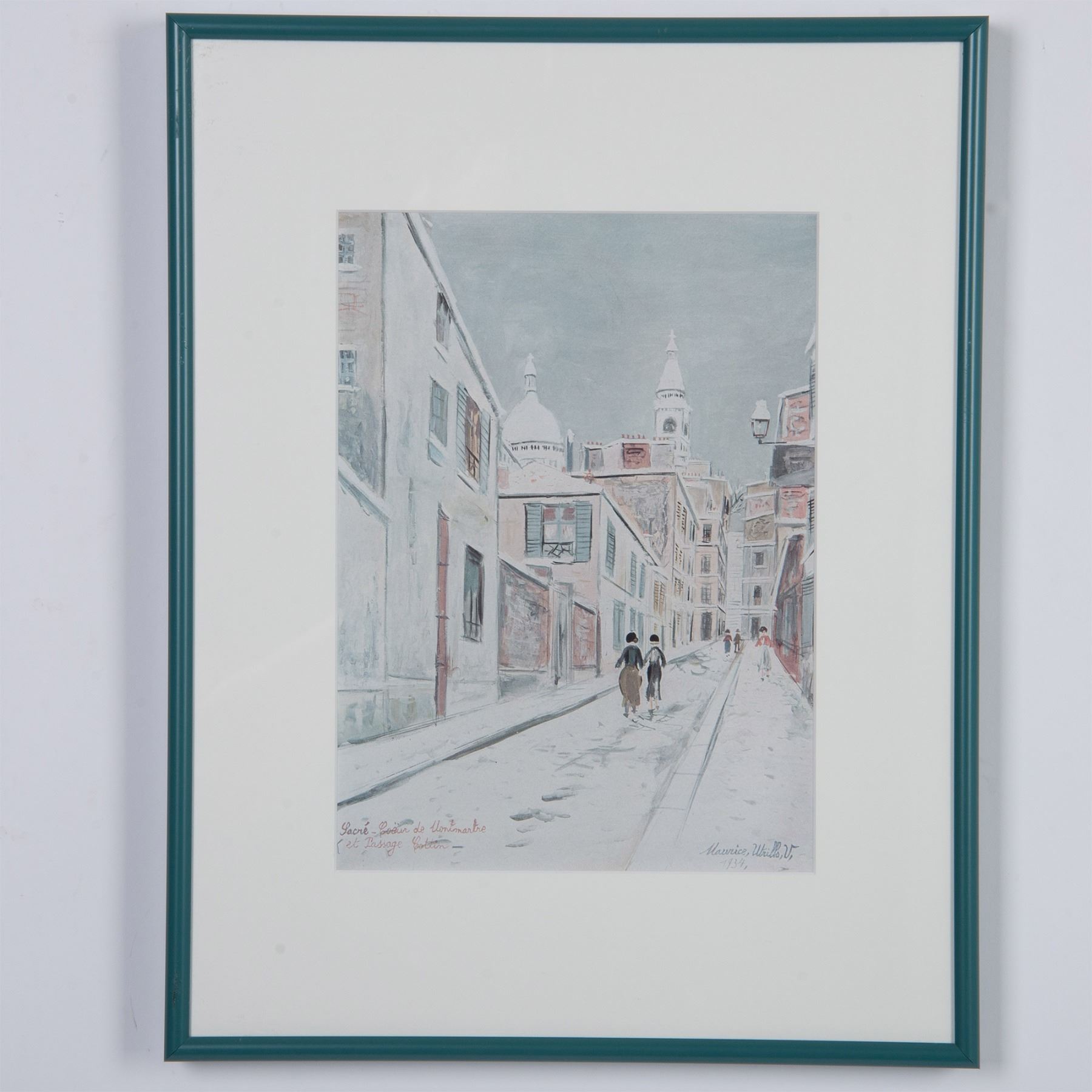 Full-color offset lithograph on paper depicting a Street Scene in Montmartre after School de Paris artist Maurice Utrillo's original oil painting. Signature in plate on lower right: Maurice Utrillo, V. Housed in a modern cyan frame with a white mat. Sight size: 6.50"L x 9.75"H. Frame dimensions: 12.25"L x 15.75"H x 1"W.