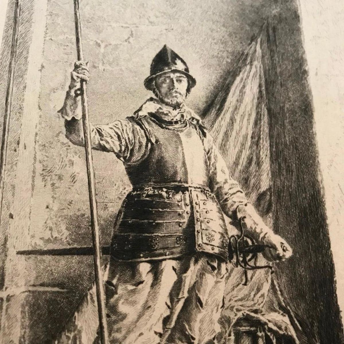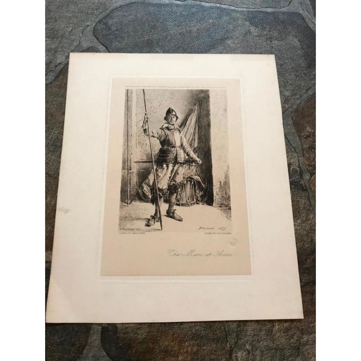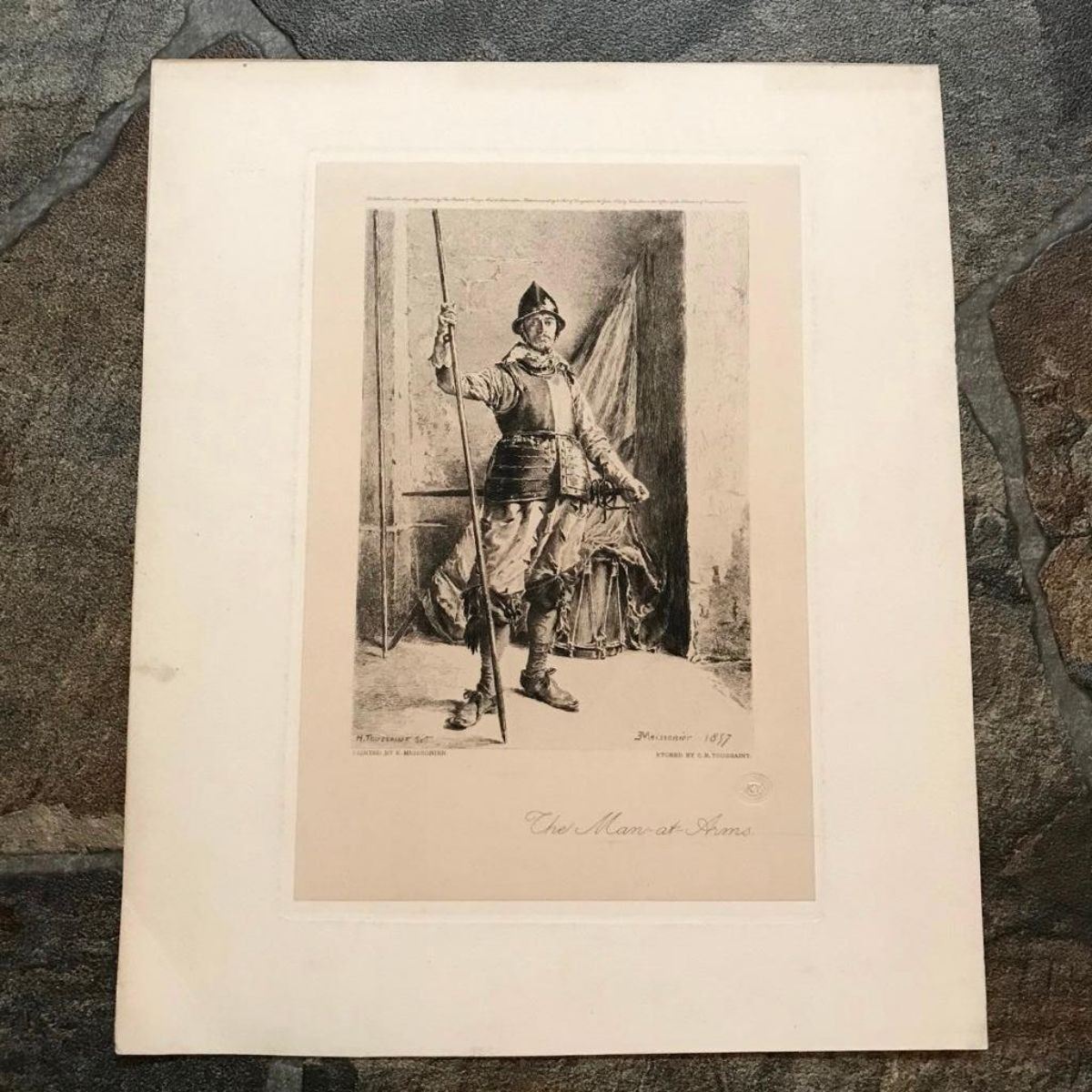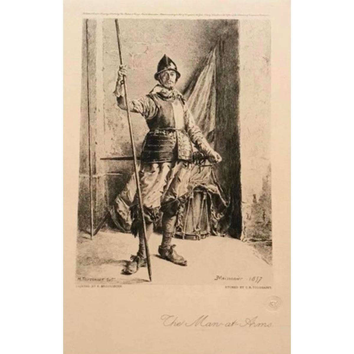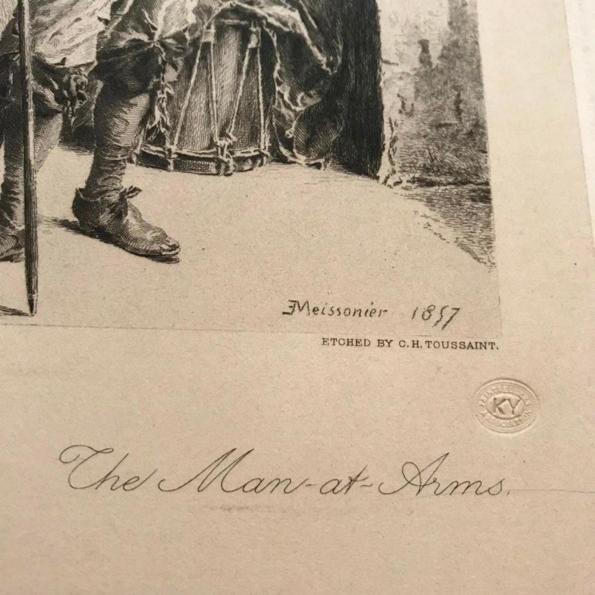 After E. Meissonier 1857, H. Toussaint etching "The Man At Arms" with Printsellers Association embossed Stamp. 10" X 12".Â