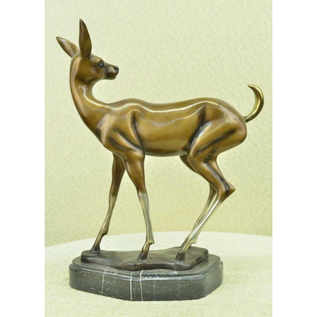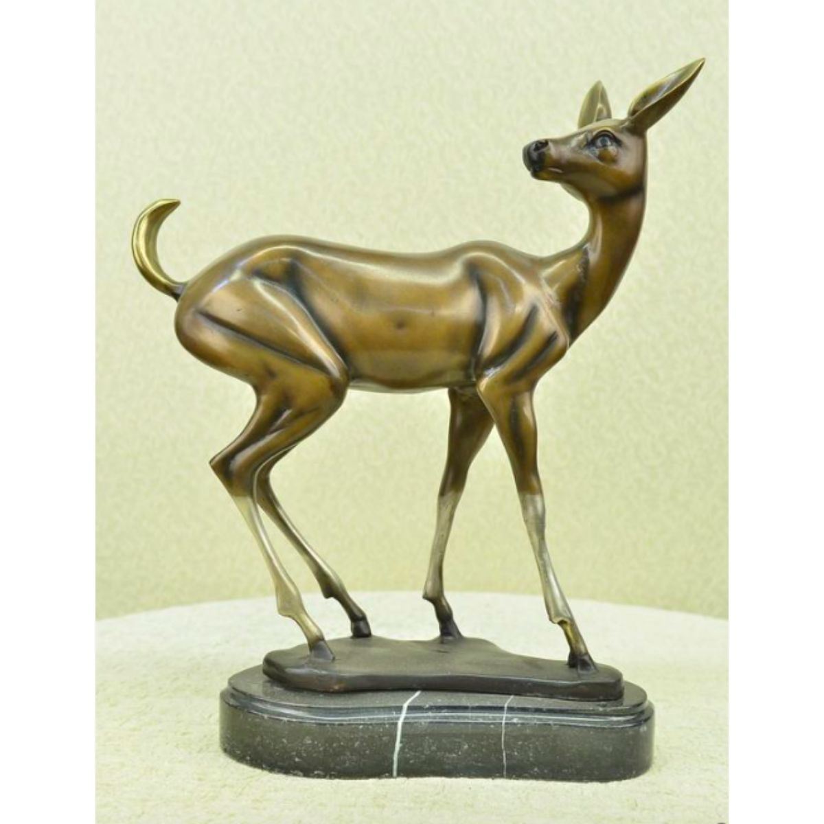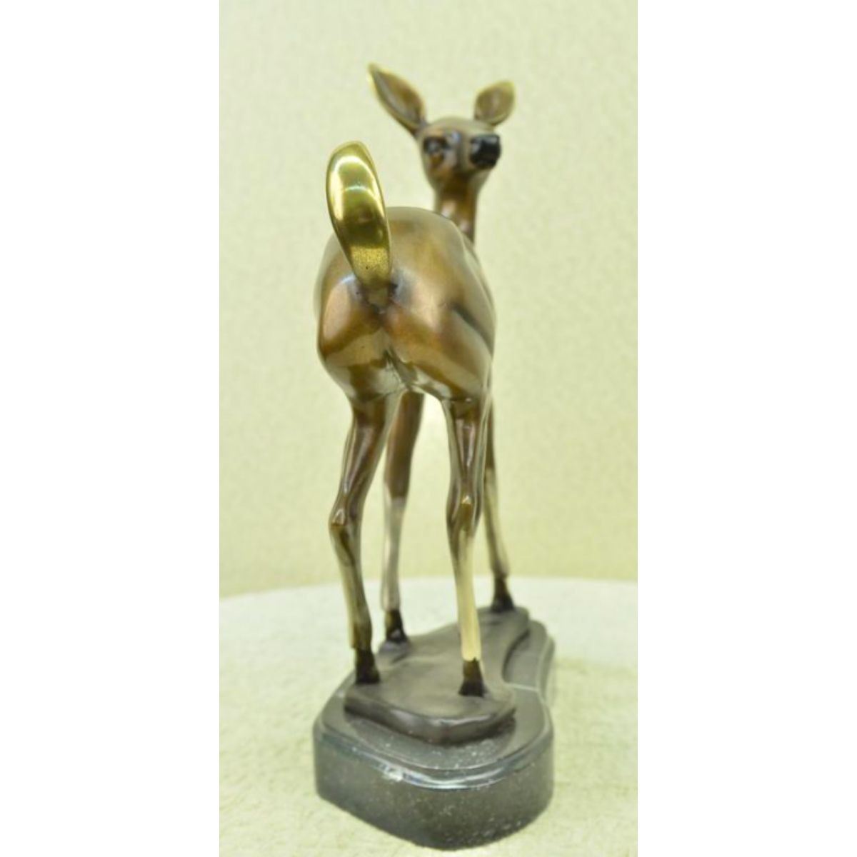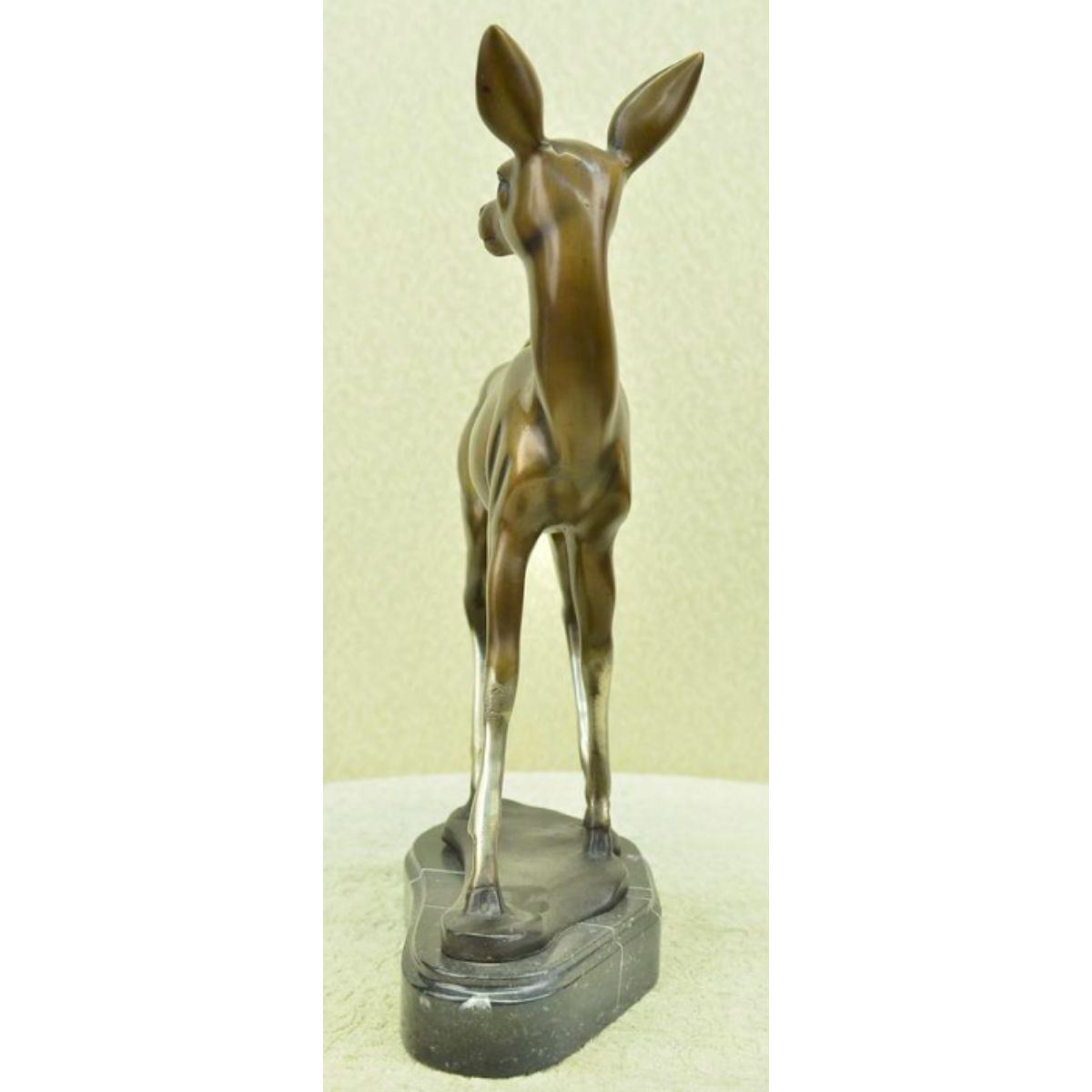 Little Fawn sculpture by French artist Moignez, lost wax casting method bronze, with hand-painted two-tone brown & silver patina, mounted on a marble base. 16" H X 14" W. 13lbs.