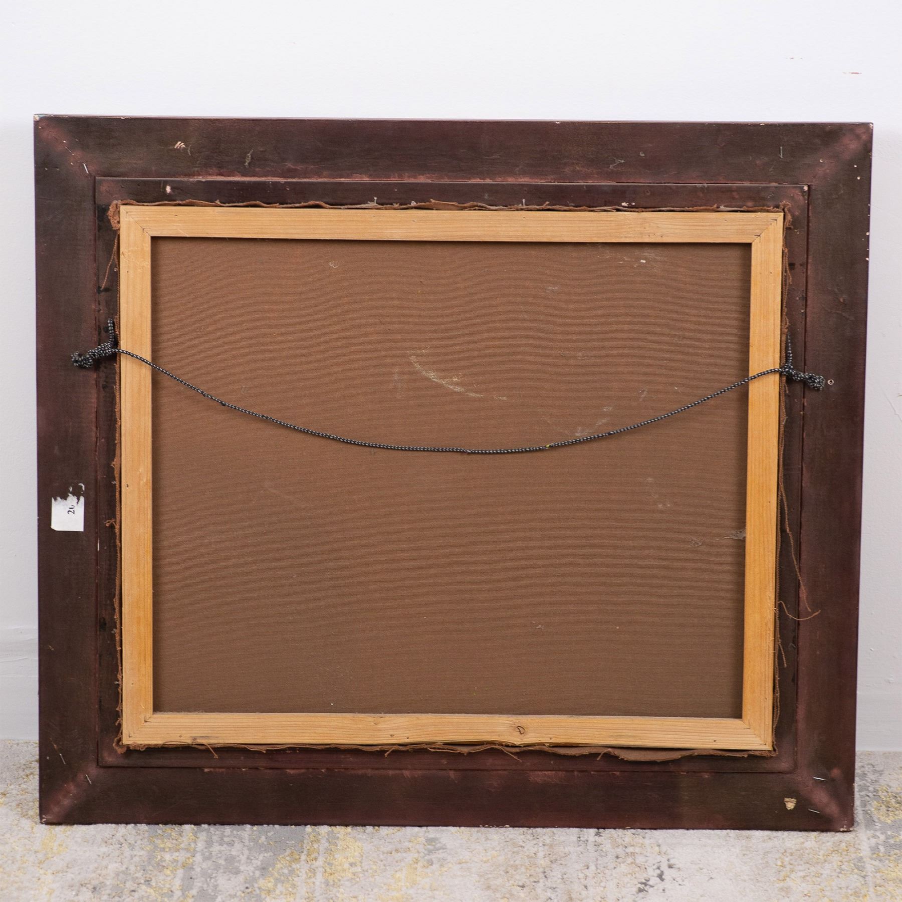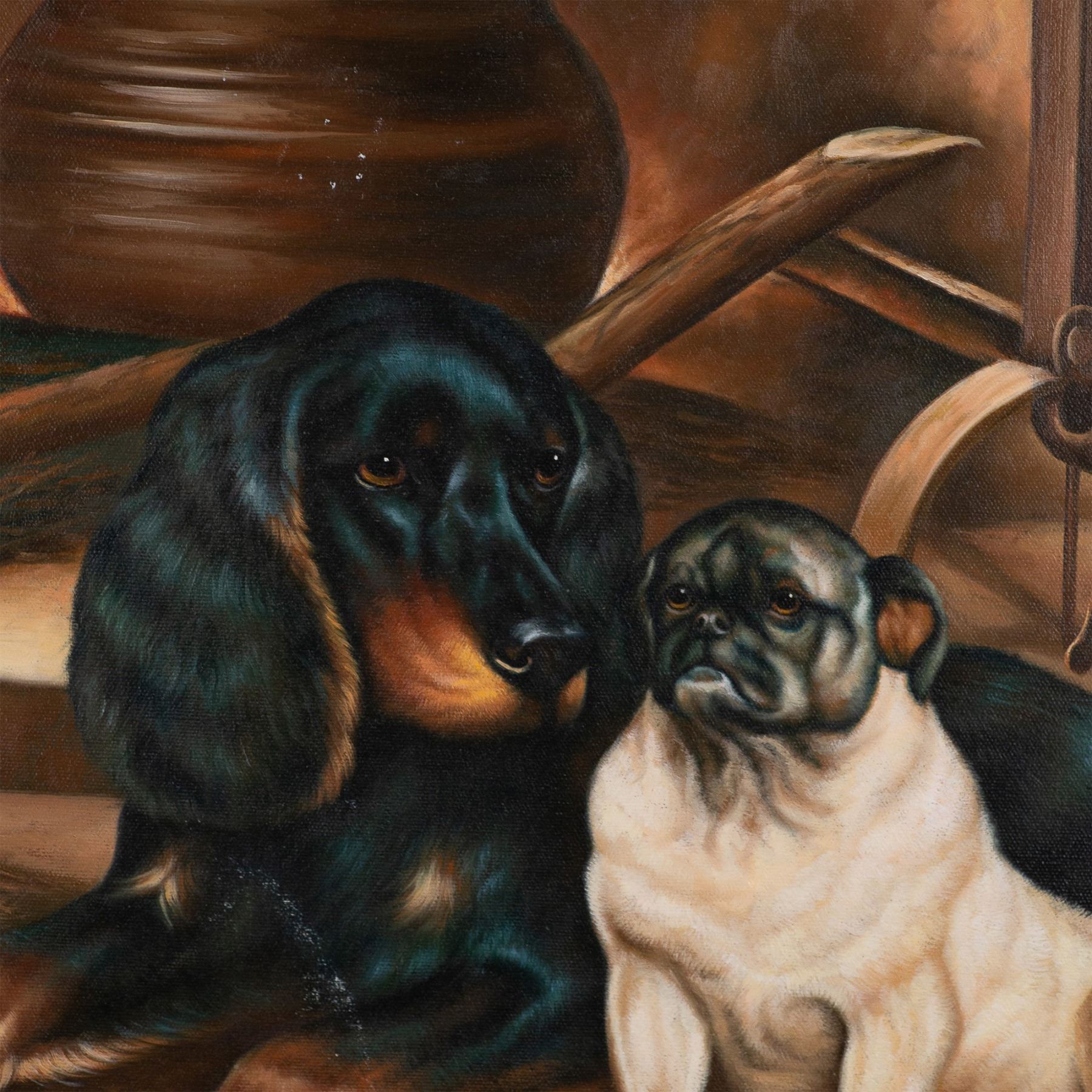 This charming oil on canvas is inspired by Danish artist Otto Bache's 1865 original painting Spaniel and Pug. Bache was known for his mastery in animal depictions and historical scenes. He gained recognition for his ability to infuse his subjects with a sense of life and movement, as seen in his works featuring domestic animals. This version features a beautifully detailed depiction of a Spaniel and a Pug resting in a rustic interior setting. The artist skillfully captures the distinct personalities of the dogs-the Spaniel, with its glossy black coat and gentle expression, and the Pug, seated proudly beside its companion, embodying loyalty and companionship. The warm, earth-toned palette highlights the rich textures of the setting, including a woven rug, wooden tools, and the sturdy, cozy atmosphere of the interior. Housed in a gilded frame. Artwork dimensions: 23.50"L x 19.50"H. Frame dimensions: 30.50"L x 26.50"H x 2"W.