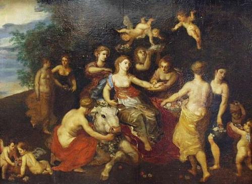 After PIETER VAN AVONT (1600-1632) Flemish school. "Abduction of Europa". An important 18th century oil on wood panel depicting a mythological scene with figures, putti and Zeus in the form of a bull. 17" x 23 1/2". In elaborate gilt frame. Ref. Benezit, vol. 1, page 307. 15000-18000