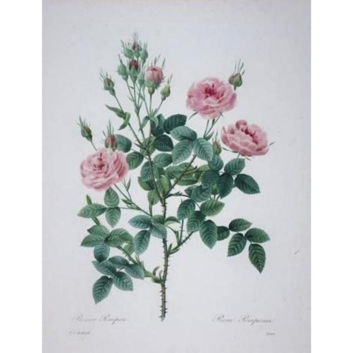 Modern print, after Pierre-Joseph Redoute ( French 1759-1840 ) Original Redoute stipple engravings with hand-coloring bring thousands of dollars per print. This modern re-print was created in the 1980's. 11" X 14". Comes with mat & backboard ready to frame. Redoute is unquestionably the best-known botanical illustrator of any era. The decorative appeal of his original engravings led to their modern reproduction, which in turn popularized Redoute's work in a way unique among botanical artists. Born into a family of artists in what is now Belgium, Redoute's talent was recognized & encouraged from an early age. Eventually, Redoute had, as pupils or patrons, five queens & empresses of France, from Marie-Antoinette to the Empress Josephine & her successor, Marie-Louise. Despite many changes of regime in a turbulent epoch, he worked without interruption, eventually contributing to over fifty works on natural history & archeology. The luminosity of stipple engraving, a technique perfected by Redoute, is particularly suited to the reproduction of botanical detail. The medium involved engraving a copper plate with a dense grid of dots that could be modulated to convey delicate gradations of color. Because the ink rested on the paper in miniscule dots, it did not obscure the "light" of the paper beneath the color. After this complicated printing process was complete, the prints were finished by hand in watercolor, so as to conform to the exquisite models Redoute provided. Â