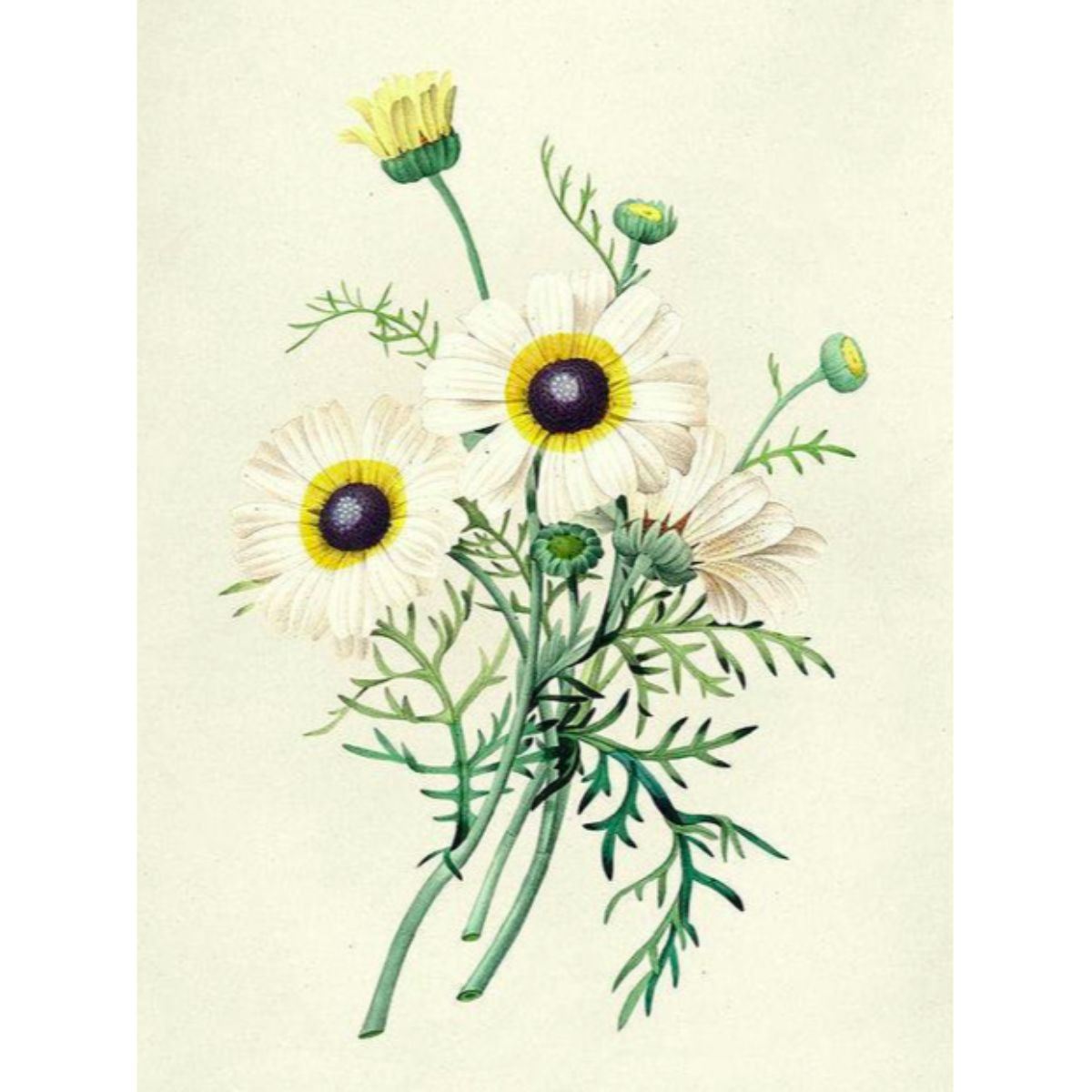 Modern print, after Pierre-Joseph Redoute ( French 1759-1840 ) Original Redoute stipple engravings with hand-coloring bring thousands of dollars per print. This modern re-print was created in the 1980's. 11" X 14". Comes with mat & backboard ready to frame. Redoute is unquestionably the best-known botanical illustrator of any era. The decorative appeal of his original engravings led to their modern reproduction, which in turn popularized Redoute's work in a way unique among botanical artists. Born into a family of artists in what is now Belgium, Redoute's talent was recognized & encouraged from an early age. Eventually, Redoute had, as pupils or patrons, five queens & empresses of France, from Marie-Antoinette to the Empress Josephine & her successor, Marie-Louise. Despite many changes of regime in a turbulent epoch, he worked without interruption, eventually contributing to over fifty works on natural history & archeology. The luminosity of stipple engraving, a technique perfected by Redoute, is particularly suited to the reproduction of botanical detail. The medium involved engraving a copper plate with a dense grid of dots that could be modulated to convey delicate gradations of color. Because the ink rested on the paper in miniscule dots, it did not obscure the "light" of the paper beneath the color. After this complicated printing process was complete, the prints were finished by hand in watercolor, so as to conform to the exquisite models Redoute provided. Â