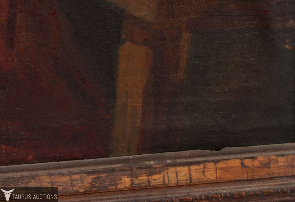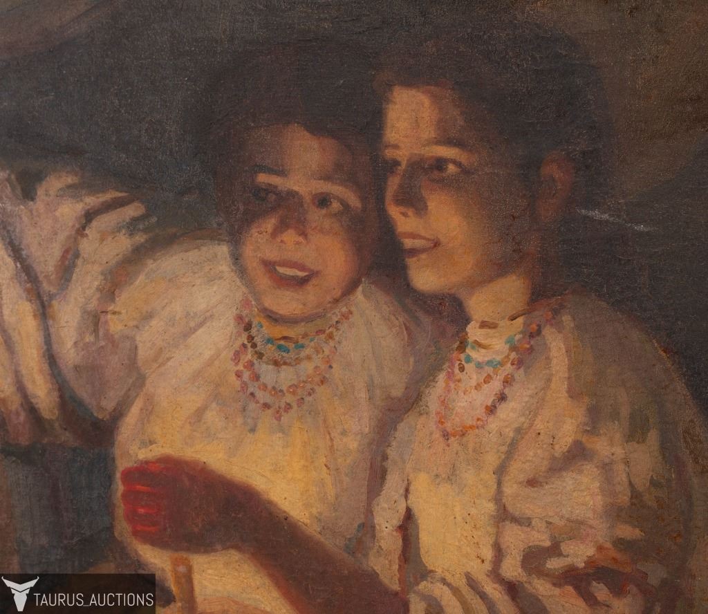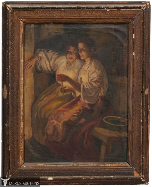 Item/Description: Antique oil painting after Mykola Kornylovych Pymonenko's Fortune-Telling on Christmastide. 1888. Unknown artist. Unsigned.