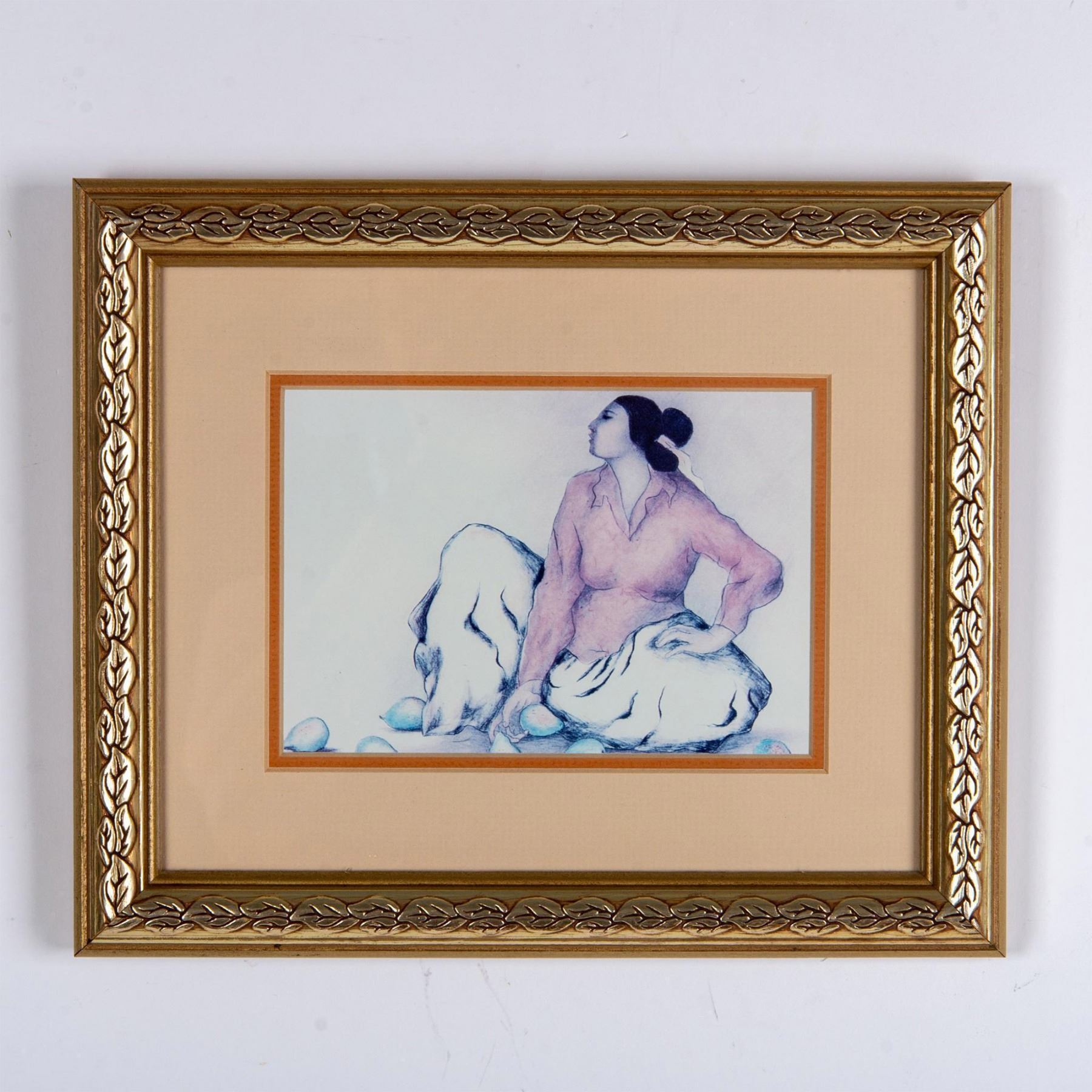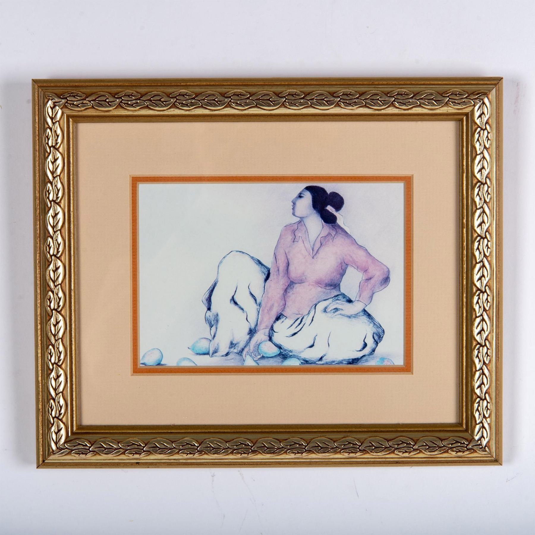 An offset print on paper after artist of the Navajo Nation, R.C. Gorman, depicting a seated woman with fruit laying beside her. Housed in a gilded leaf-patterned frame, with a beige mat with an orange border. Sight size: 6.5"L x 4.5"H. Frame dimensions: 11.75"L x 1.25"W x 10"H. Artwork can be unframed and rolled for shipment.