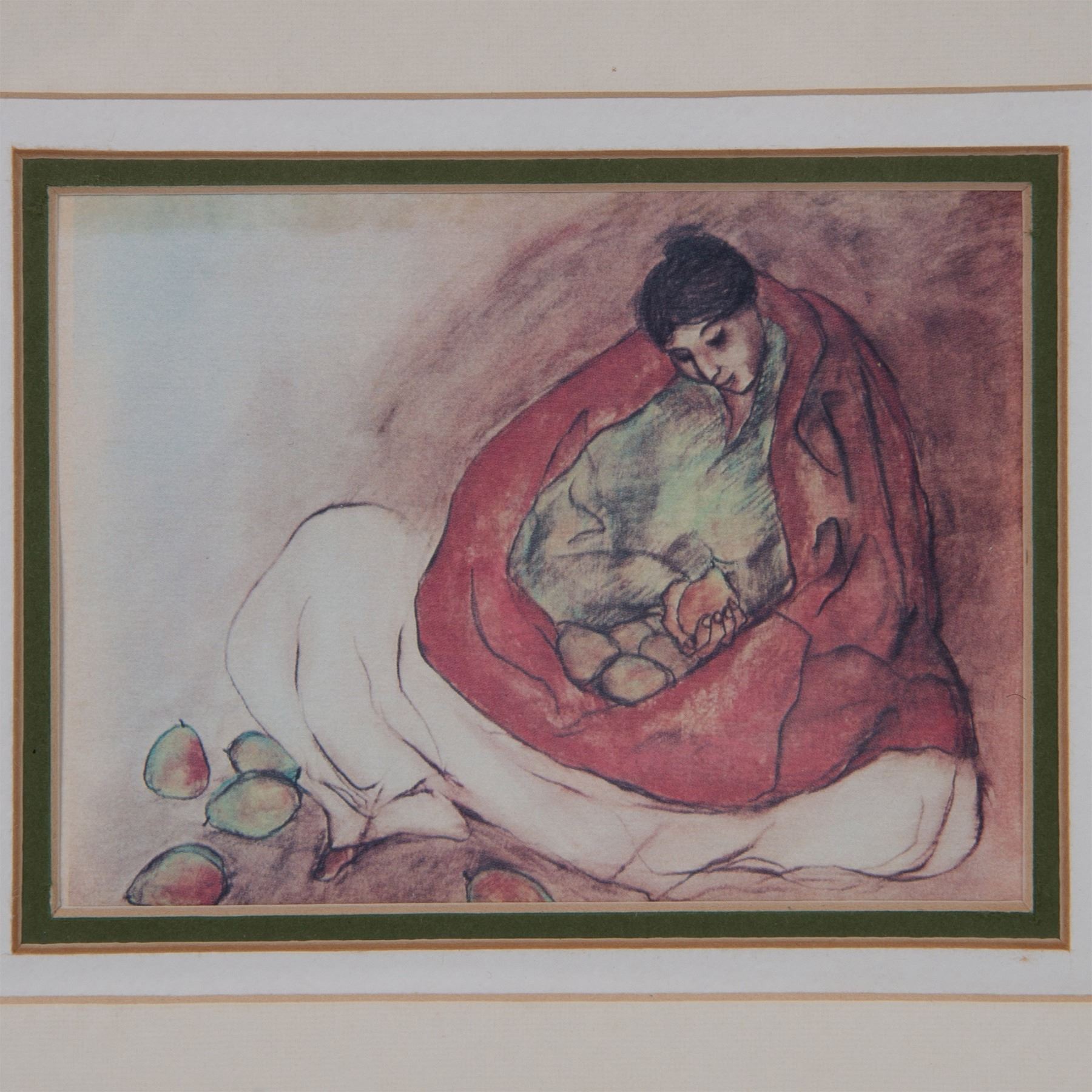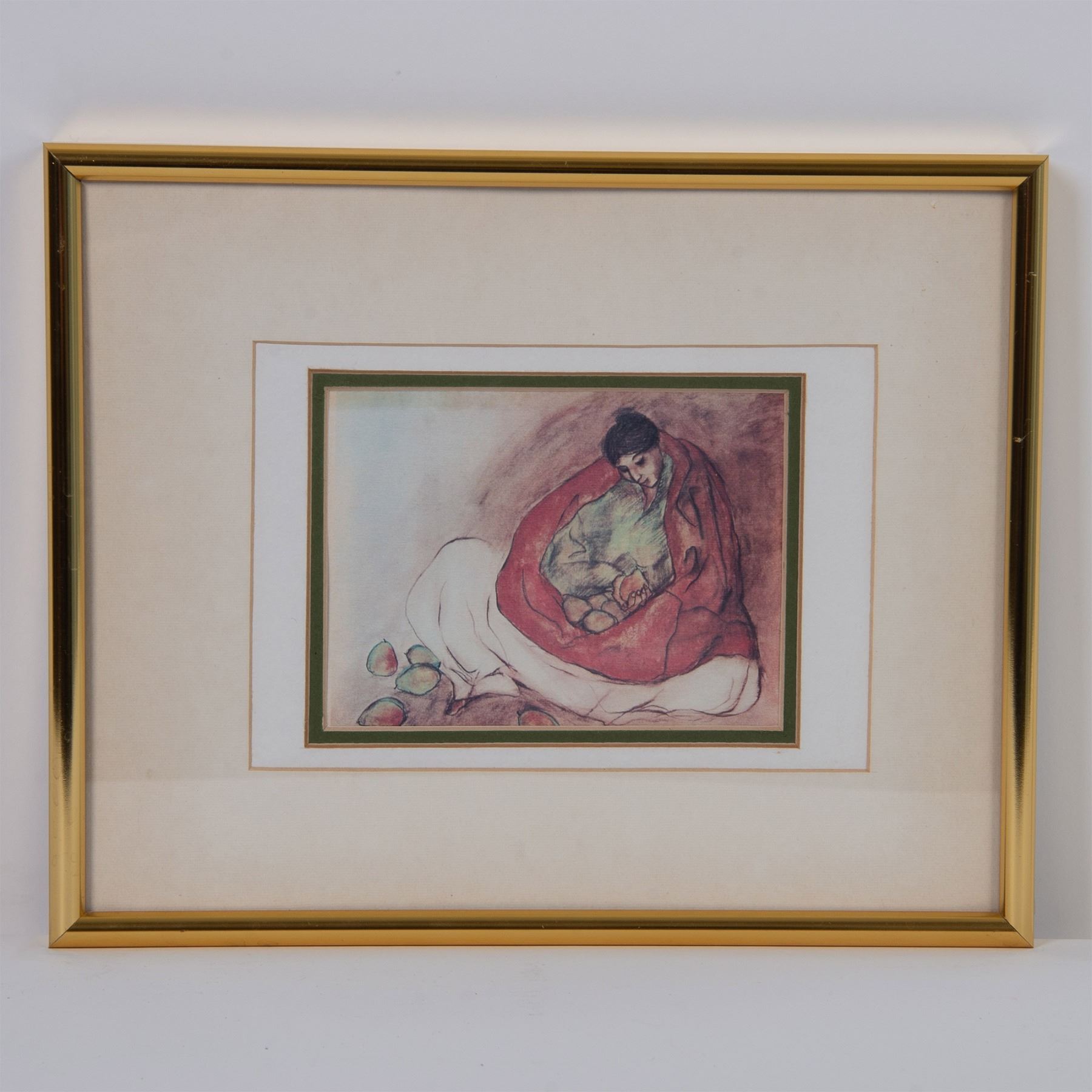 An offset print on paper after artist of the Navajo Nation, R.C. Gorman, depicting a seated woman with fruit on her lap and laying beside her. Housed in a gilded frame, with a beige, white and green mat. Sight size: 4.75"L x 3.5"H. Frame dimensions: 10.5"L x 1"W x 8.5"H. Artwork can be unframed and rolled for shipment.