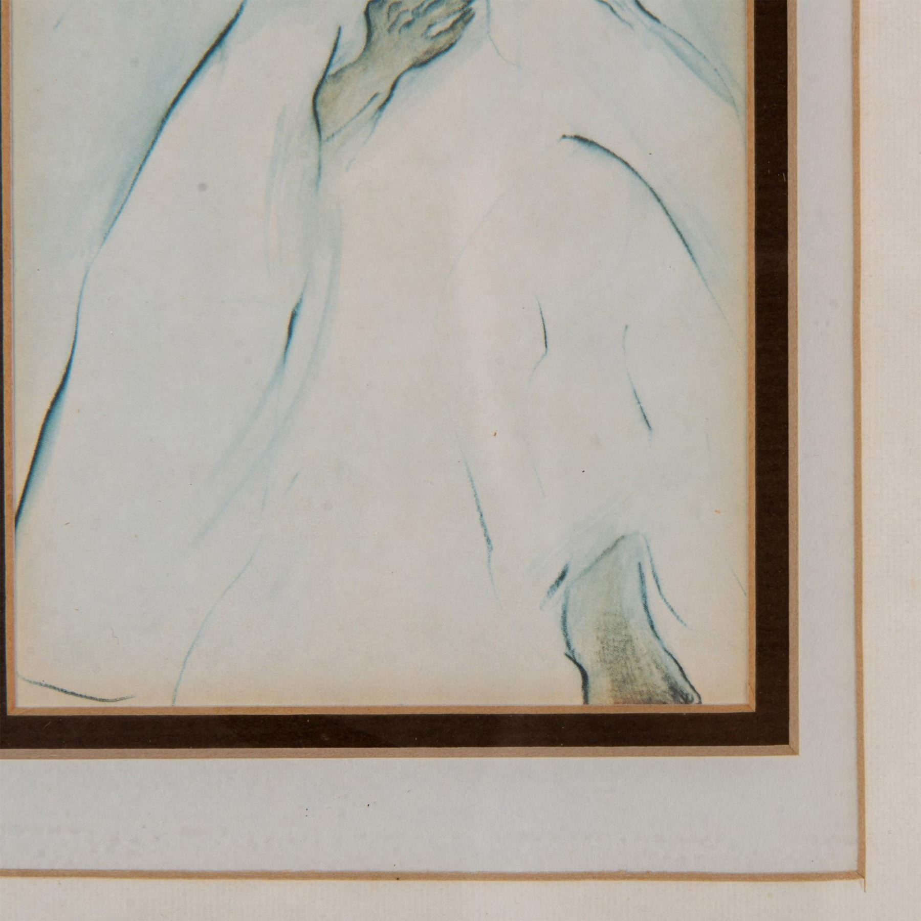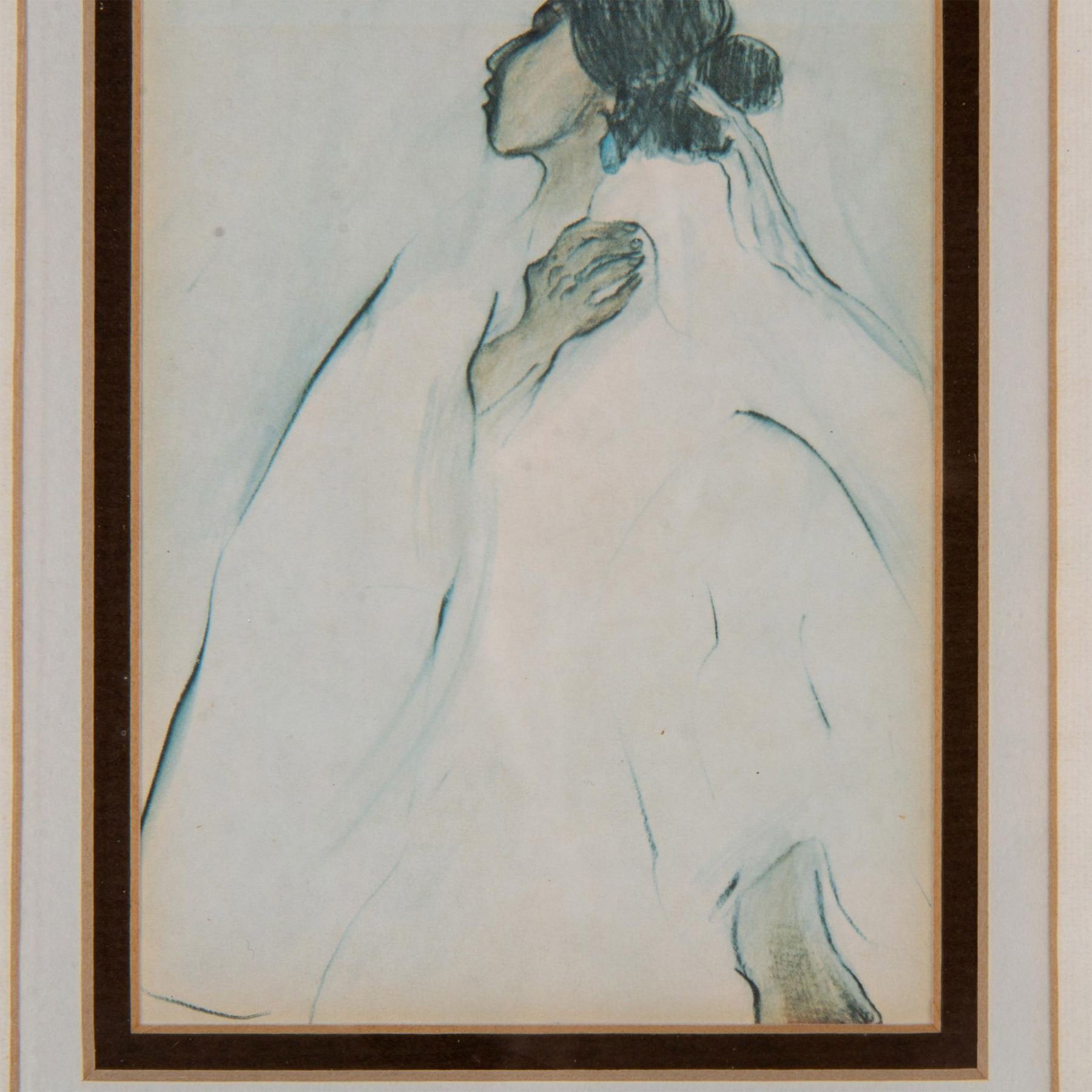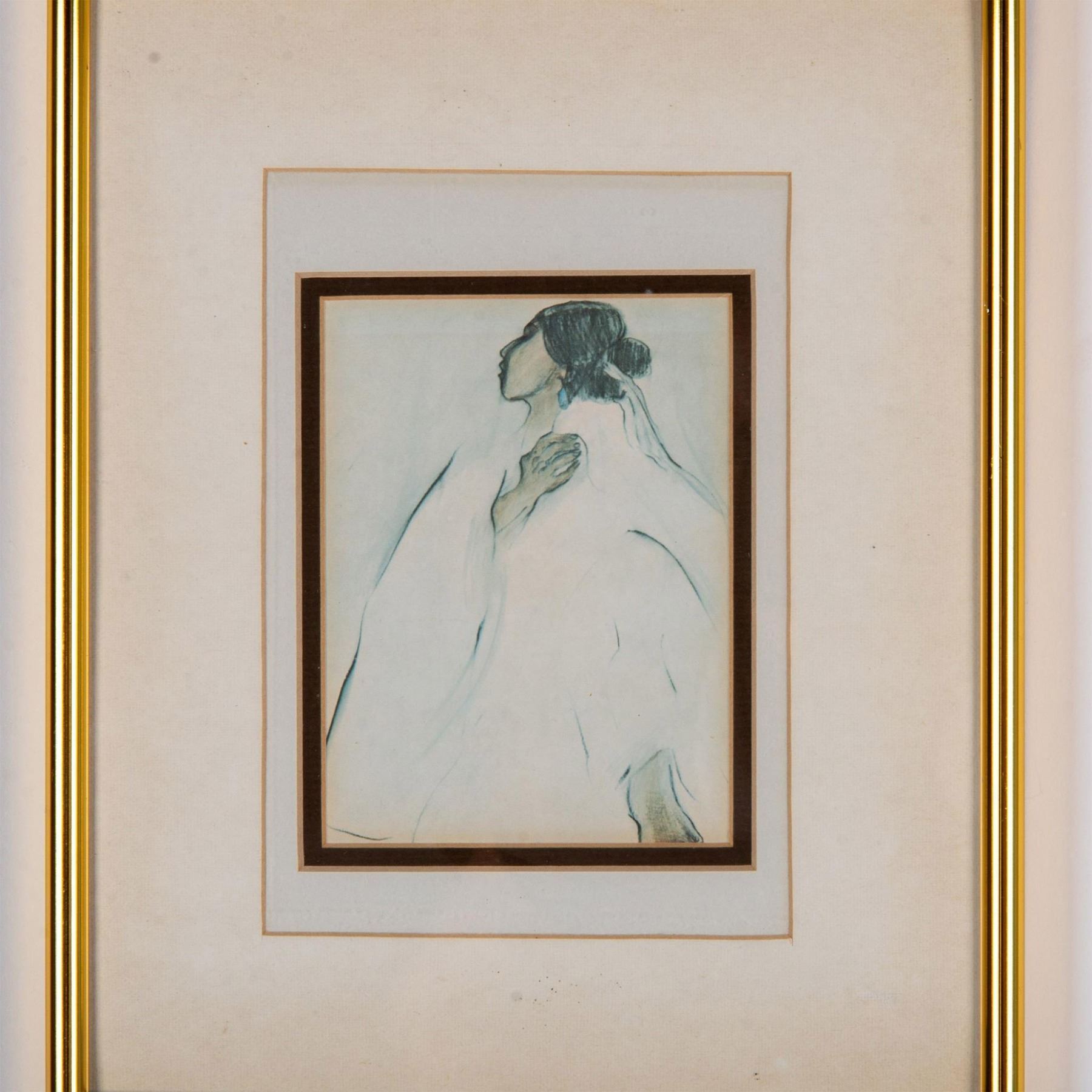 An offset print on paper after artist of the Navajo Nation, R.C. Gorman, depicting the side profile of a woman dressed in white. Artists signature and date in plate on lower left. Housed in a gilded frame, with a white mat with a brown border. Sight size: 3.5"L x 4.75"H. Frame dimensions: 8.5"L x 1"W x 10.5"H. Artwork can be unframed and rolled for shipment.