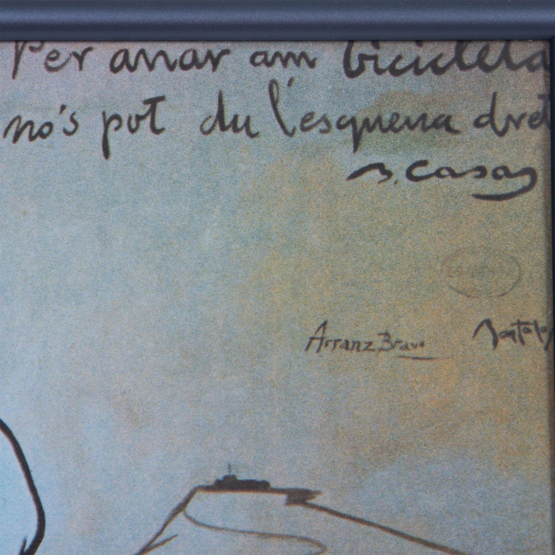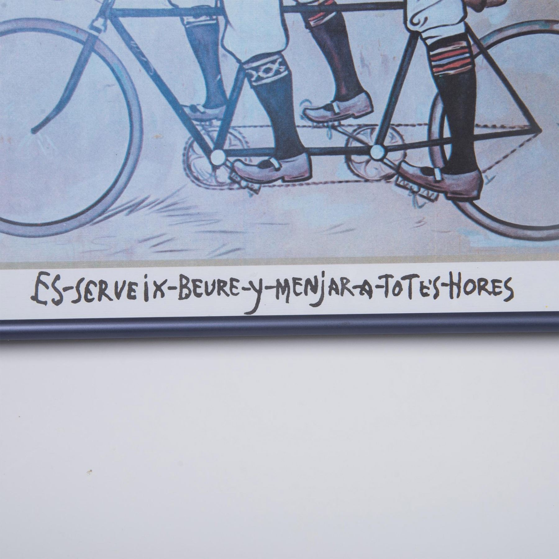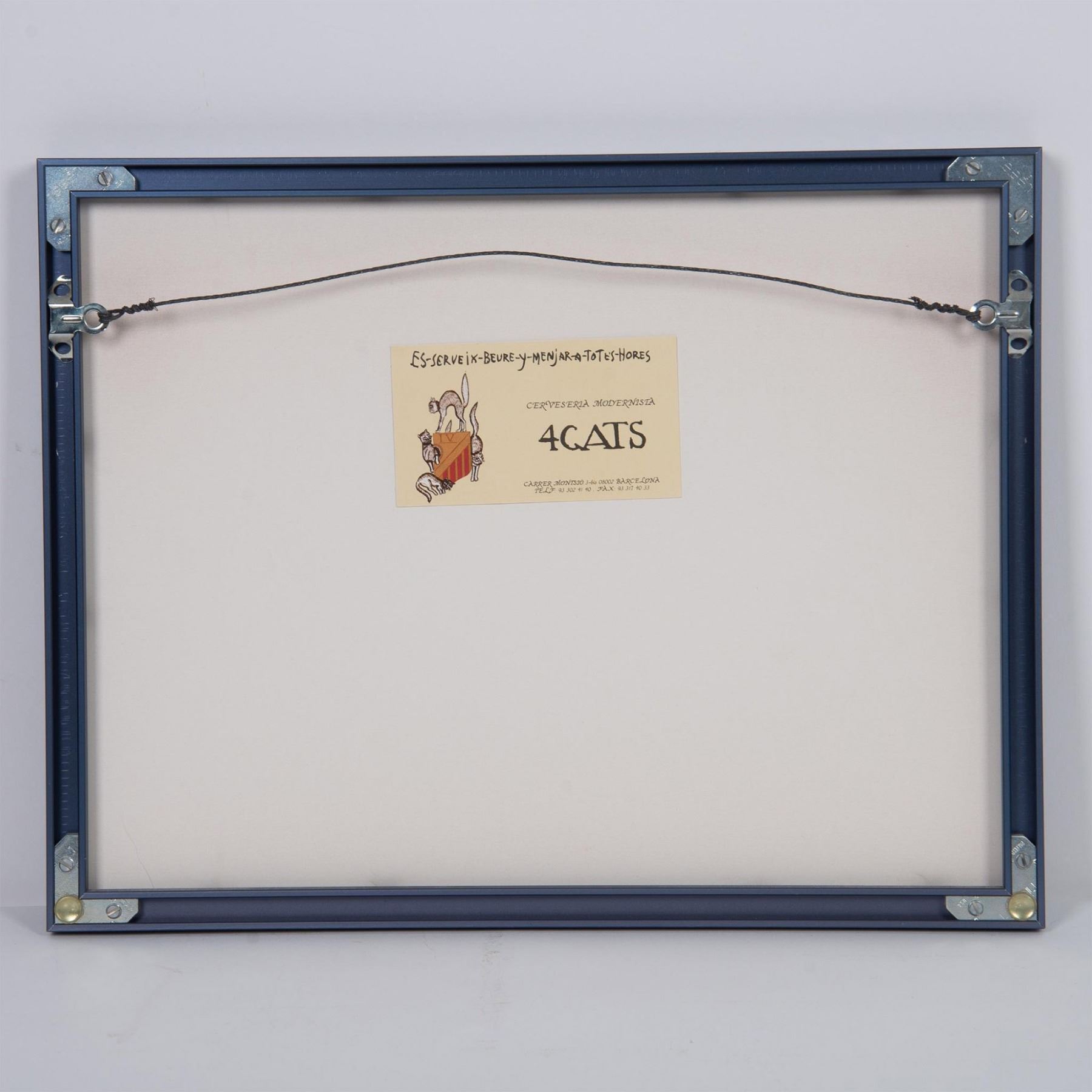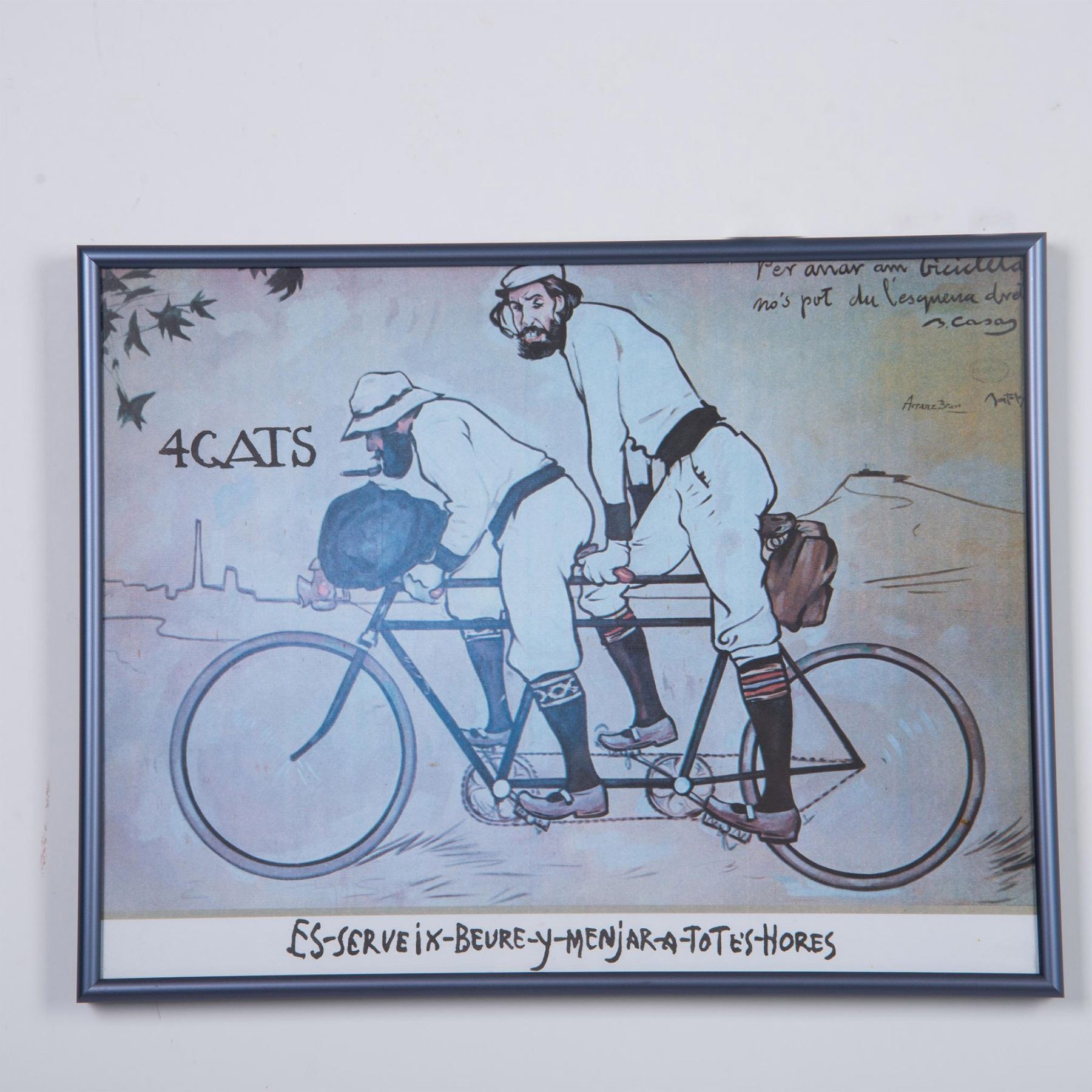 Ramon Casas and Pere Romeu on a Tandem is a color print poster on paper after Casas' 1897 original oil on canvas painted for the interior of the progressist Barcelona bar Els Quatre Gats (The Four Cats) that Pablo Picasso frequented. Includes card from the 4 Gats on verso. Housed in a metallic frame. Sight size: 14.75"L x 11.25"H. Frame dimensions: 15.50"L x 12.25"H x 1"W. Artwork can be unframed and rolled for shipment.